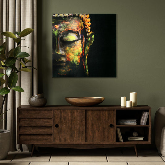 Colorful Buddha Face Glossy Lacquer Canvas Wall Art Print - 30" x 30"