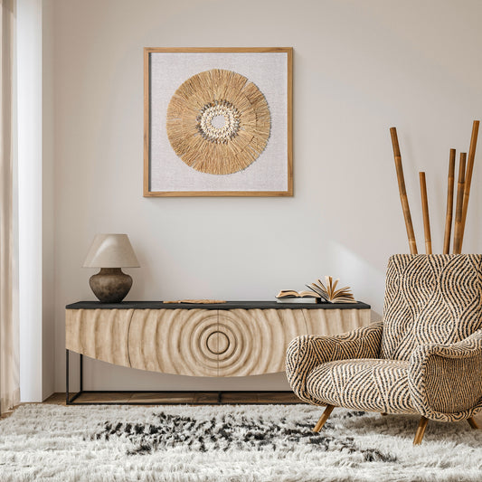 Boho Handmade Framed Straw Shell and Linen Wall Art Decor, 23.5"x23.5"