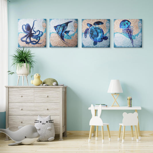 Beach Dark Blue Ocean Animal Angelfish Sea Turtle Octopus Jellyfish Canvas Art - 16" x 16"