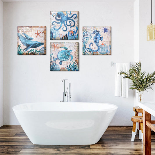 Nautical Beach Themed Seahorse Whales Sea Turtle Octopus Ocean Canvas Art - 20" x 20"