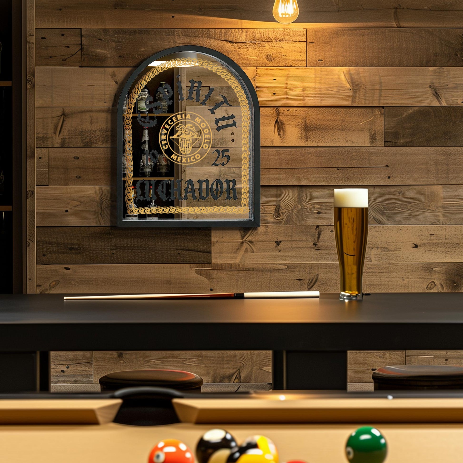Immerse yourself in the bold spirit of the Modelo Espiritu Luchador 1925 Printed Framed Mirror. This exquisite piece not only decorates your home bar but also infuses it with the valor and tradition of the legendary Luchadores. Designed for the modern gentleman who values heritage and sophistication, it's a testament to timeless bravery encapsulated within an elegant home accent.