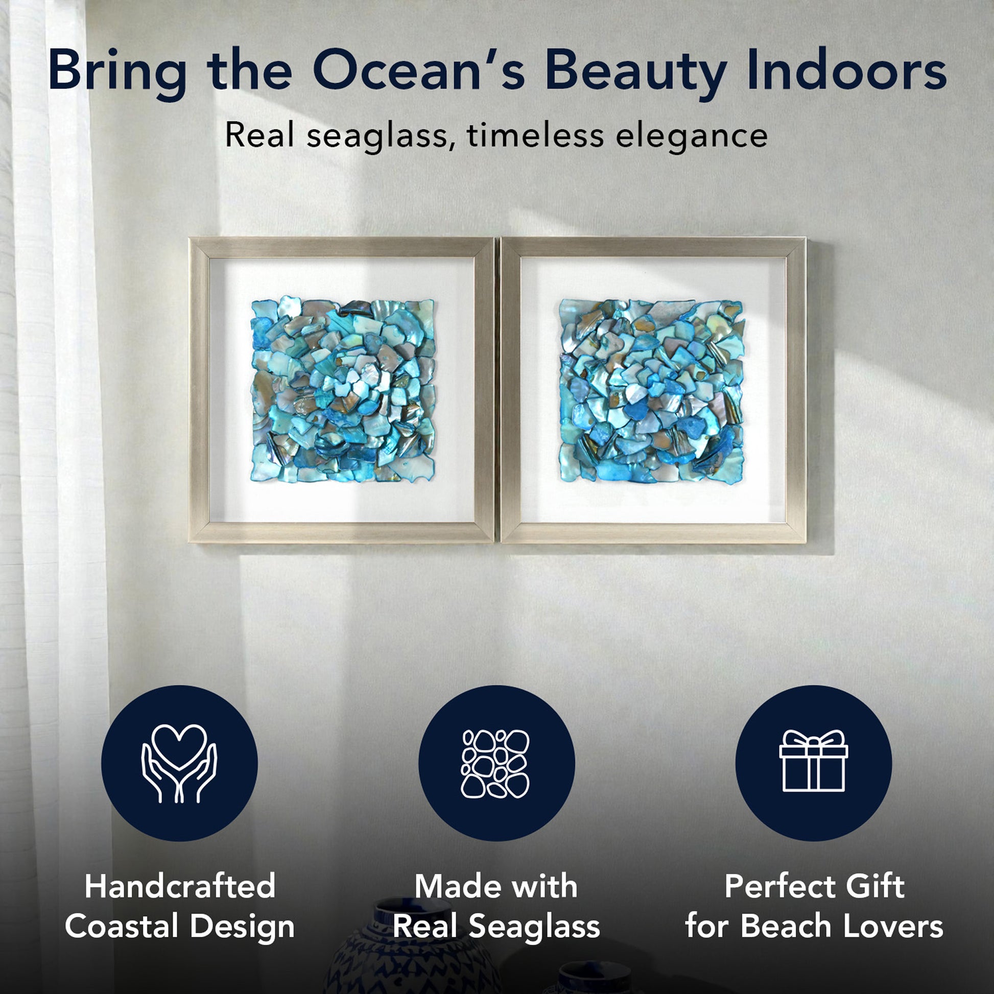 - BREATHTAKING COASTAL SHIMMER & TEXTURE - Crafted with polished sea glass & the look of mother-of-pearl fragments in radiant aqua, teal, turquoise tones that shift with light; adds organic texture and oceanic depth to any room decor.