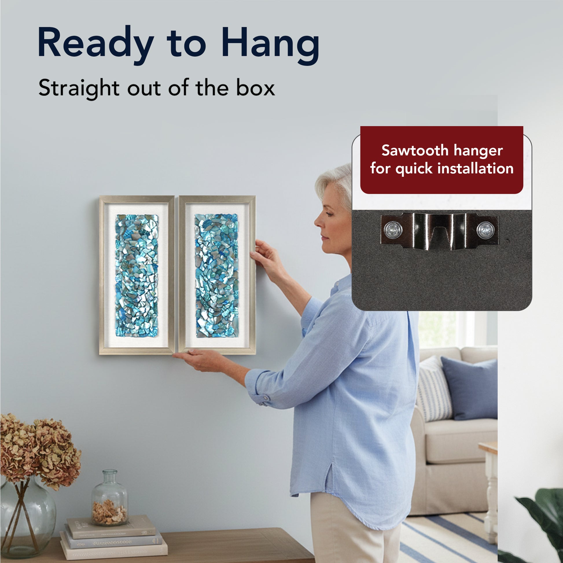 Turn your walls into a serene coastal retreat with this exquisite 2-piece Sea Glass Shadowbox Set from American Art Decor. Each piece showcases a hand-assembled rectangle mosaic of iridescent aqua, teal, and turquoise sea glass & mother-of-pearl fragments, set against an white linen backing and framed in champagne with a brushed finish. The concentric, rectangle pattern evokes shells and ocean textures, bringing natural, handcrafted shell art into your decor.Perfect for those seeking coastal wall art, beach house decor, or simply adding a splash of ocean color to living room, bedroom, hallway or home office spaces. The durable glass front and solid frame offer protection, while the unique shapes and natural irregularities in the seashell & sea glass make every shadowbox one-of-a-kind.