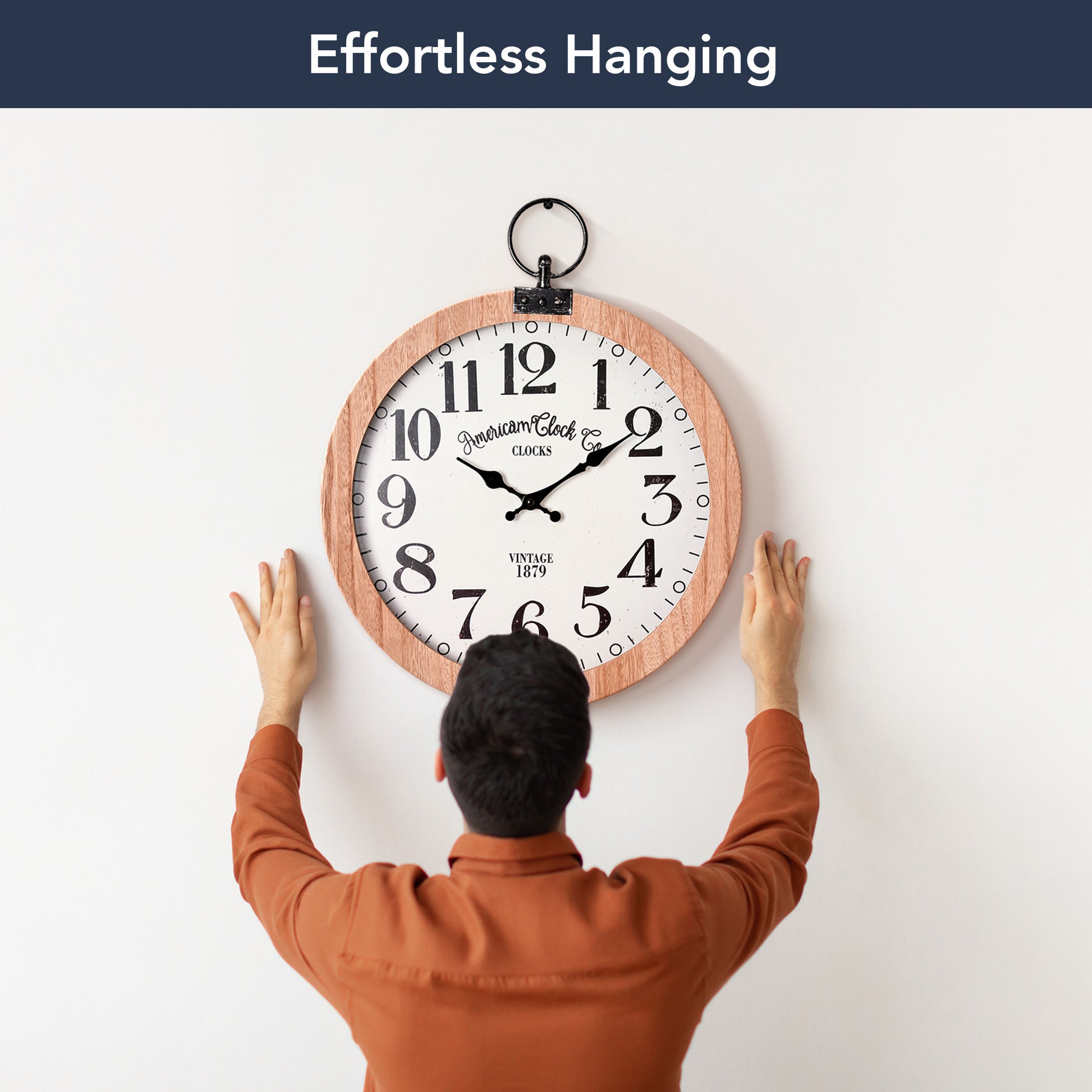 - VINTAGE APPEAL - Reminiscent of an antique pocket watch from the olden days, this enlarged version is made with real wood along with a large metal hanging ring that gives the timepiece a bit of a vintage flair. Even the encasement of the clock boasts a weathered and distressed treatment on the paper, tying the whole piece together and giving it an antique and vintage aesthetic.