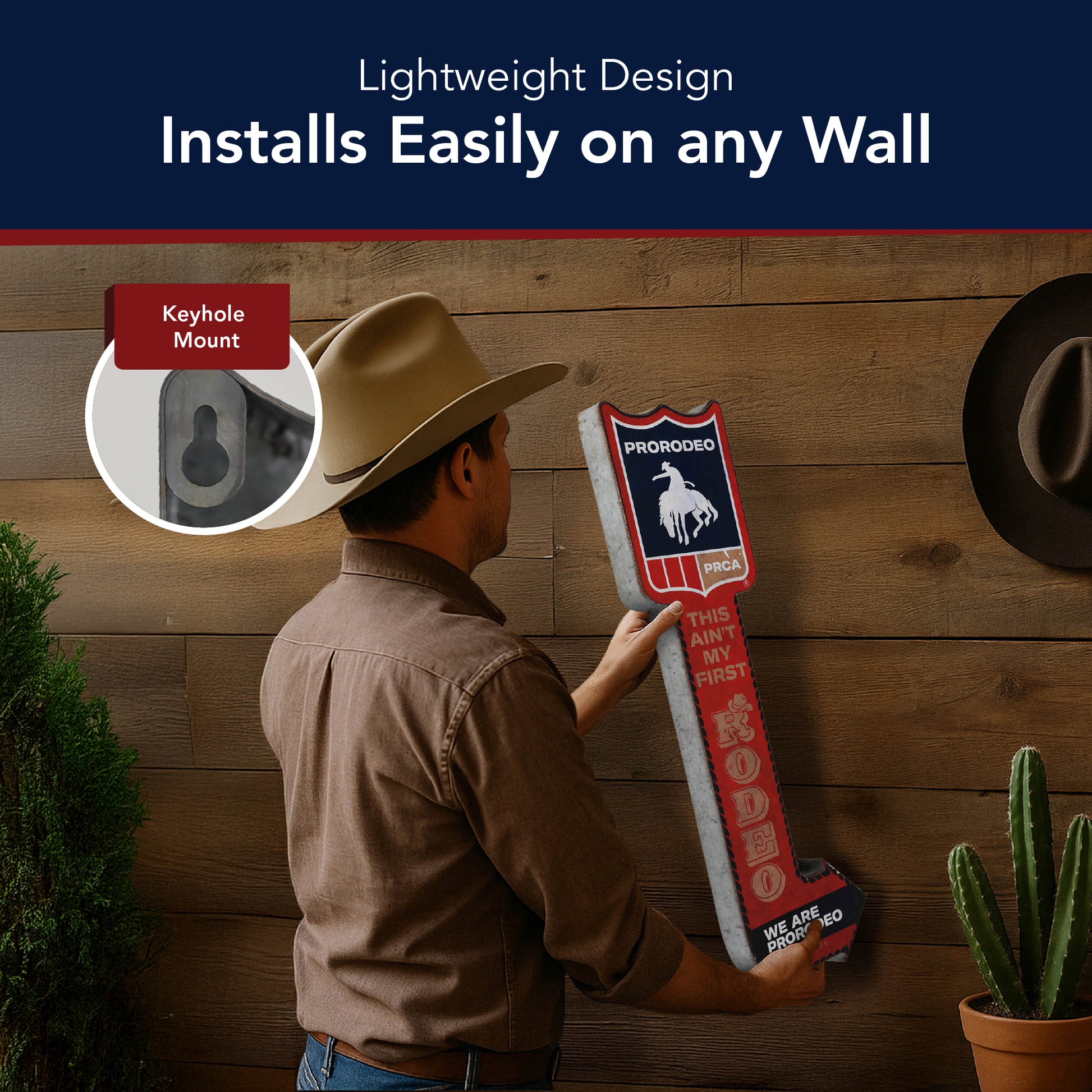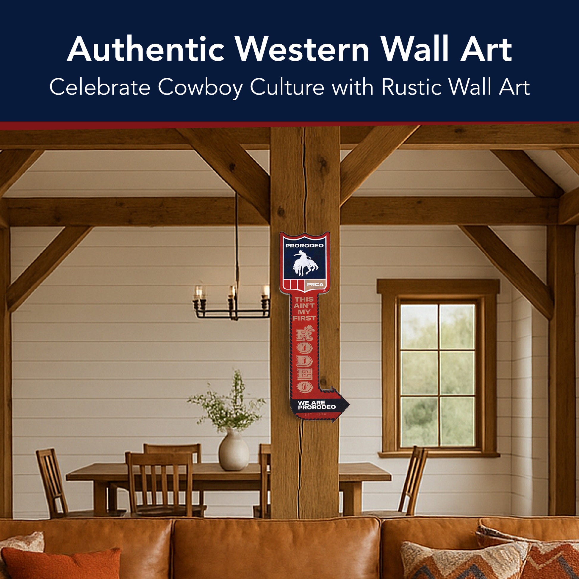 Infuse your space with the bold spirit of the American West using this arrow-shaped metal sign featuring the iconic phrase, "This Ain't My First Rodeo." Inspired by PRORODEO and the Professional Rodeo Cowboys Association (PRCA), the design features a rugged cowboy on a bucking horse, framed against a classic shield motif and distressed red arrow body.Placed alone or among other favorite decorations, this eye-catching piece brings true cowboy chic and western wall decor energy to rustic, country, or farmhouse-style homes. It evokes authenticity and tradition with the historic "We Are PRORODEO" and "EST. 1936" text, perfect for rodeo fans and western culture enthusiasts.