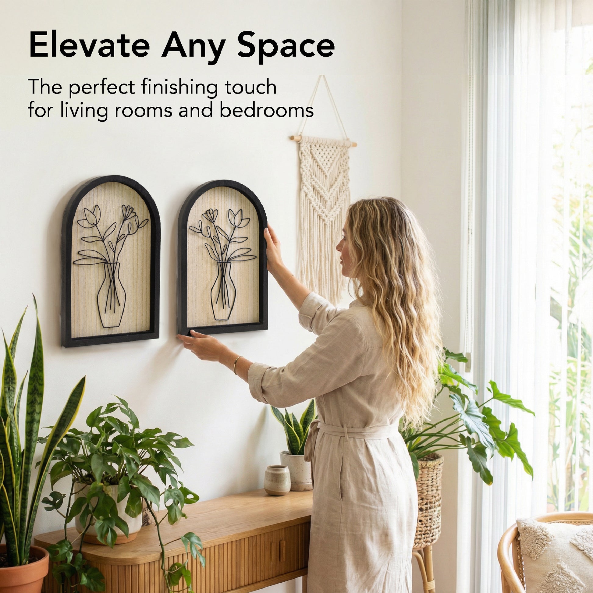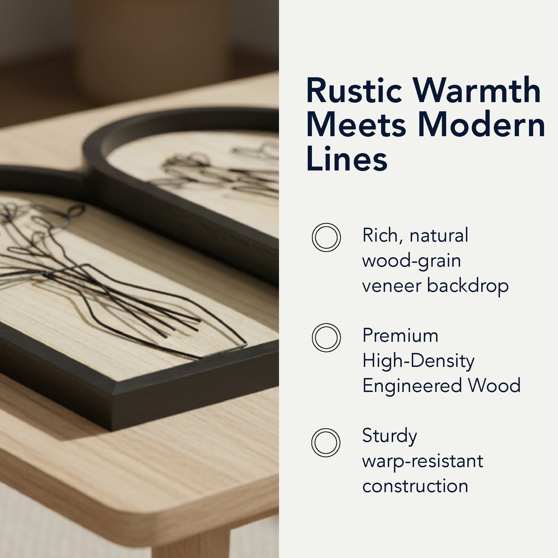 Each panel showcases a minimalist wire bouquet arranged within a softly arched frame, blending organic elements with clean modern lines. The natural veneer backdrop adds warmth and depth, while the black wire and frame create definition and visual interest, making this set ideal for farmhouse, modern, rustic, and Scandinavian-inspired interiors.