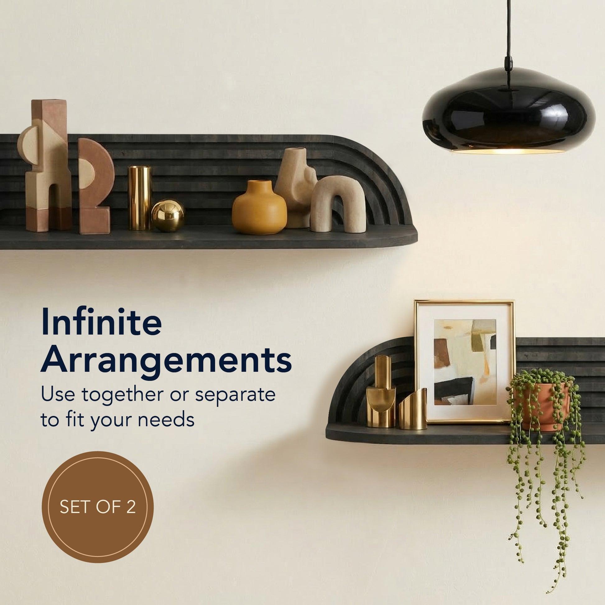 - SET OF 2 FLOATING WALL SHELVES - Includes two coordinating shelves for balanced wall styling or staggered arrangements, offering flexible display and storage options.