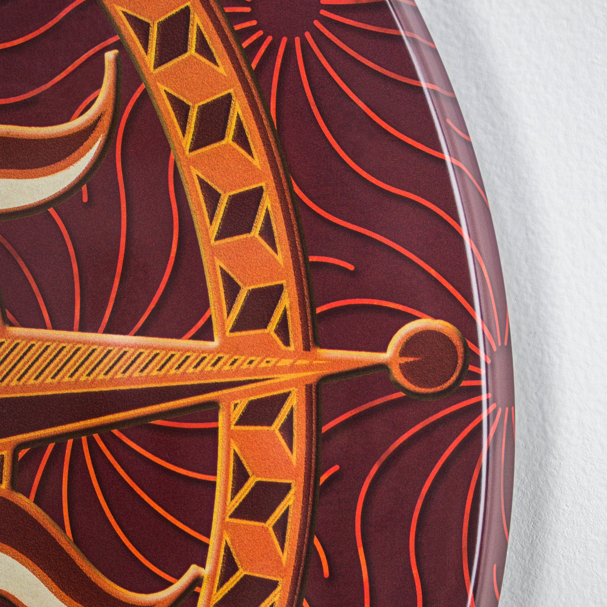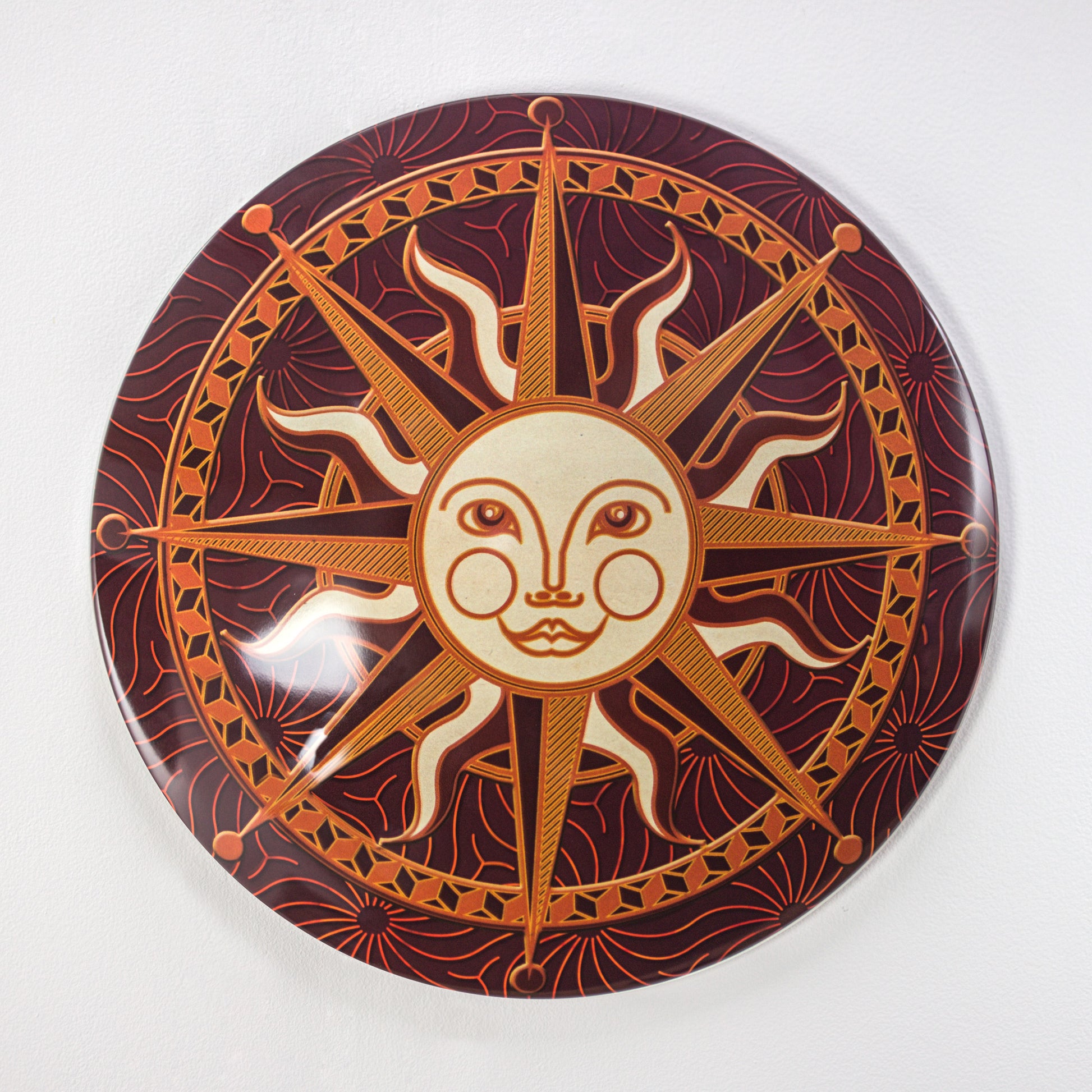 Brighten up your wall decor with this celestial sun dome-shaped metal sign that is detailed with intricate and unique design and a color palette of burgundy, orange, and cream.Made from lightweight metal that is printed upon with superior quality, this concave, dome-shaped metal sign also has depth and dimension, which makes it easier to notice and adds a bit of a dynamic flair to the piece.