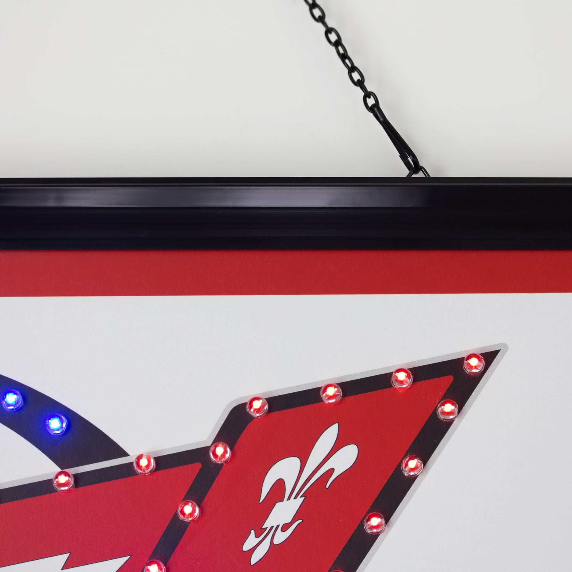 Admirers and collectors of all things Chevrolet will certainly need this framed light up LED sign to add to their collection. Stationary red, white and blue LED lights fill the perimeter of the logo and the two flags flanking the emblem.