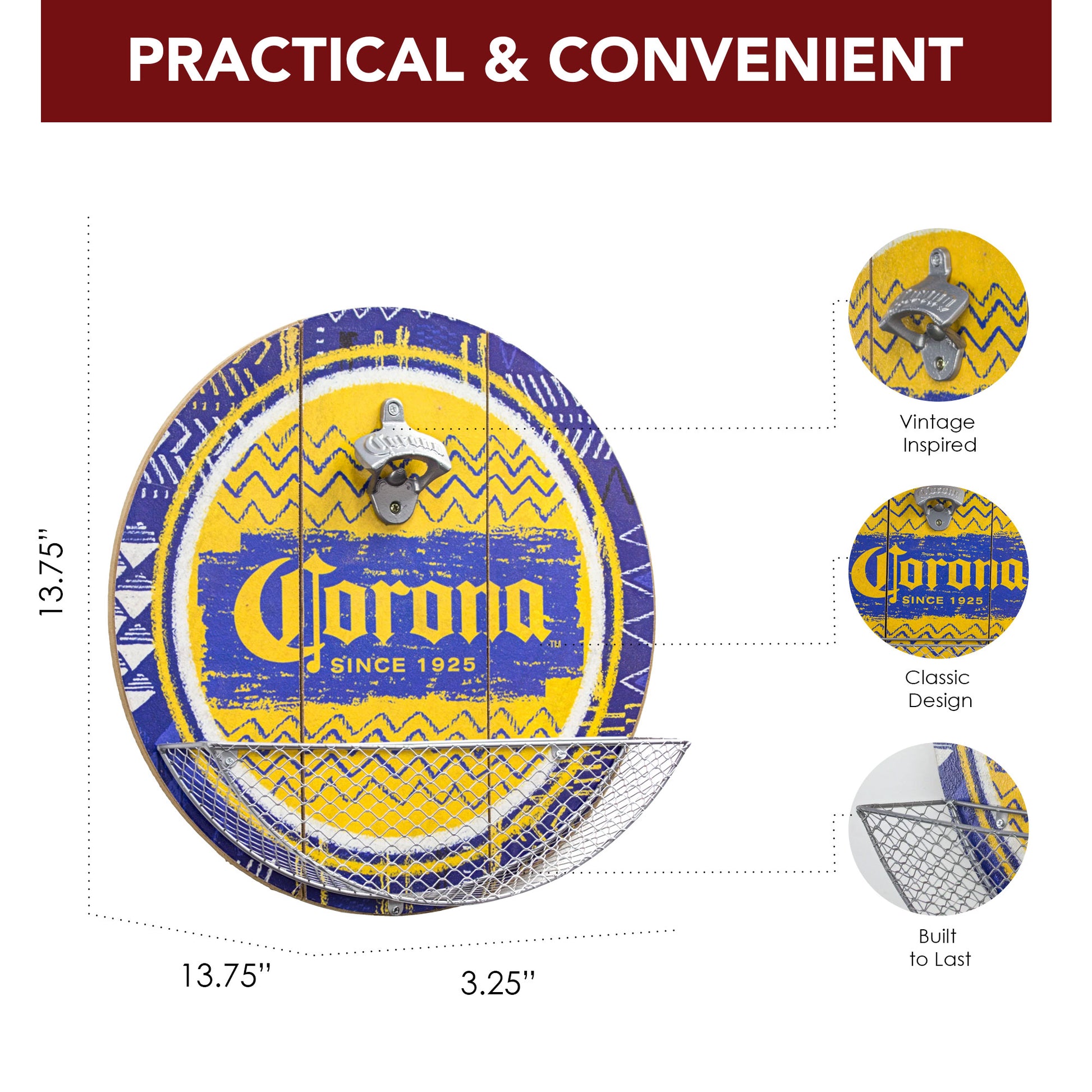 The Corona beer bottle opener and cap catcher is designed to serve as both functional and pleasing wall decor. With a wire mesh tray built in to catch bottle caps, you can skip clean up and get back to your party.