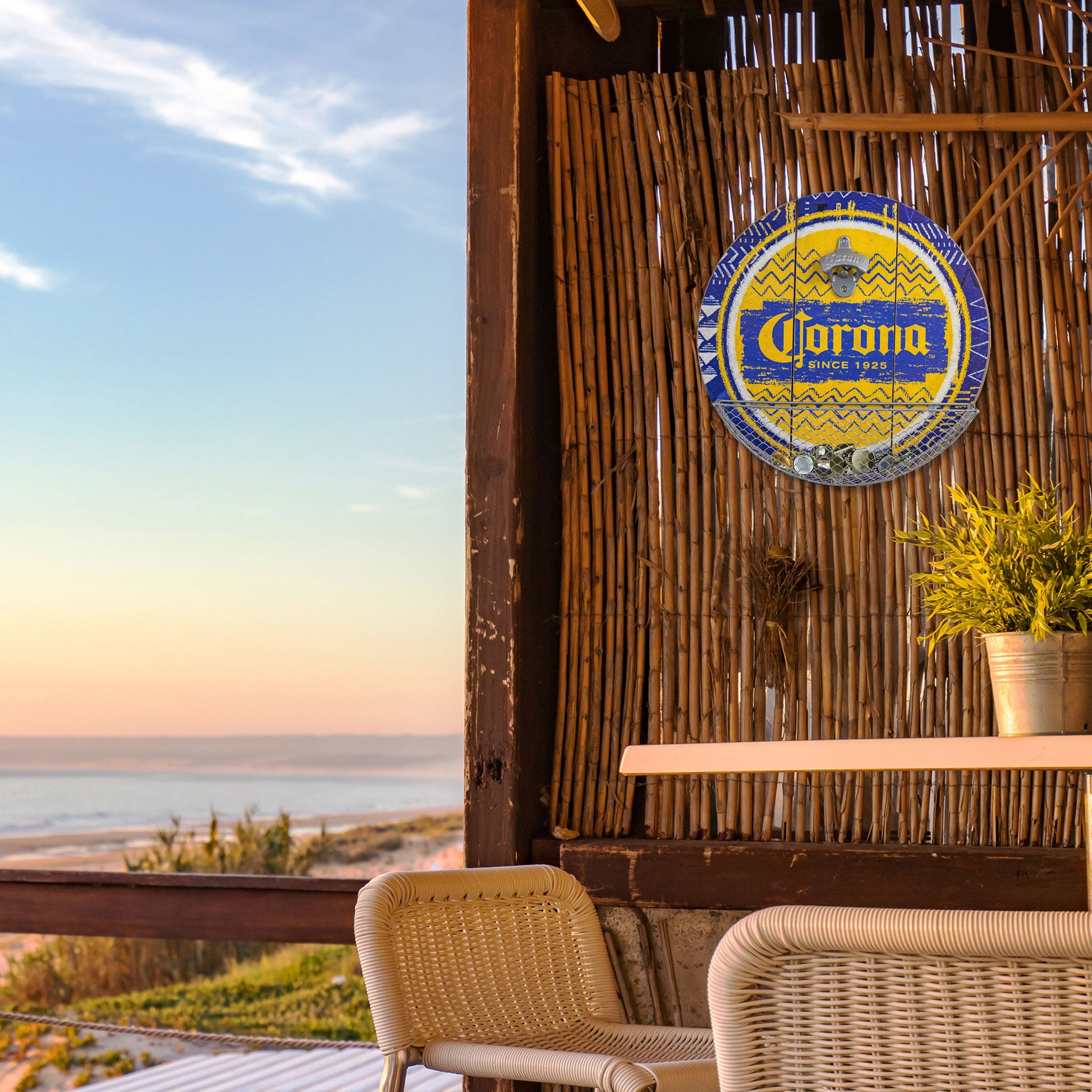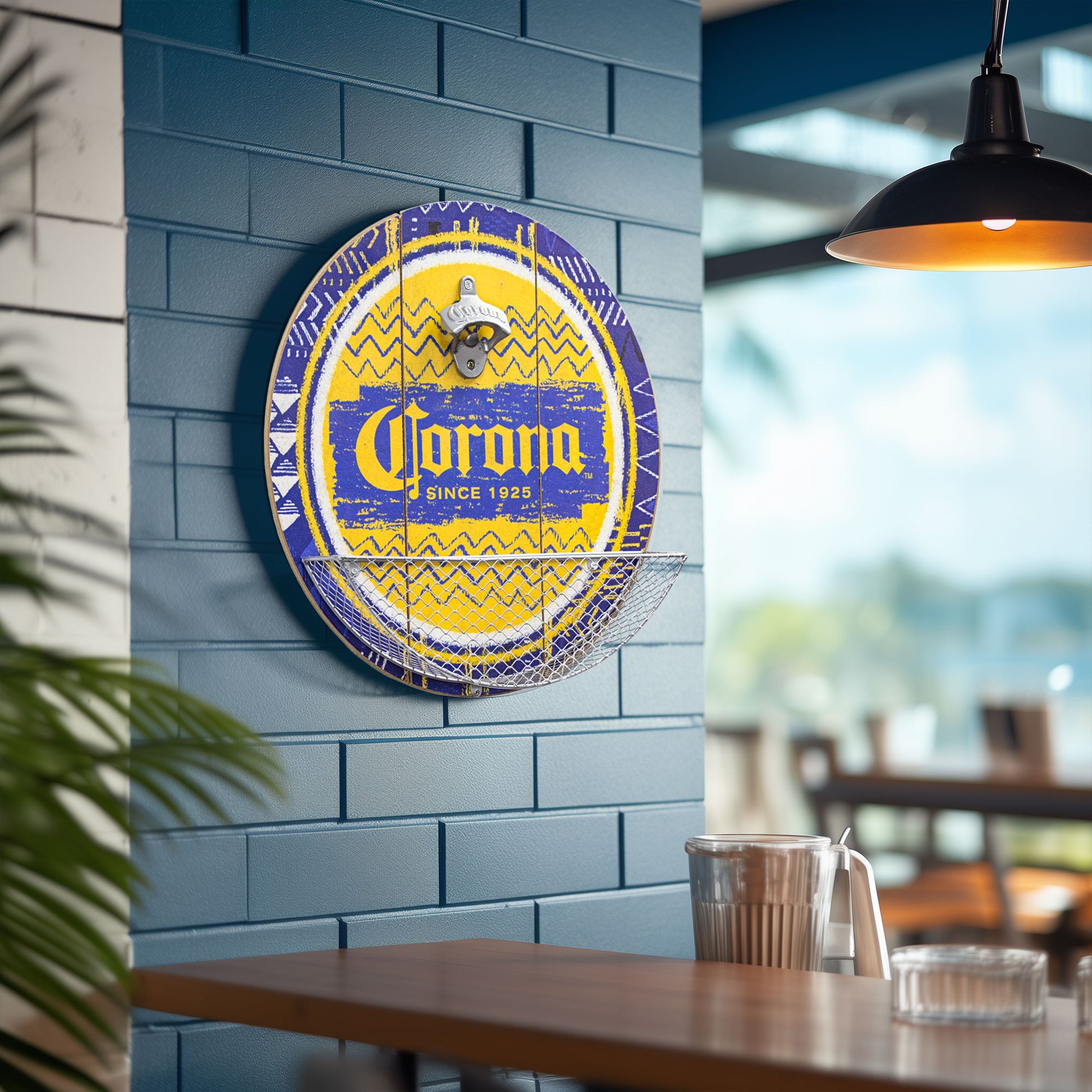 This wall decor piece features a punchy graphic version of the Corona logo rendered in its catchy yellow and blue color palette as well as a metal bottle opener that bares the Corona logo embossed within it. It's a must-have for any Corona drinker and/or Corona memorabilia collector out there.