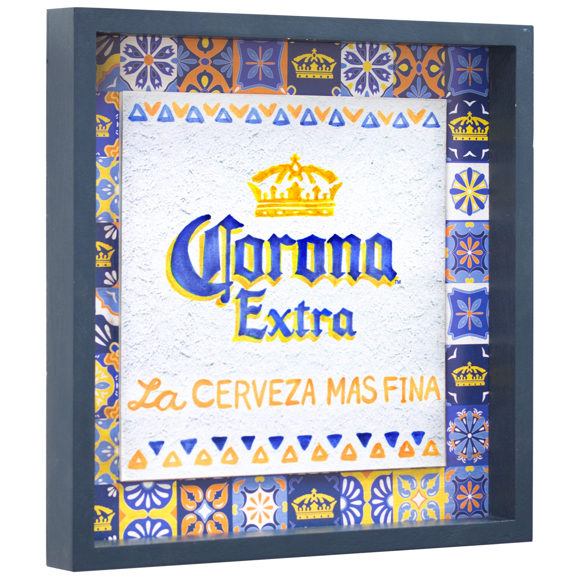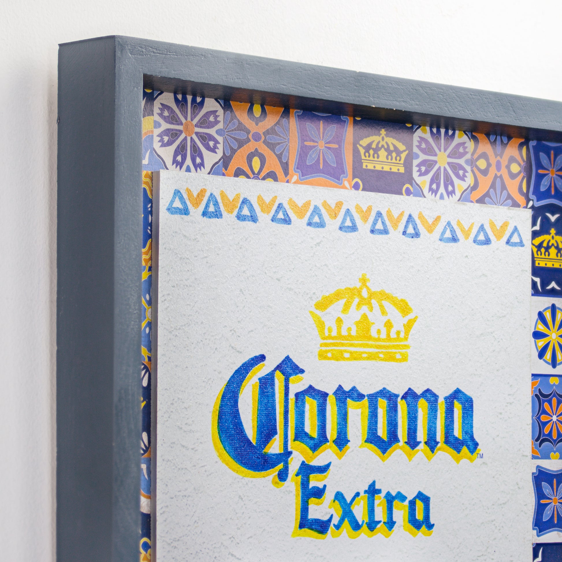 Set in a reversed box style frame that gives the artwork a bit more depth, this Corona Extra print is also printed on a raised MDF (medium-density fiberboard) background that gives the piece a three-dimensional quality to it. Plus, the unique finish on this dimensional component makes it look and feel like a hand-painted tile.
