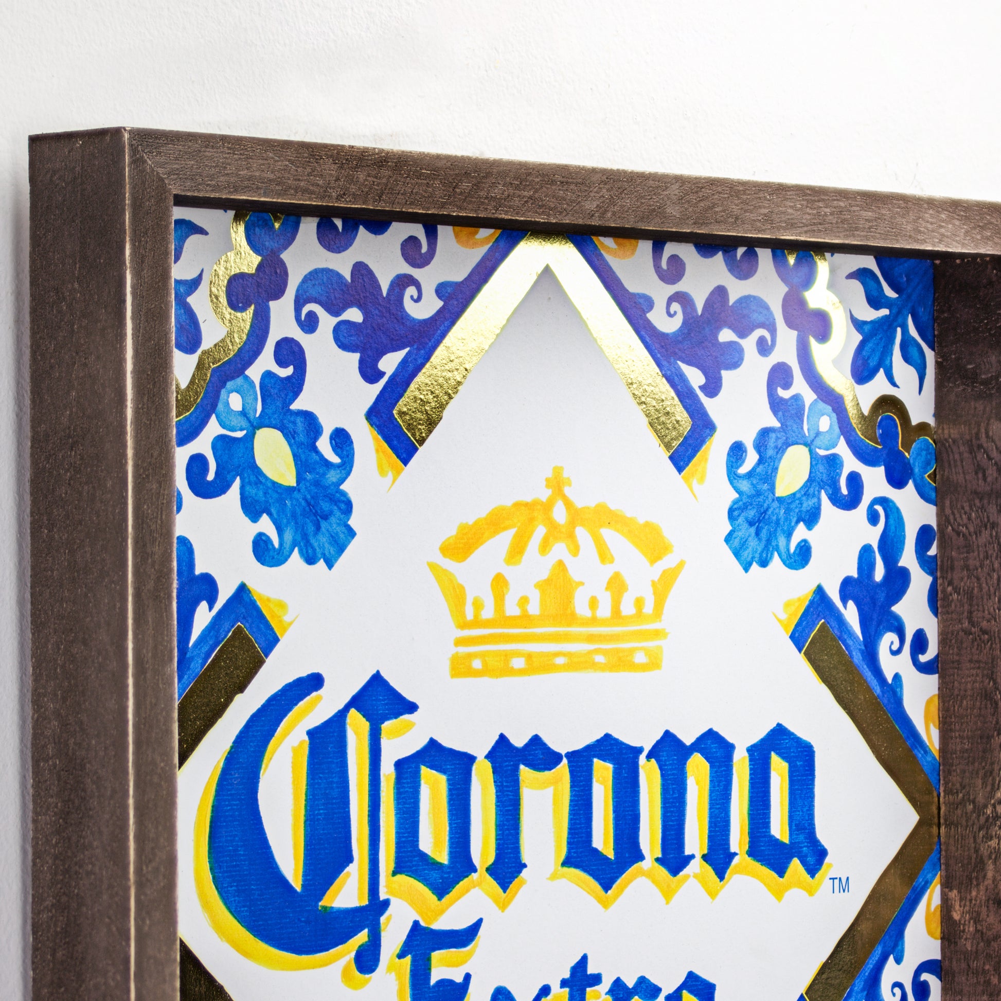 Set in a reversed box style frame that gives the artwork a bit more depth and dimension, this Corona Extra art print also features gold foil embellishments that add an attractive shine and style to the piece.