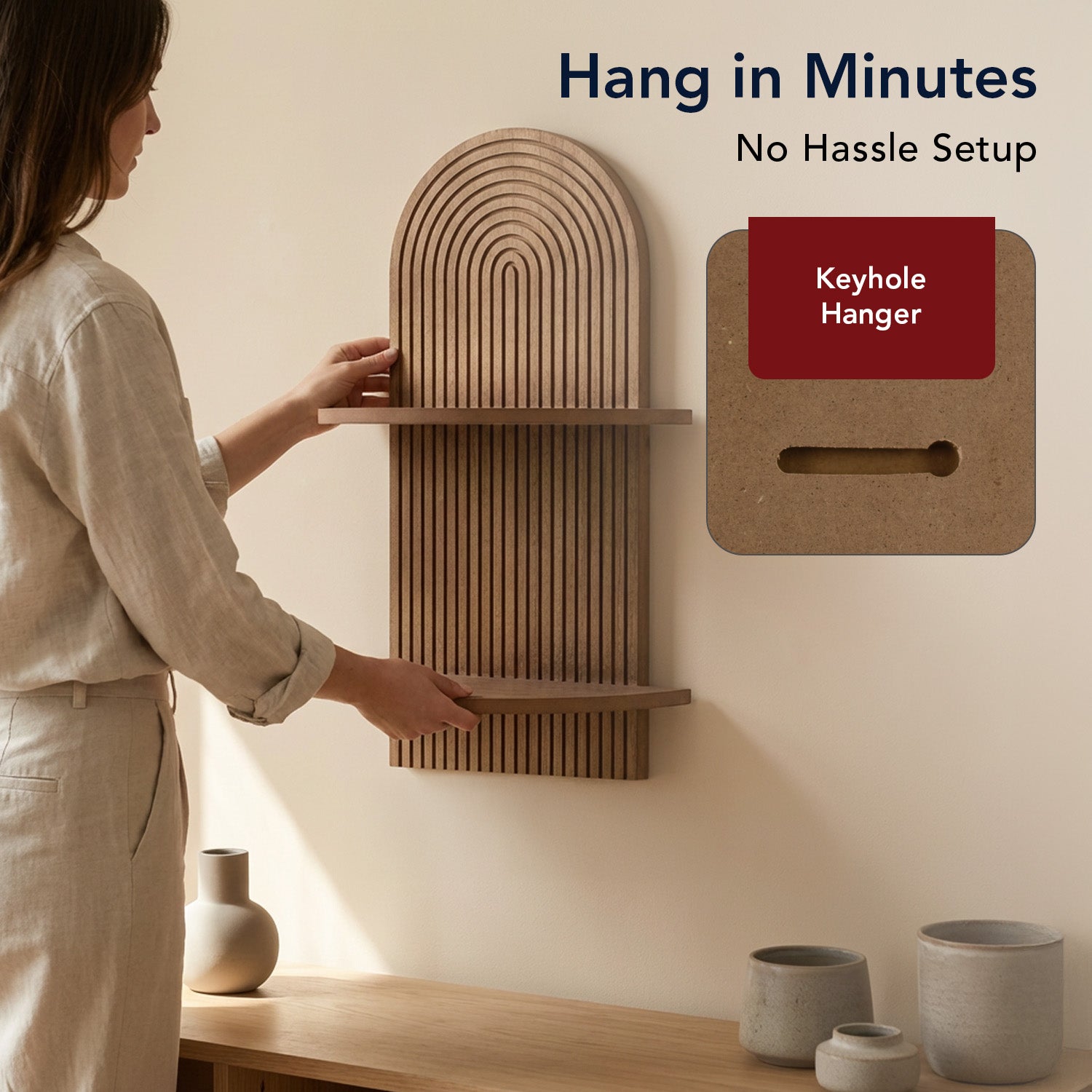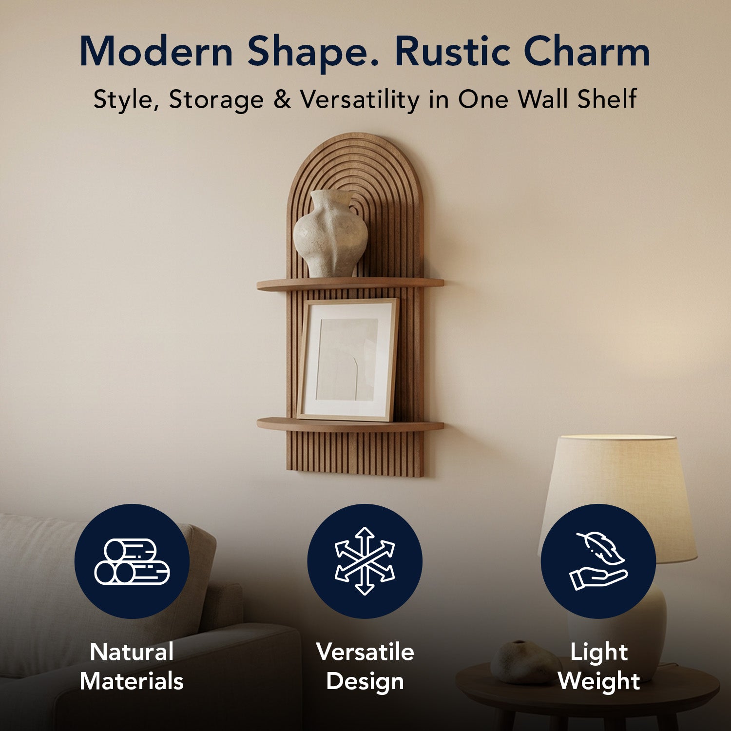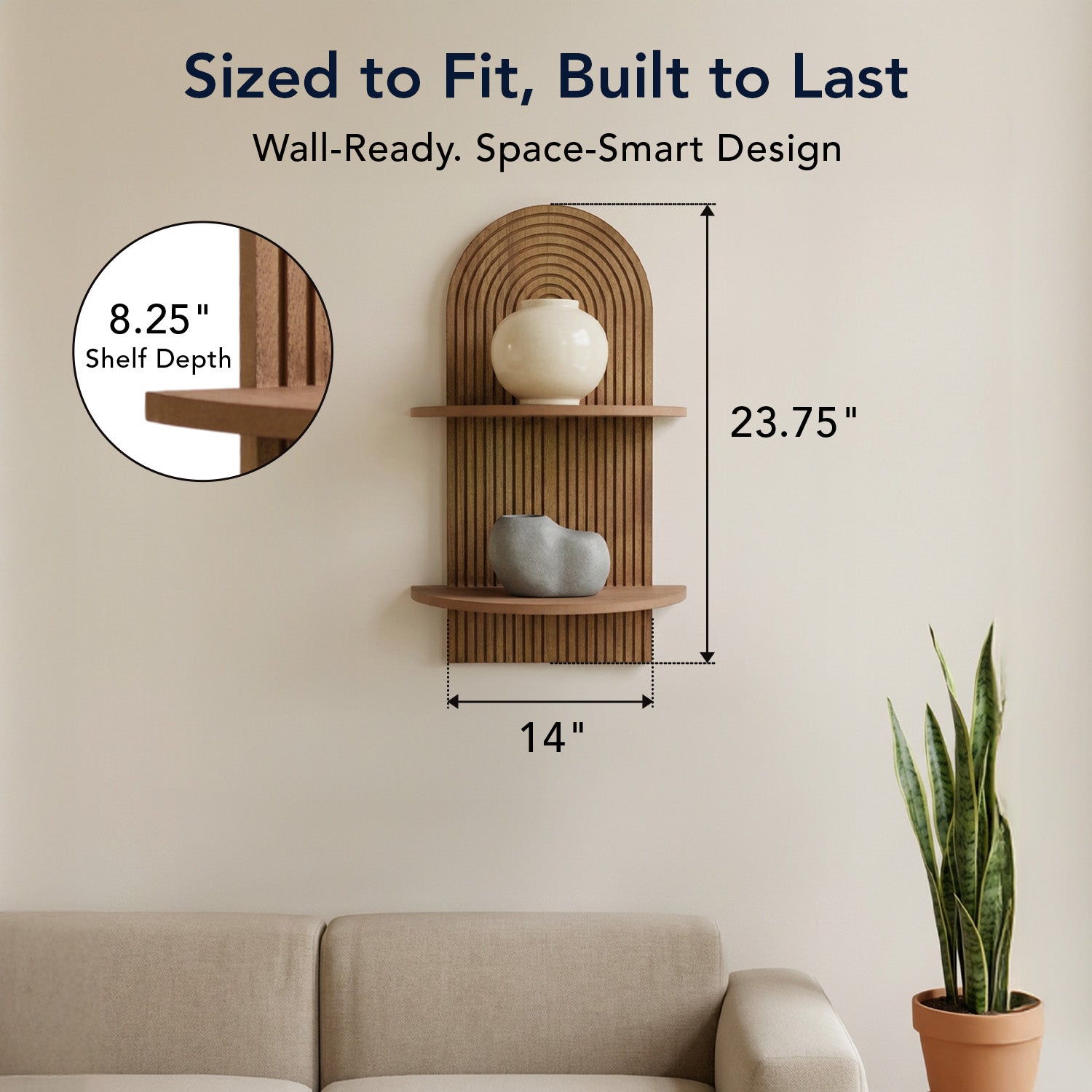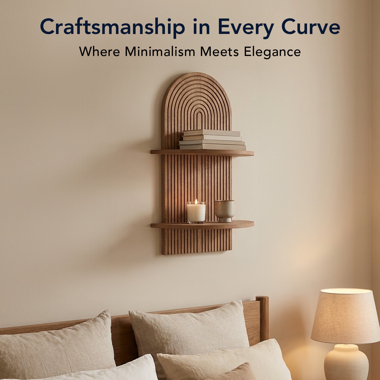 - BOHO ARCH STATEMENT SHELF - Turn blank walls into modern wall decor with a fluted, arched silhouette inspired by mid century modern decor and bohemian decor. The rich dark-walnut wood grain adds cozy home decor warmth and pairs with minimalist, Scandinavian, farmhouse chic, or vintage decor styles.