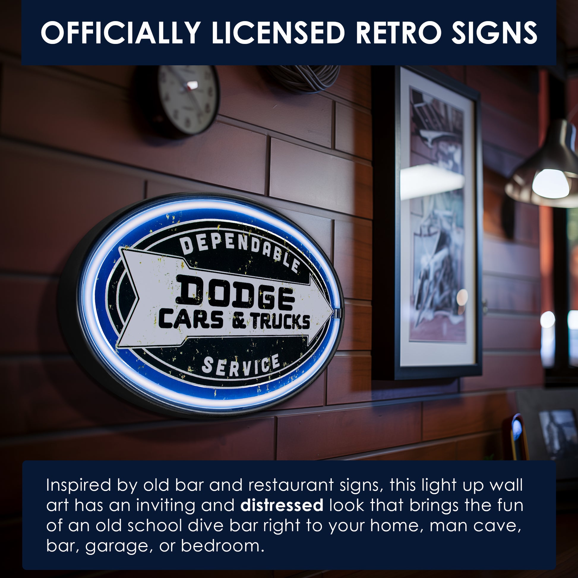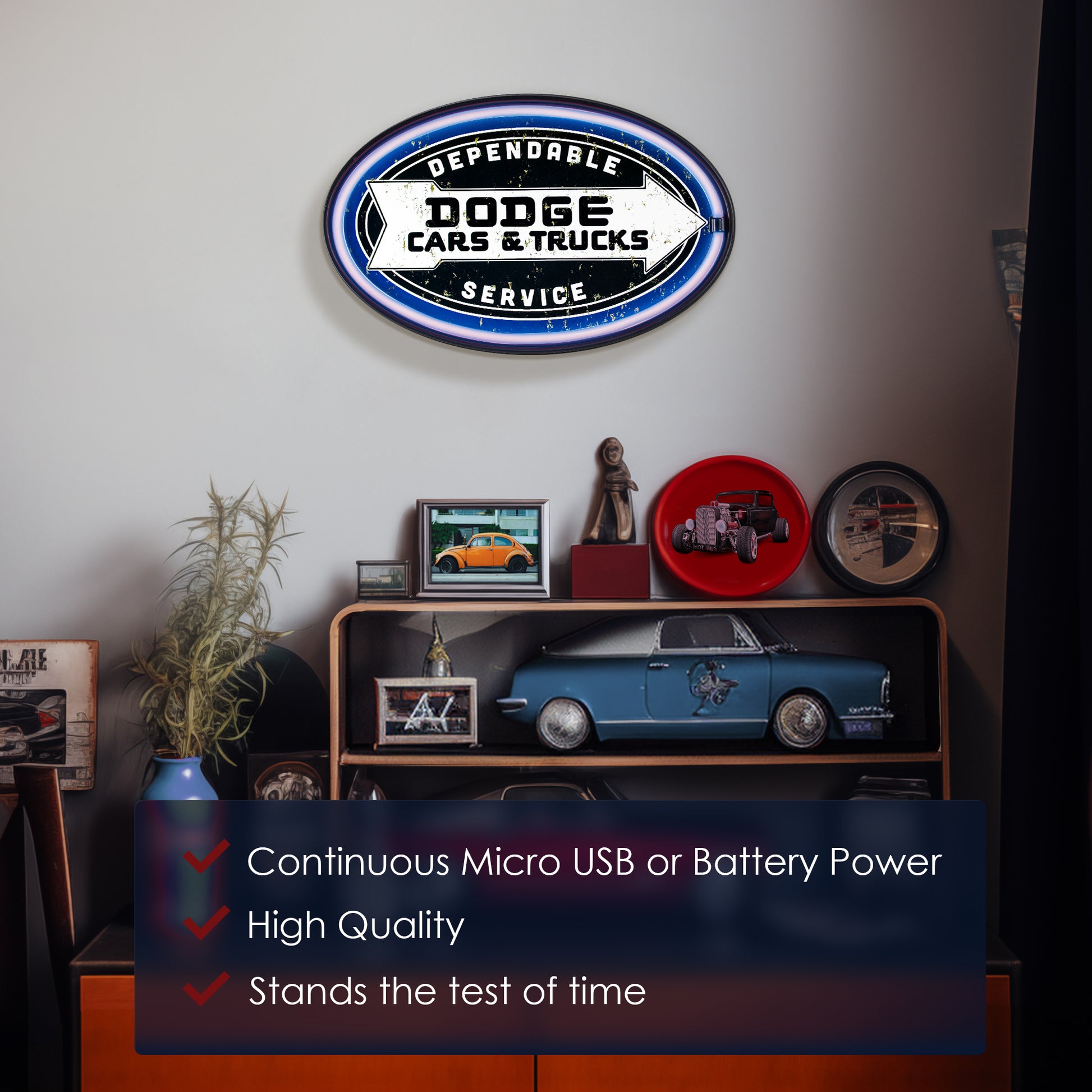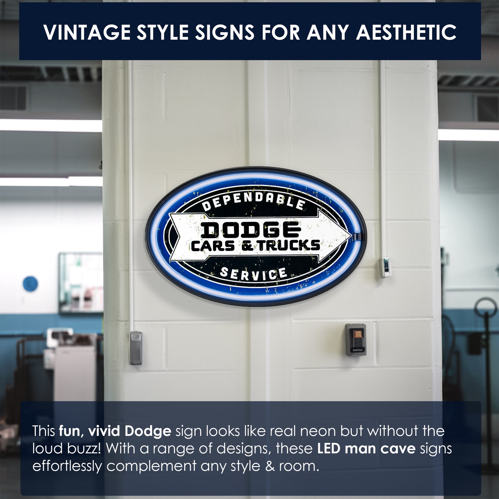 VINTAGE DODGE WALL DECOR – Any true Dodge Cars & Trucks fan is going to love this LED neon sign that offers a nostalgic nod to a staple American car company. This vintage-inspired sign features an older version of the Dodge logo with the phrase “Dependable Service sandwiching it to create a unique LED sign that makes a great gift for the Dodge memorabilia collector in your life.