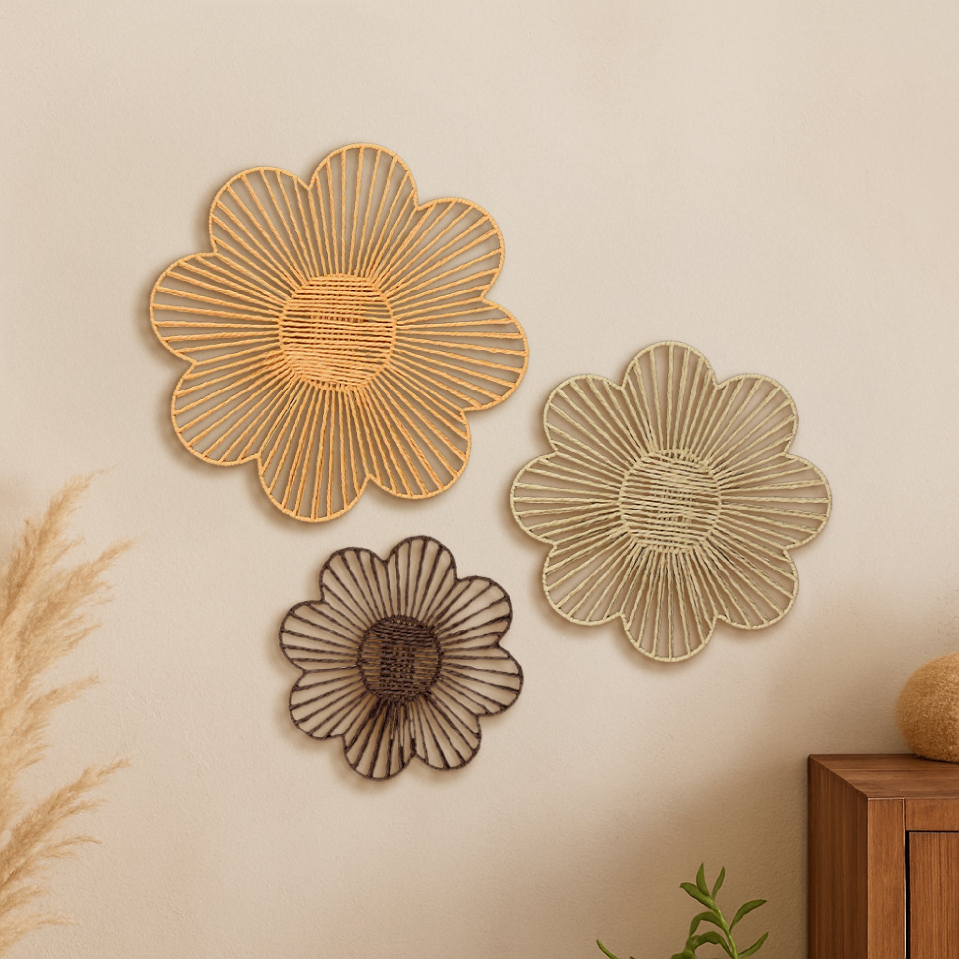Floral Paper Rope Wall Decor Set of 3 Assorted - Boho Wall Art, Farmhouse Basket Style