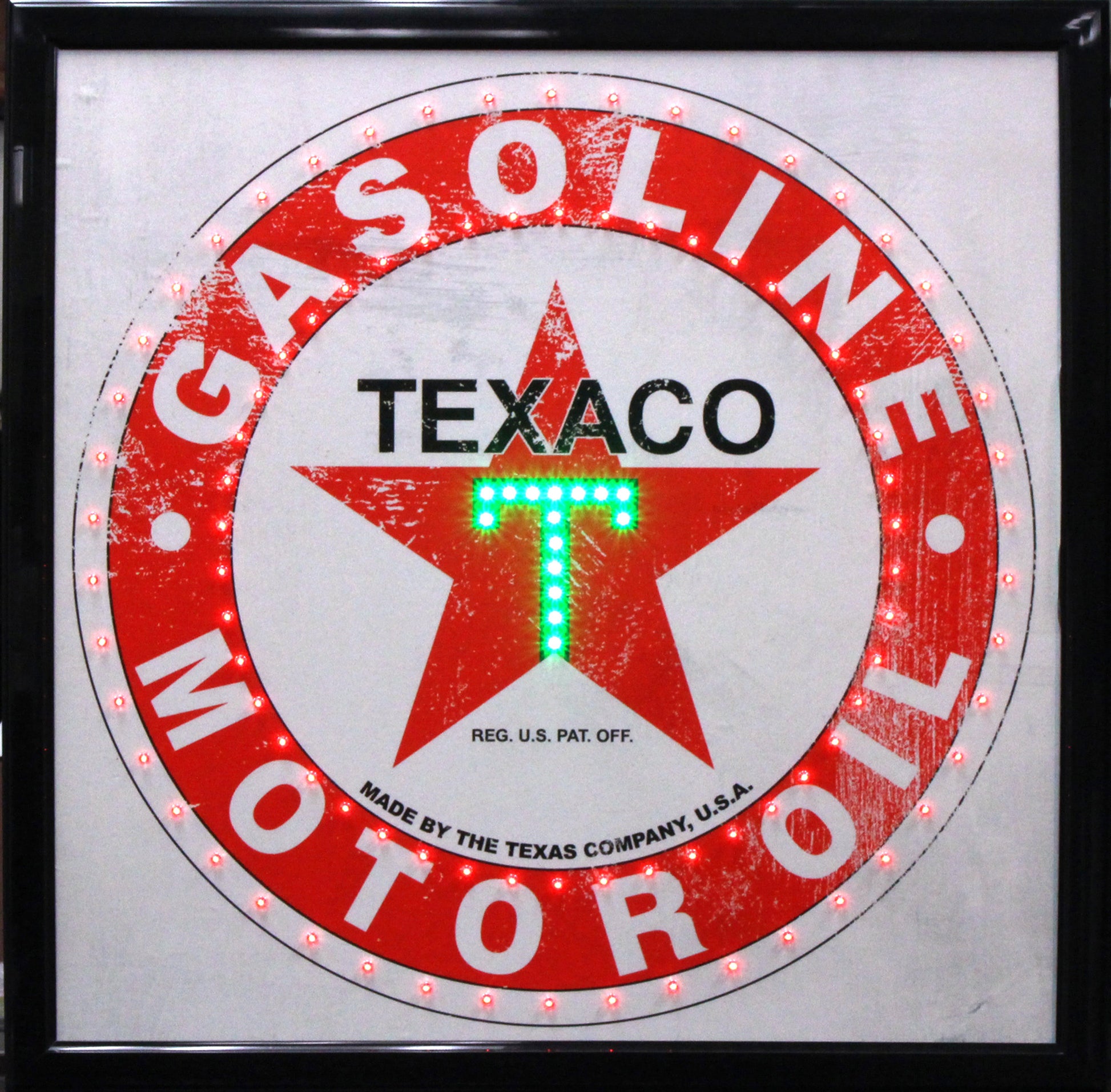 - Eye-catching - With its LED lights and vintage design, this Texaco sign provides the nostalgic charm of an old-fashioned gas station without the gasoline fumes. The iconic Texaco logo is highlighted by colorful blinking lights in the central T and circular borders.