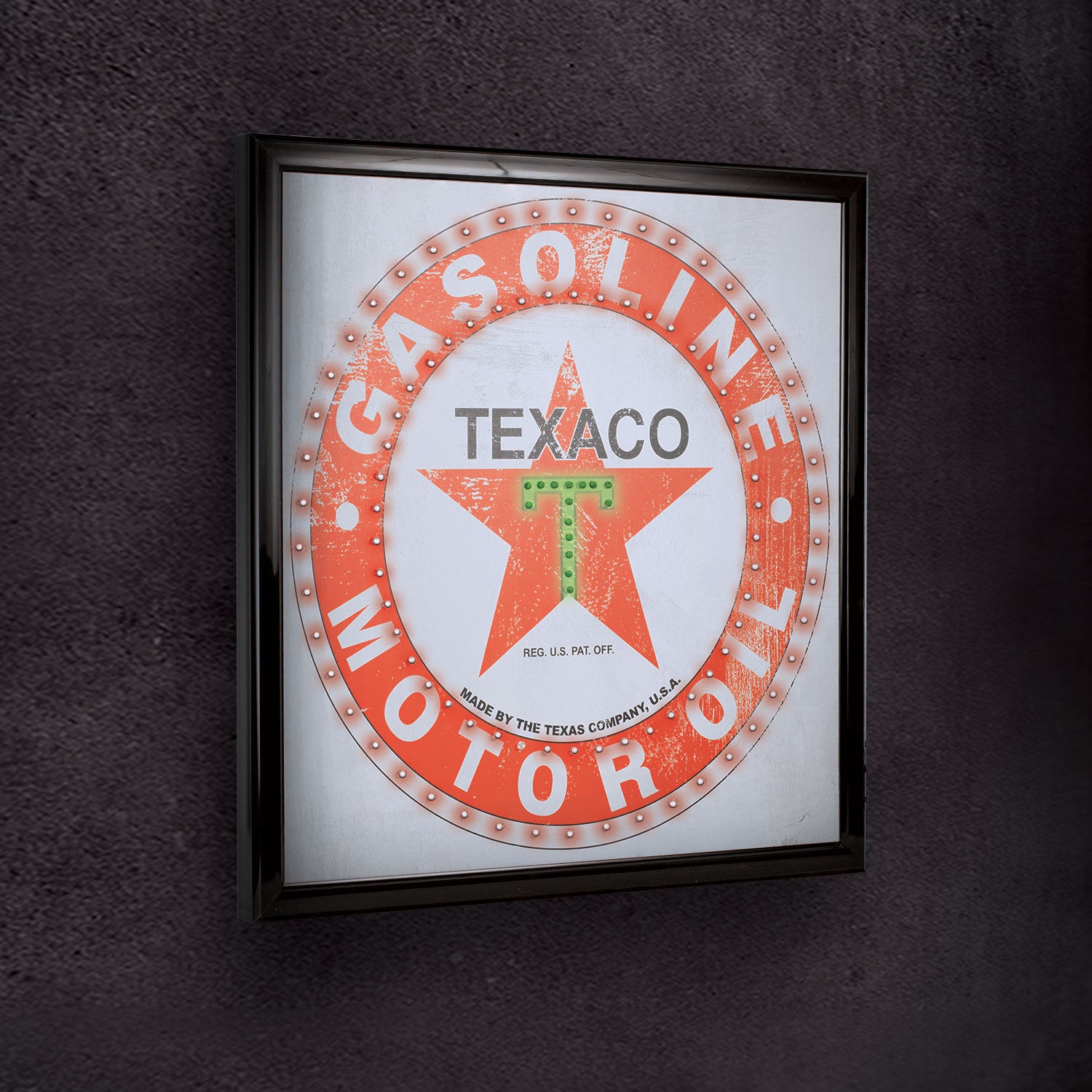 With its retro aesthetic of marquee lights and distressed imagery, the classic Texaco logo, and a striking LED pattern, this UL approved light-up wall art is sure to be a conversation starter.