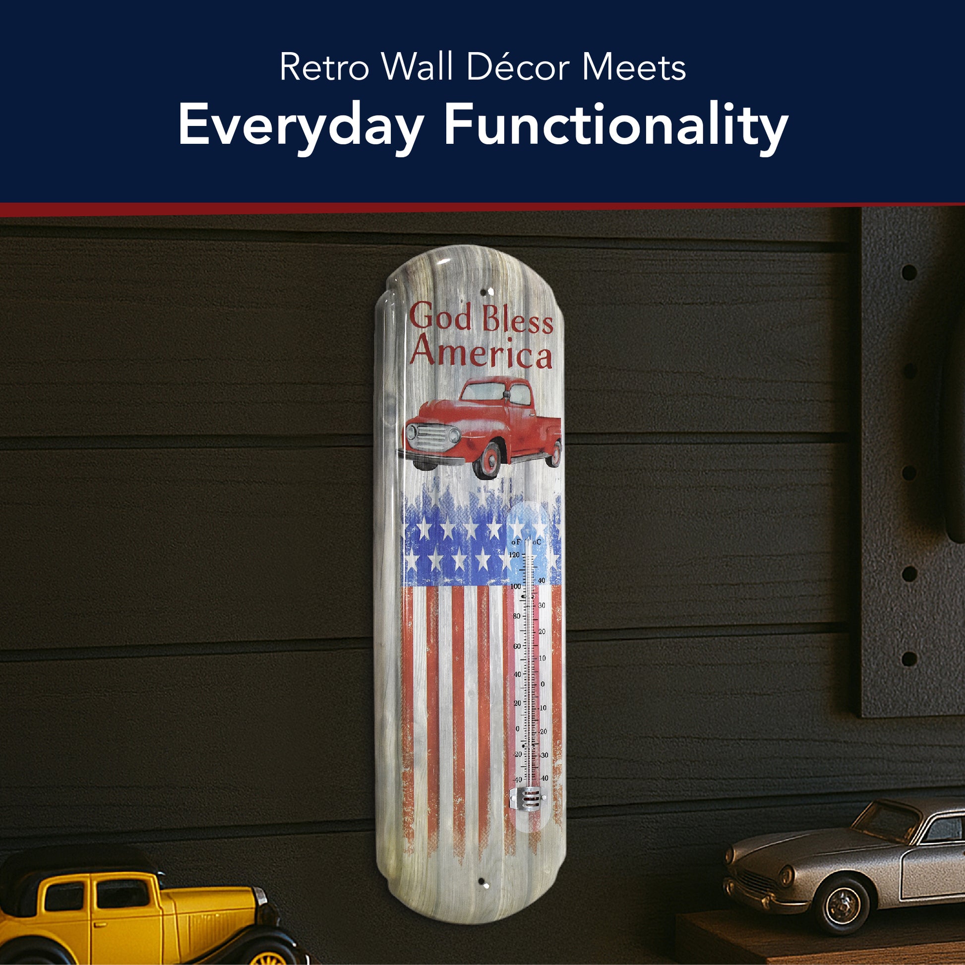 God Bless America Vintage Thermometer Wall Sign with Red Truck & Flag