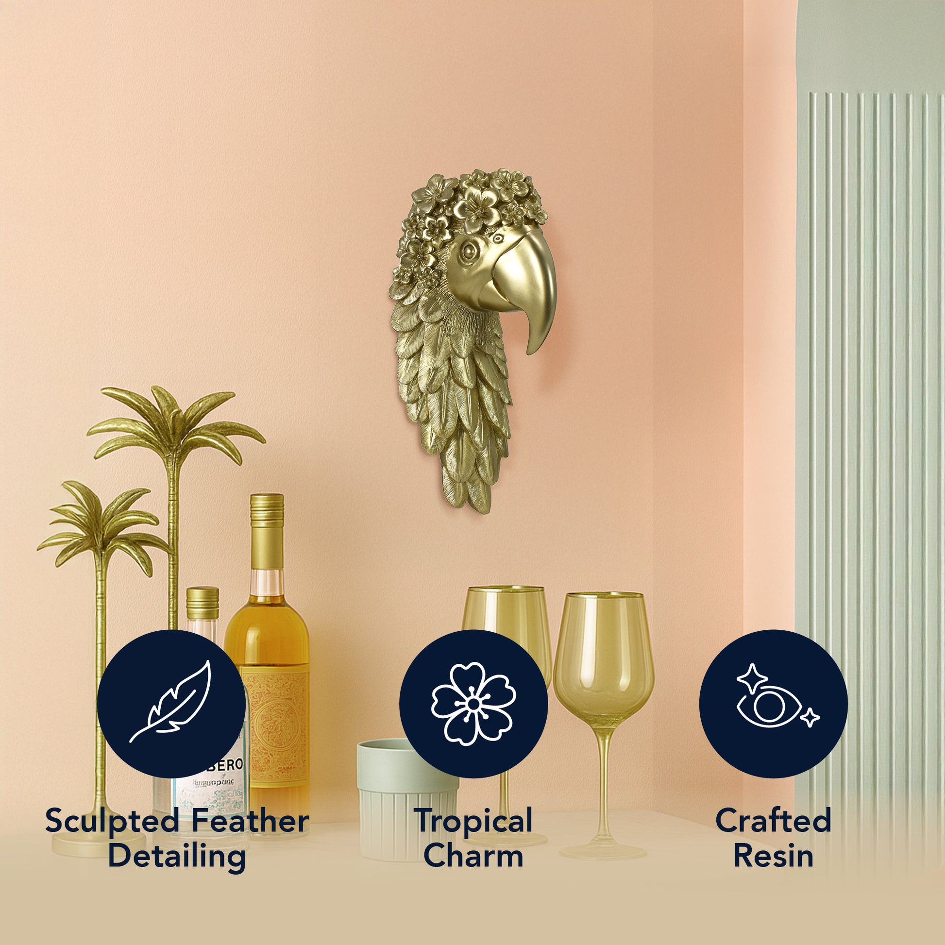 - DAZZLING LUXE GOLD ACCENT ELEVATES ANY WALL - The radiant semi gloss gold finish on this tropical parrot sculpture instantly transforms plain space into bold statement art, giving your wall decor a touch of luxury and opulence that draws eyes and complements any chic or modern aesthetic.