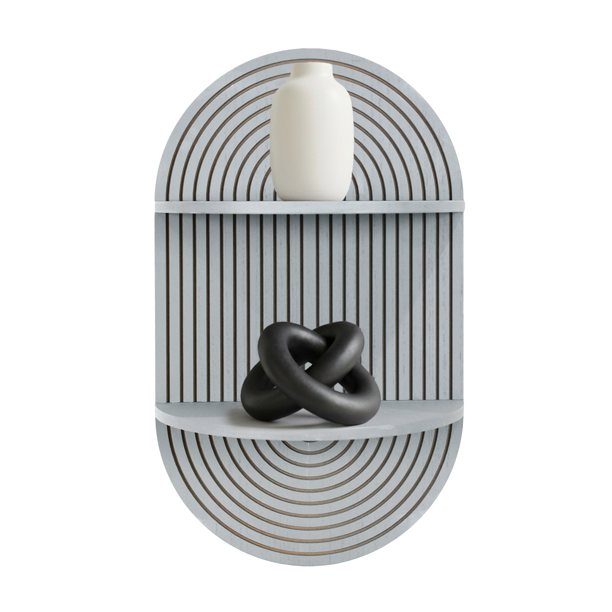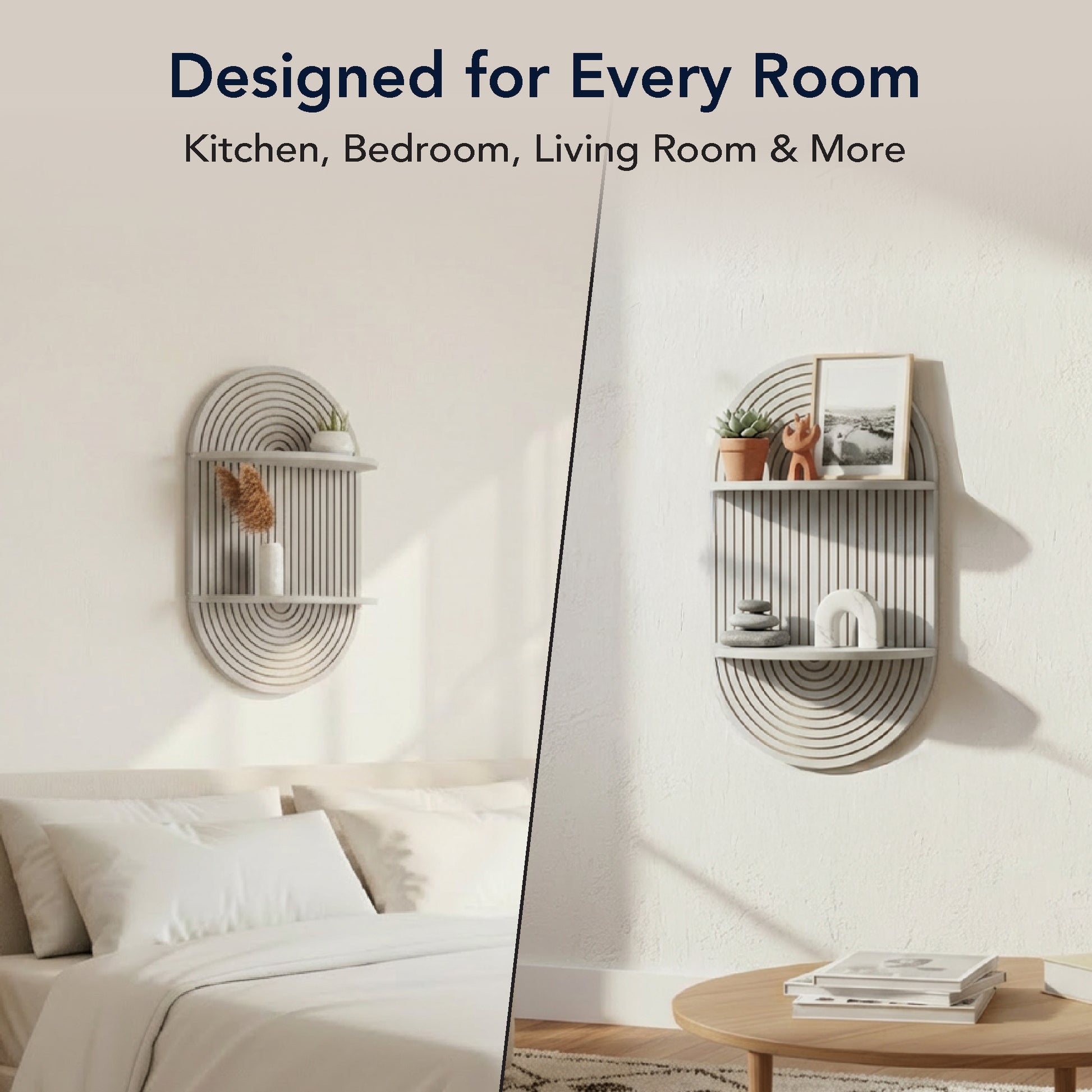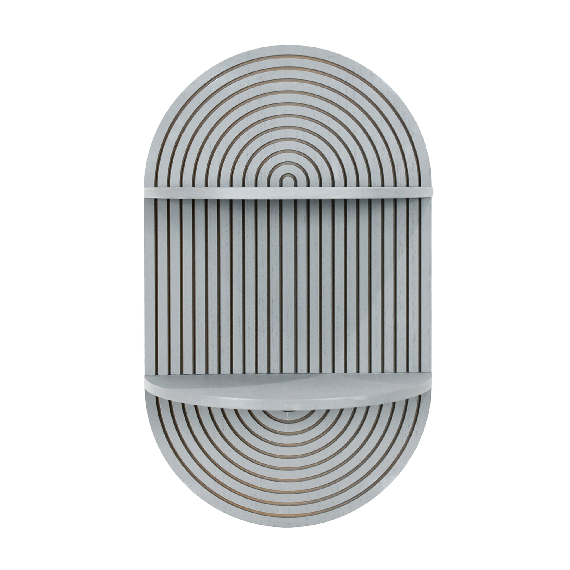 Refresh your room decor with the American Art Decor Grey Boho Arched Modular Carved Wall Shelf - a minimalist/boho wall shelf that looks like modern wall art and works like real organization and storage. The clean arched oval silhouette, carved rainbow-style grooves, and vertical fluted lines create a calming focal point that fits right into modern farmhouse decor, mid century modern decor, Scandinavian, or contemporary spaces. Two rounded lunar ledges give you practical floating shelves for wall styling without taking up floor space.