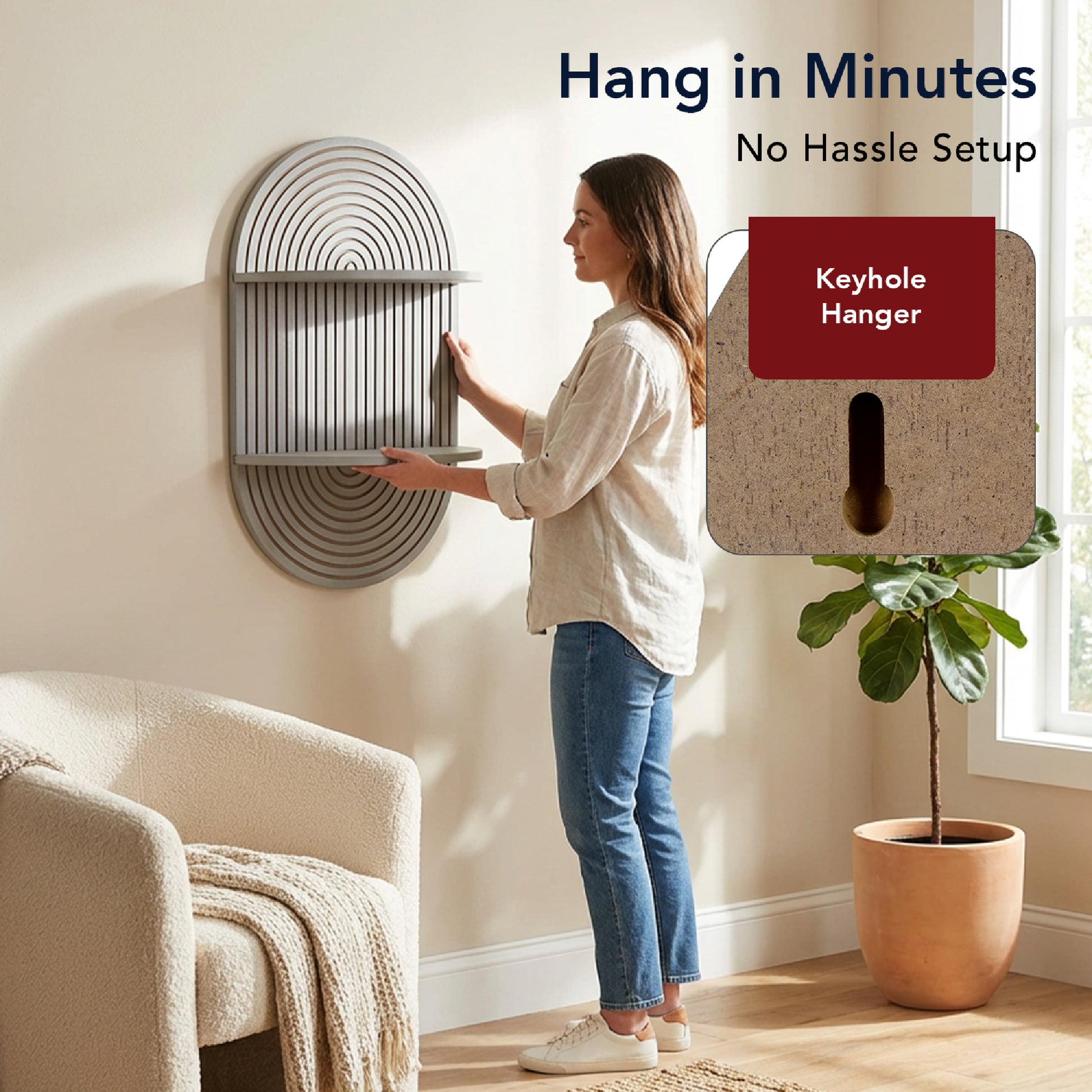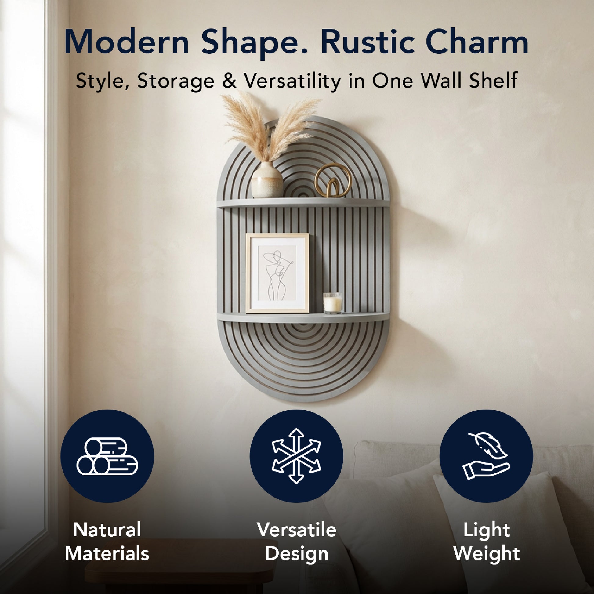 - ARCHED BOHO WALL ART STYLE - The carved rainbow-arch top and fluted vertical lines deliver a clean minimalist shelf look with boho decor warmth. The soft grey tone blends with modern farmhouse decor, mid century modern decor, and Scandinavian interiors, turning any wall shelf into a true decor piece.