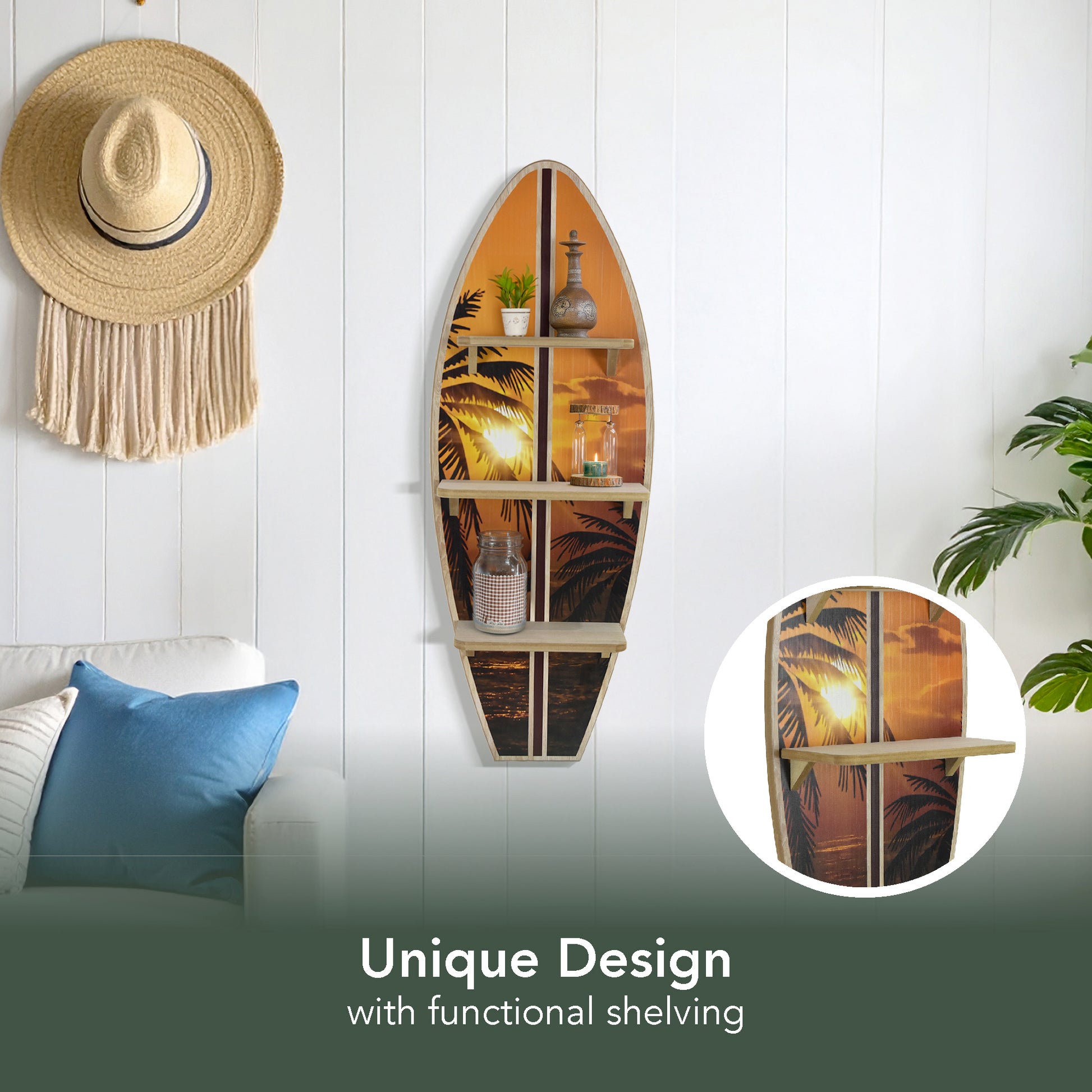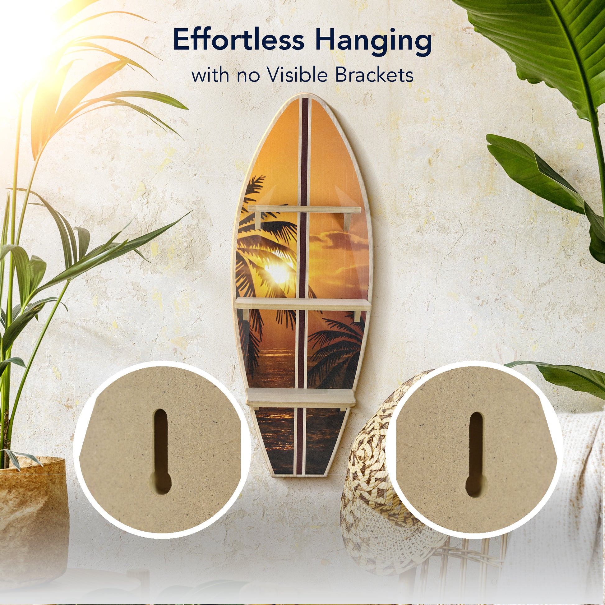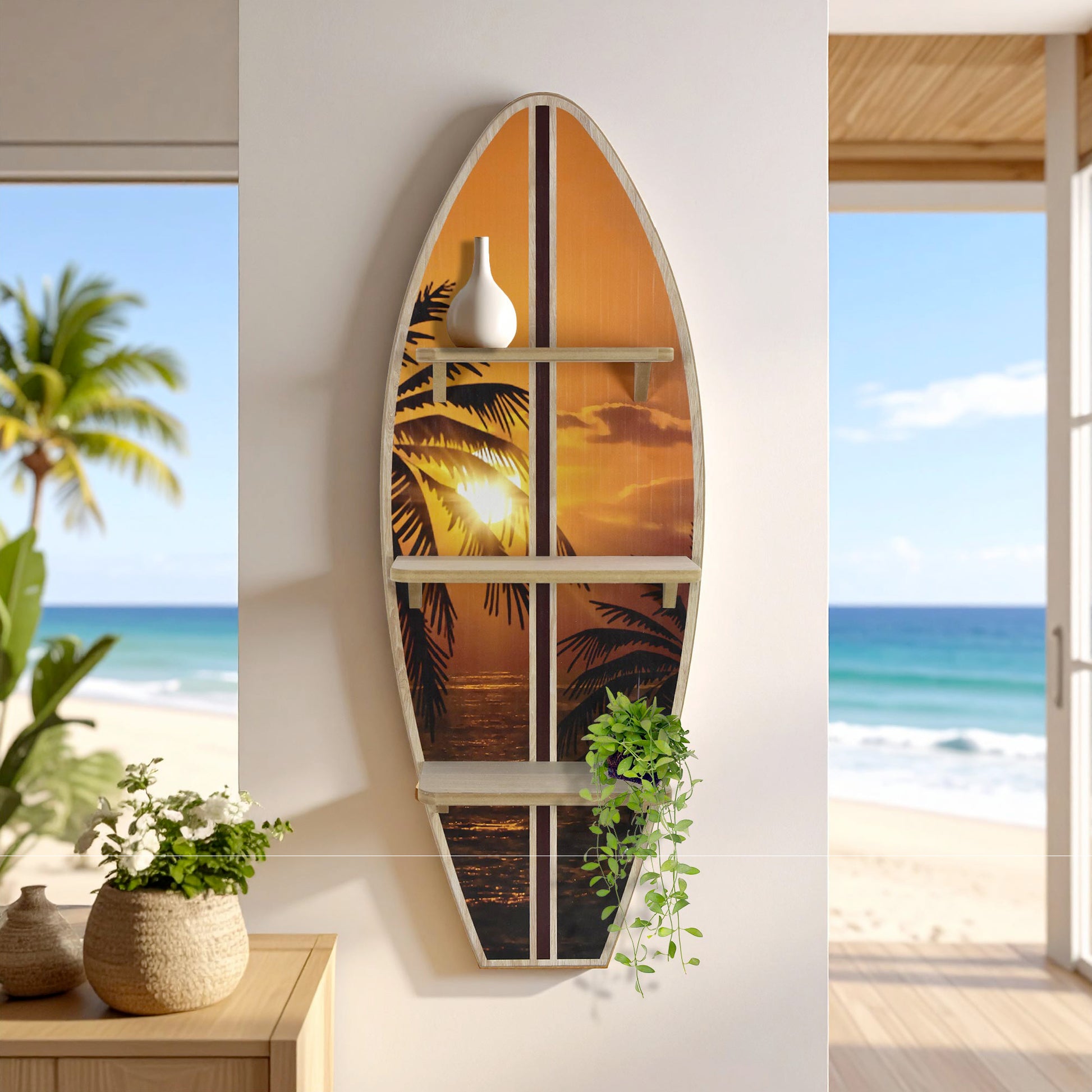 - SURF-INSPIRED WALL SHELF - Features a tropical Hawaiian sunset design with silhouetted palm trees and ocean reflections-perfect for adding a relaxed, beachy vibe to any room.