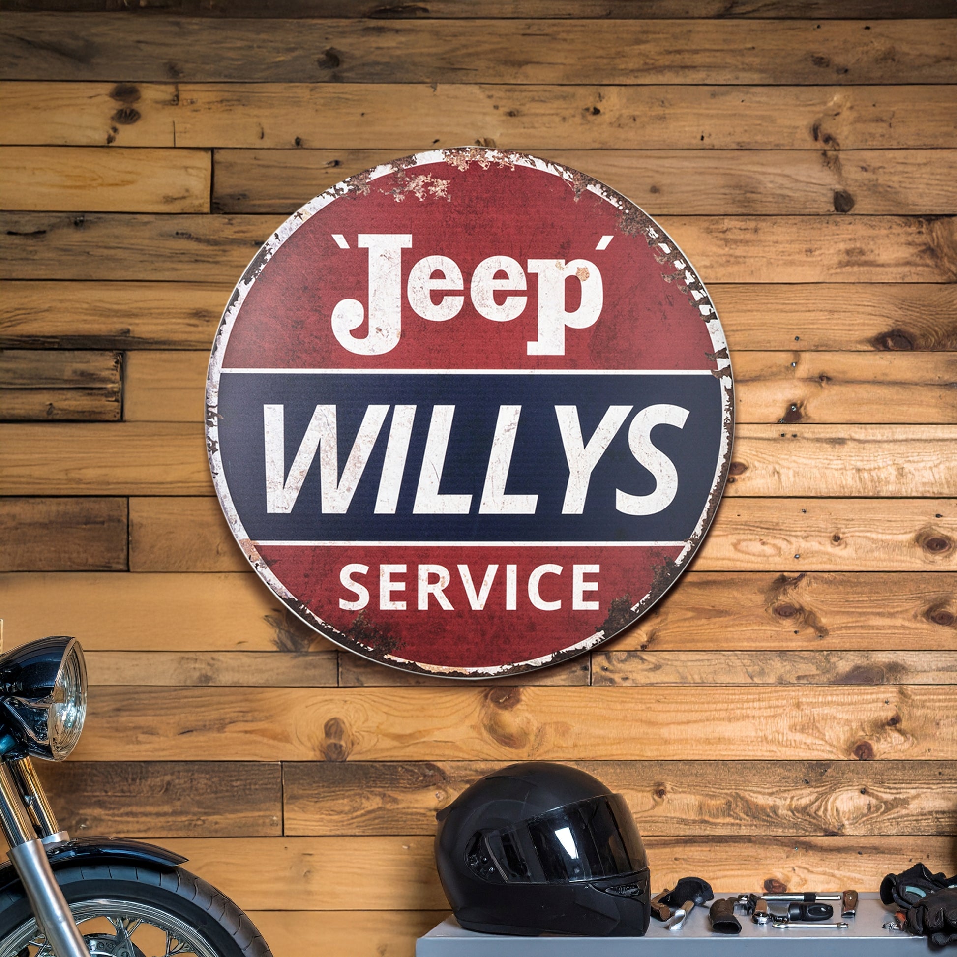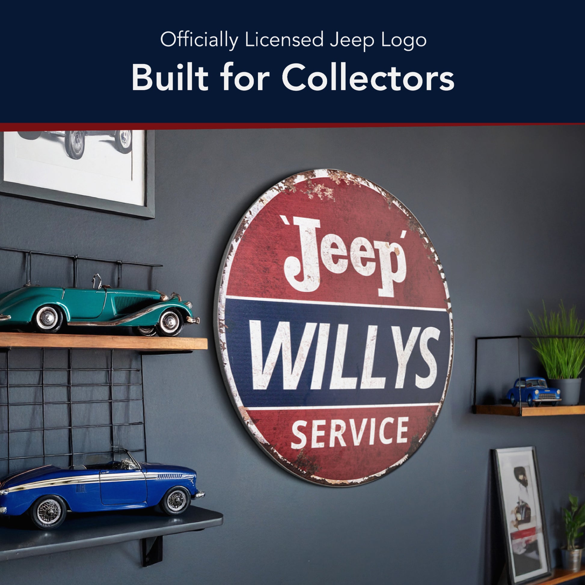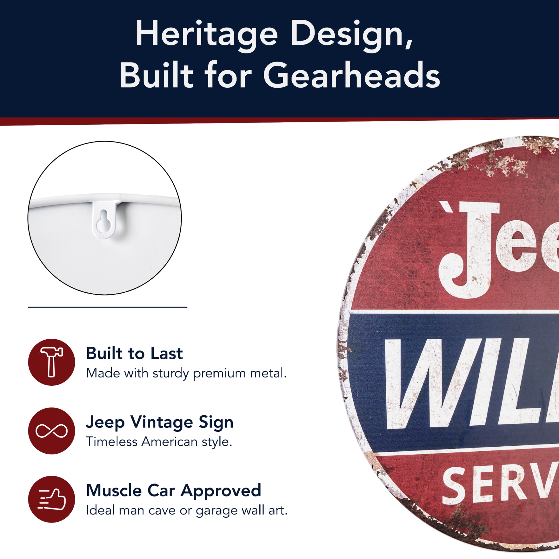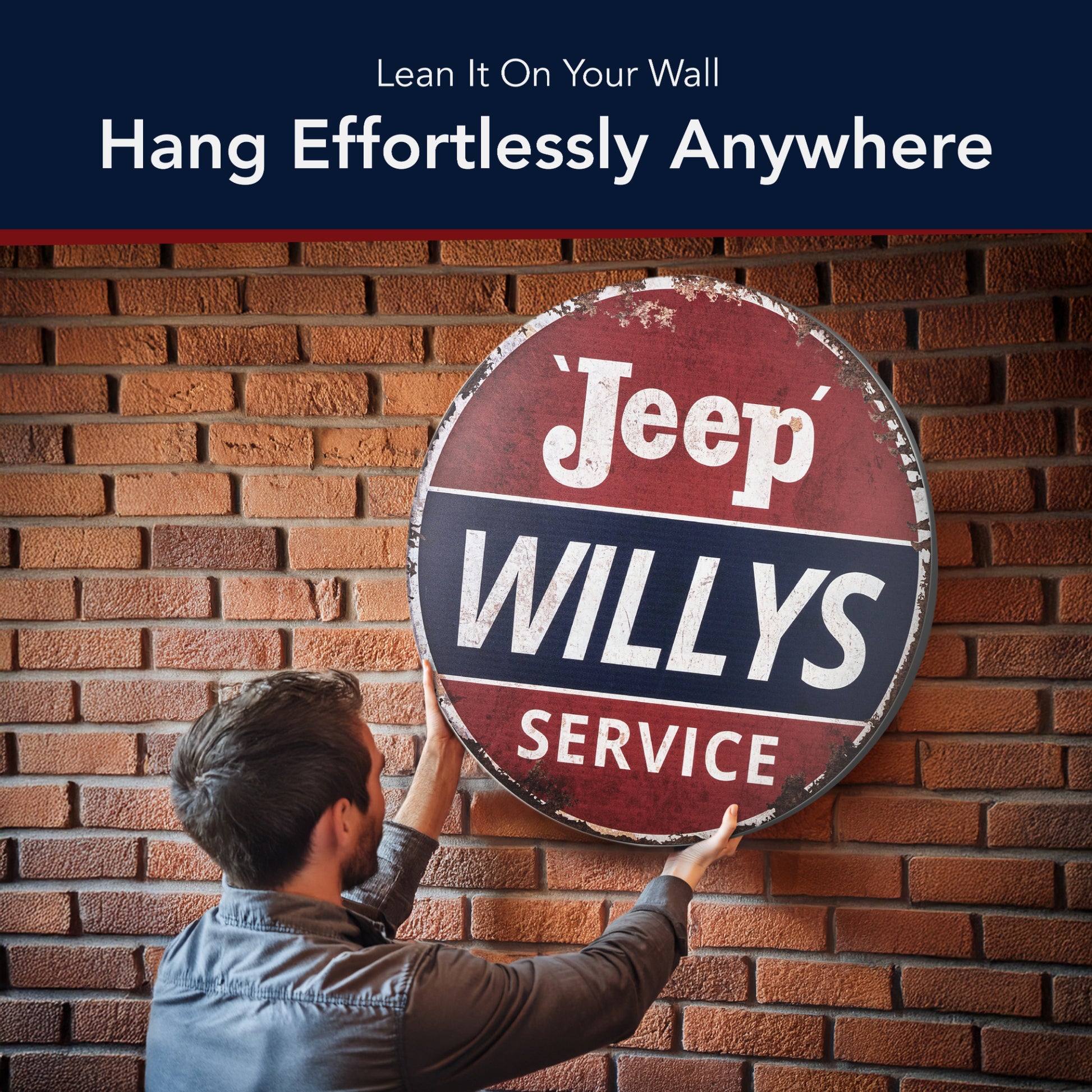- Iconic Jeep Willy's Design: Featuring the classic Jeep logo in burgundy, navy, and white, this 30" metal wall sign adds a rugged, vintage charm to any room, from man caves to garages and game rooms.