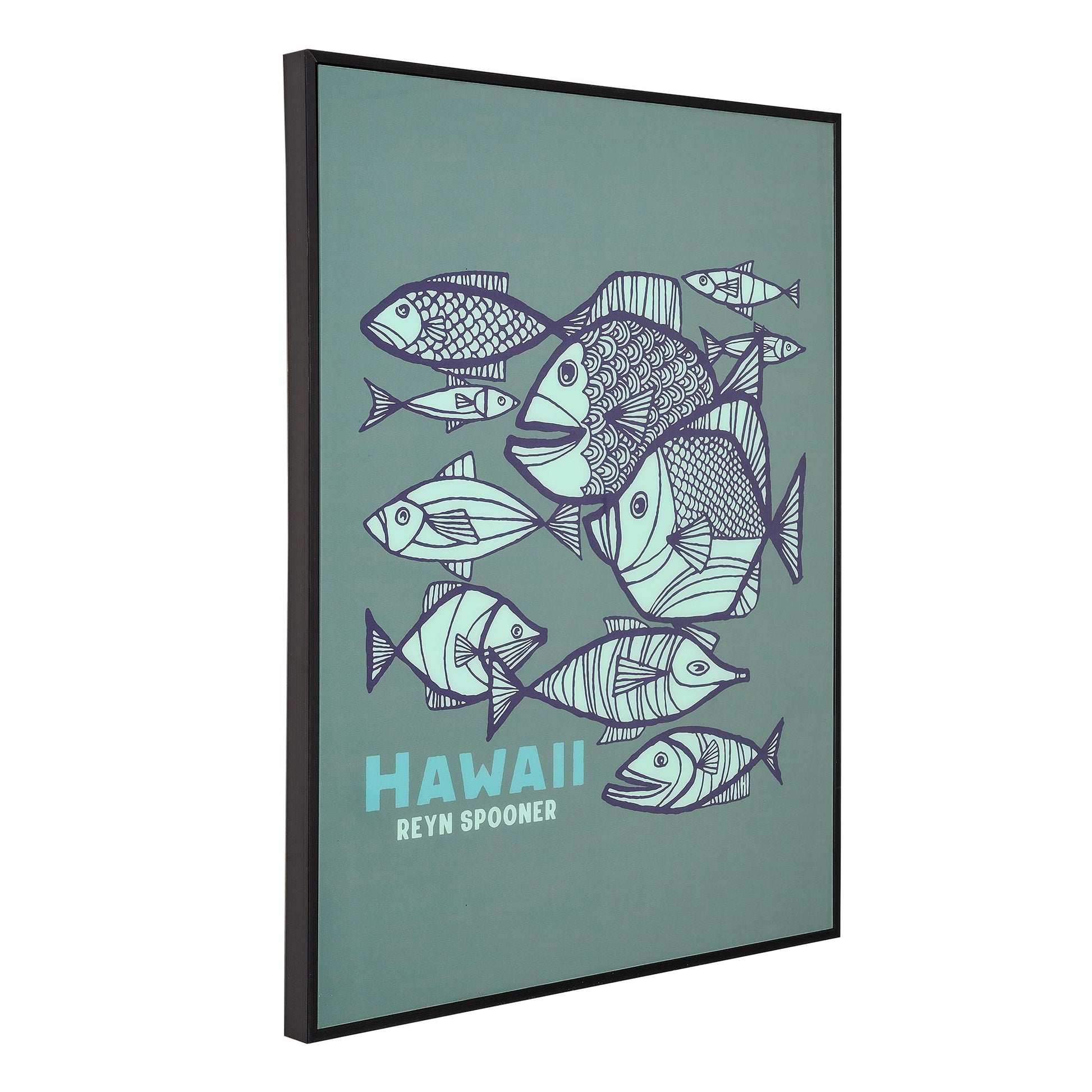 - FISHES ON PRINTED GLASS BY KONA COAST BY REYN SPOONER: This framed piece of glass art features a dynamic arrangement of animated fish, perfect for adding life and movement to your beach room decor.