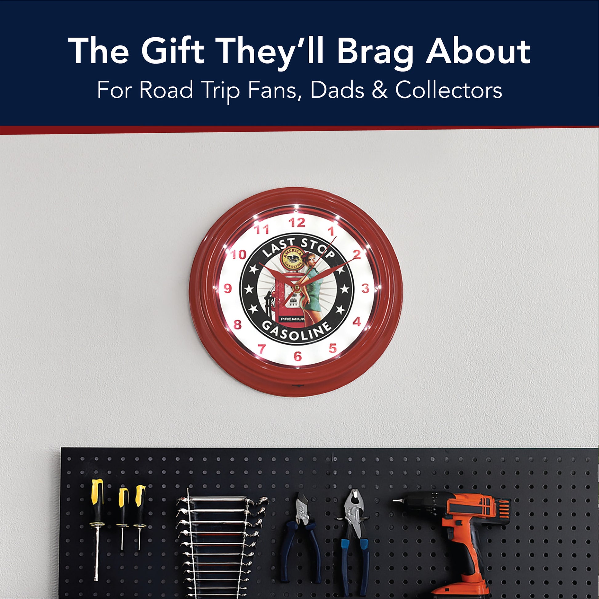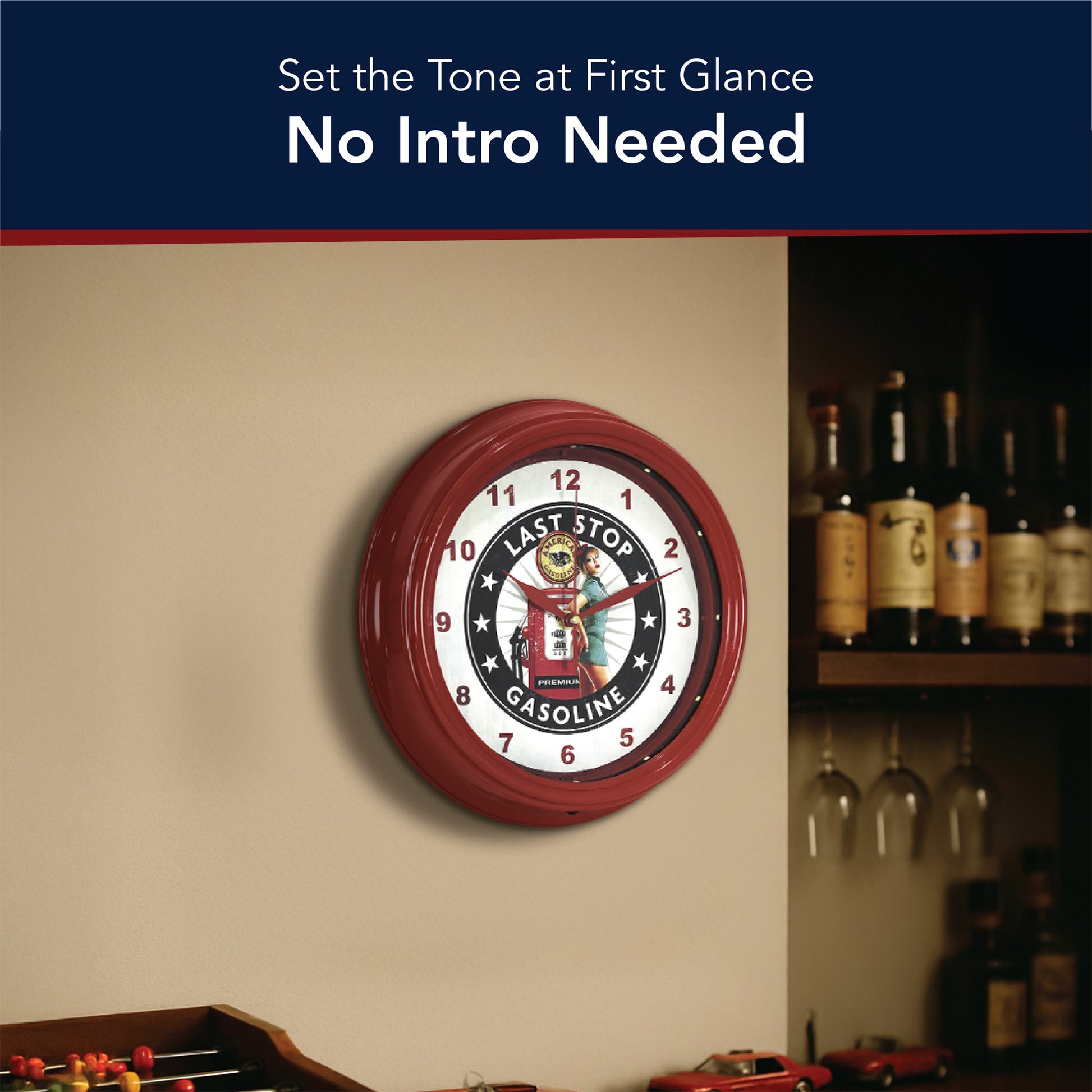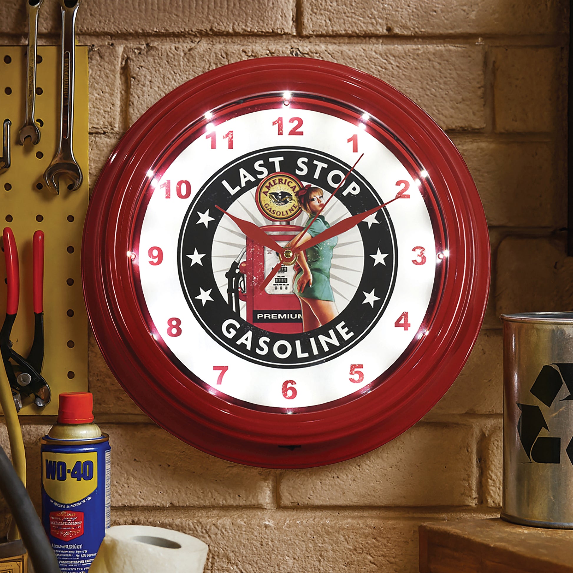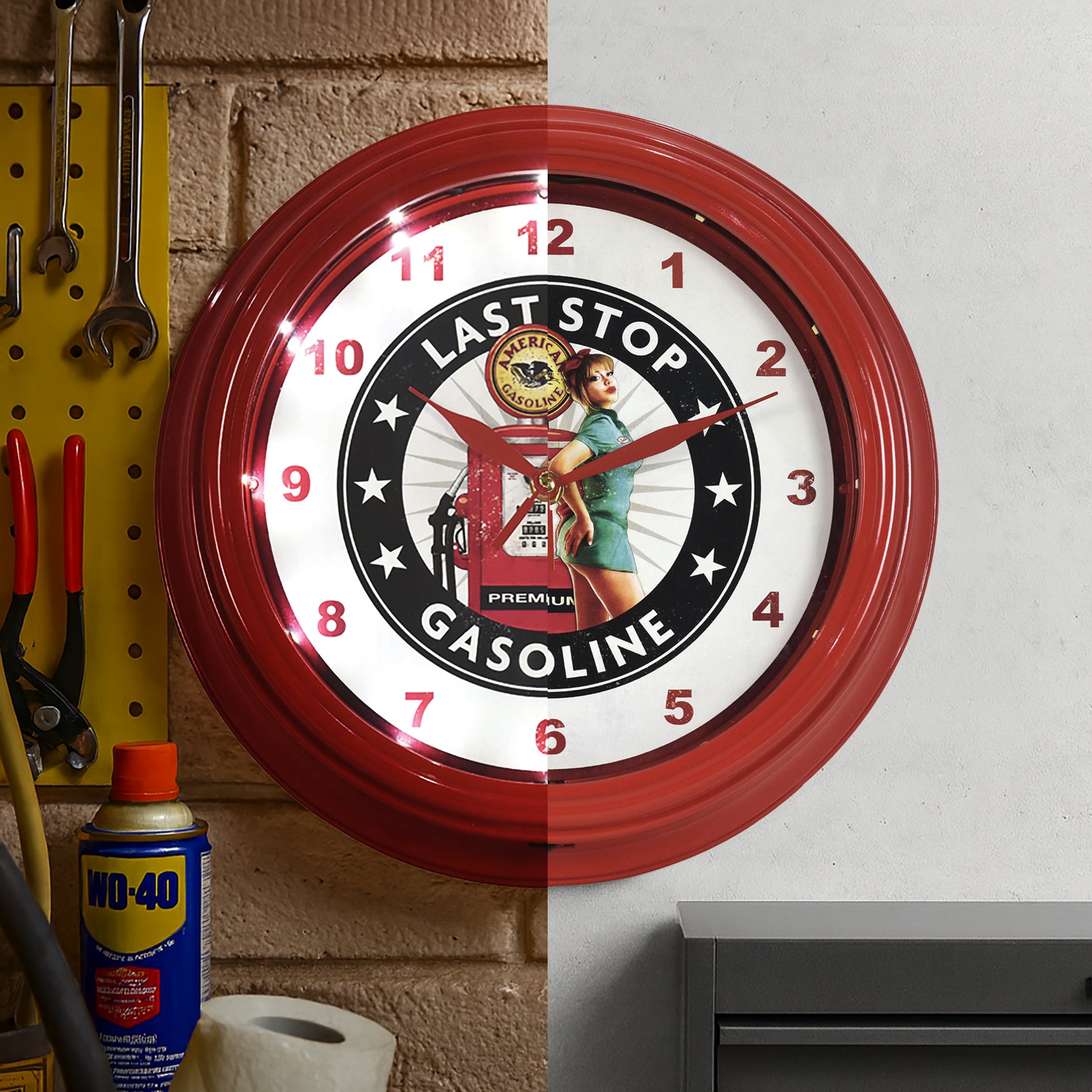 - VINTAGE GAS STATION STYLE & LED GLOW - Retro automobile fan? This 12" wall clock blends a nostalgic gas pump and pin?up girl design with neon LED illumination. Ideal for mancaves, garages, game rooms & bar decor-adds automotive charm and a warm glow to any space.