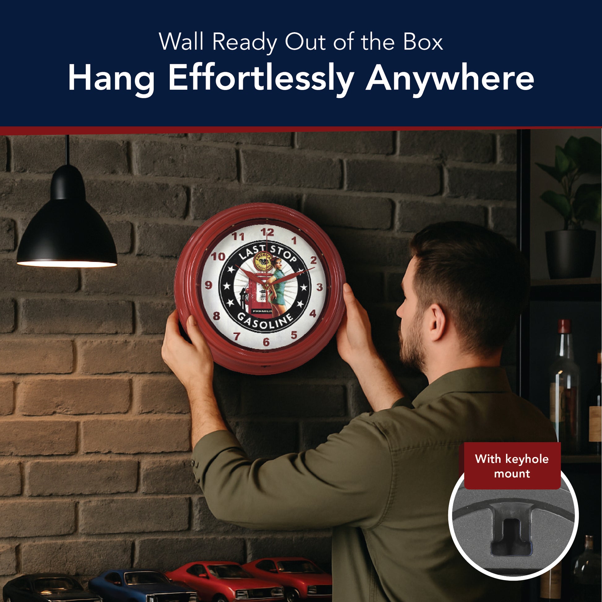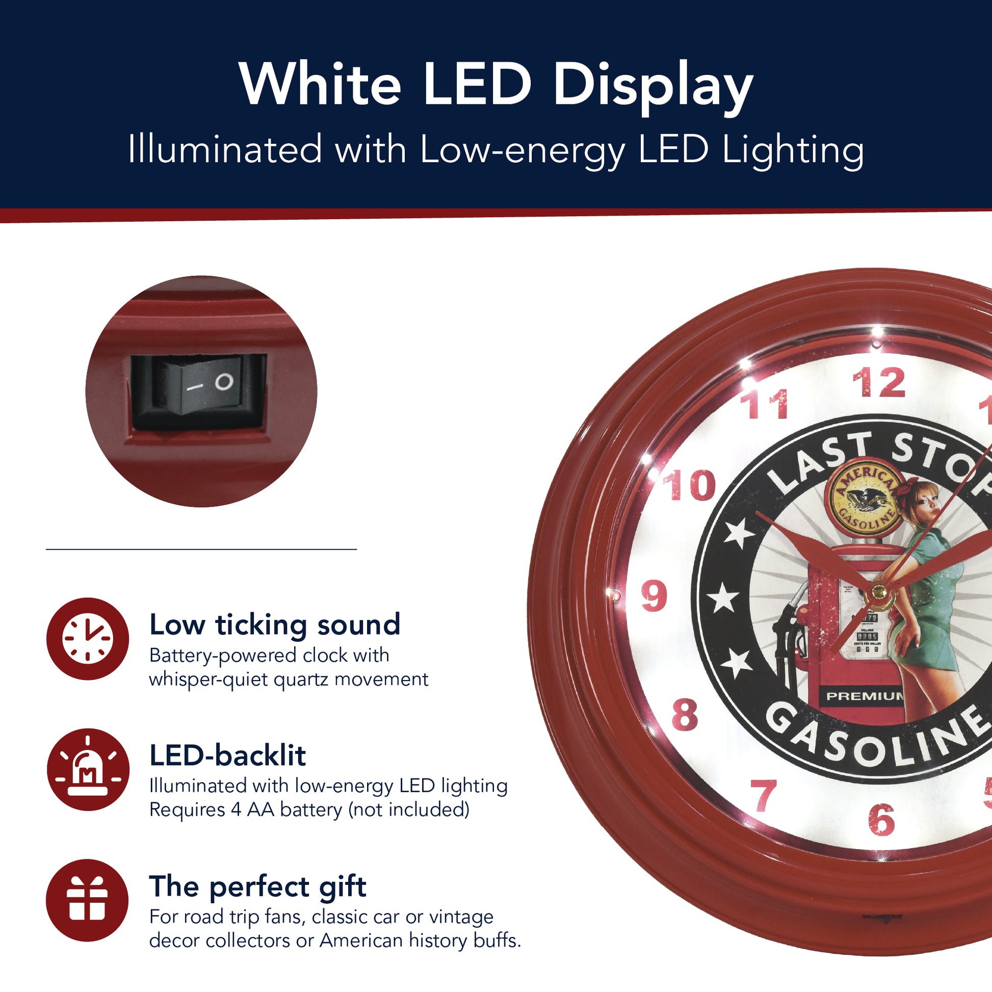 Bring nostalgic charm and automotive style to your space with the American Art Decor "Last Stop Gasoline" LED Wall Clock. Crafted in vibrant red, white, and black, this 12" clock combines a vintage gas pump, pin?up girl artwork, and neon-style LED lighting to evoke classic Americana. The silent sweep quartz movement ensures low whisper-quiet timekeeping powered by a single AA battery, while the durable LED lighting-provides a dramatic, long-lasting glow.Designed for versatile styling, it’s the perfect accent for mancaves, garages, game rooms, offices, dorms, kitchens, bars, and workshops. It’s easy to install using the included bracket-just plug it in for an instant splash of retro ambiance. Whether you're a vintage decor collector, automotive enthusiast, or gift-giver seeking a standout piece, this clock delivers both form and function.