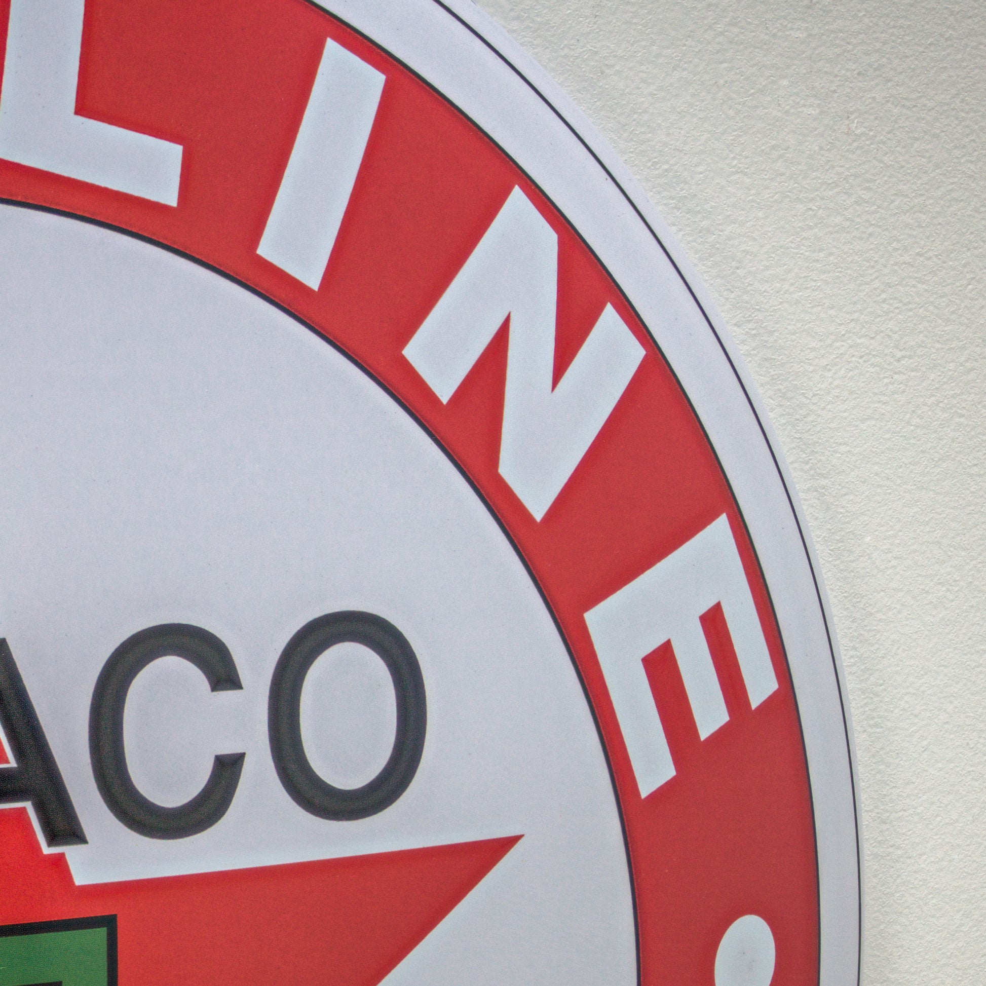 Fans of Texaco near and far, add to your collection of vintage-inspired signage and wall decor with this lightweight metal dome sign that is a perfect way to show your love for the Texaco brand while also adding some decorative flair to your home.Capturing the classic Texaco logo with its well-known and easily recognizable red star and white lettering, this dynamic sign really pops with character, charisma, and color. Made from lightweight metal that is printed with superior quality, this sign offers a concave, dome-shaped design that gives it a bit of depth and dimension which makes it easier to notice and adds flair to the piece.