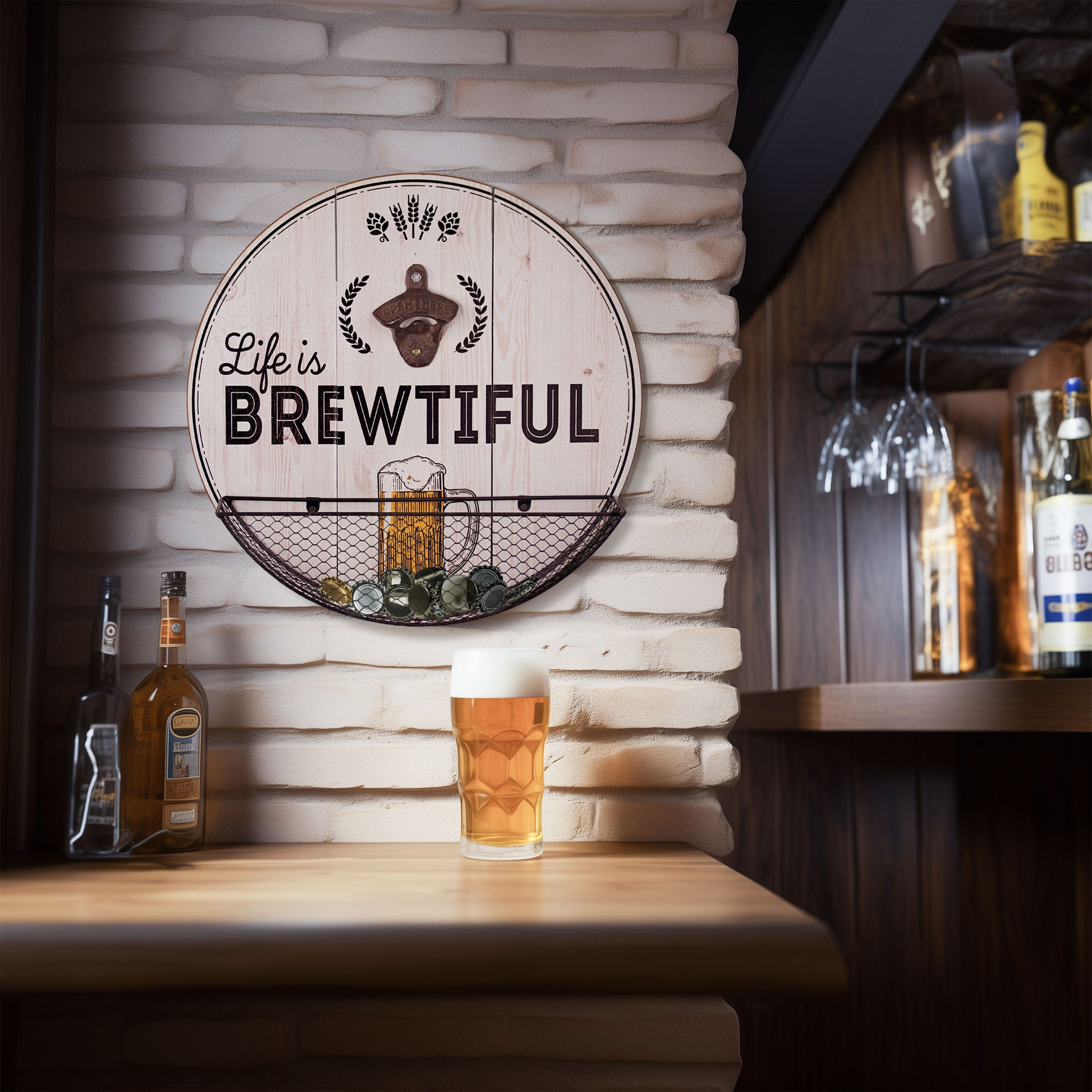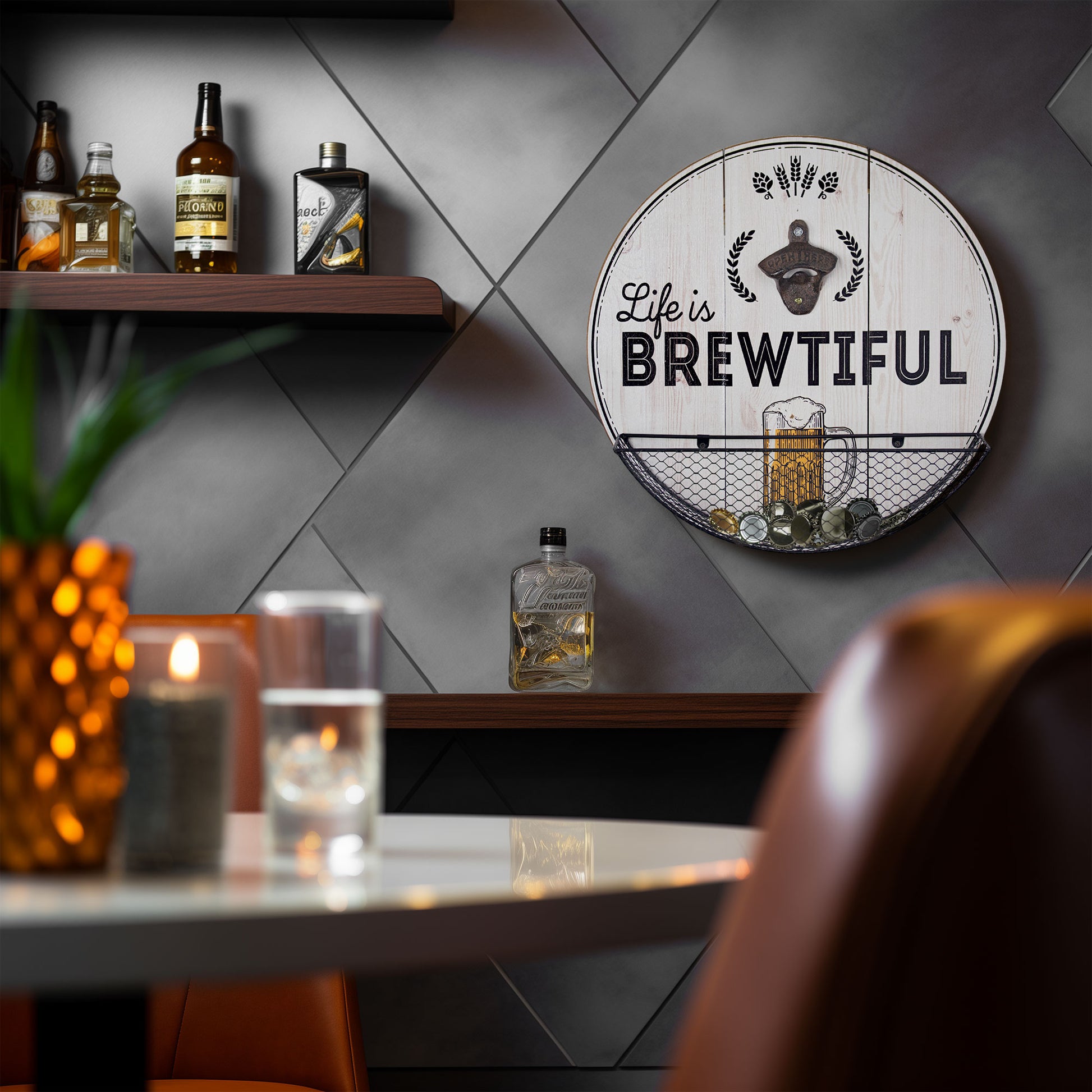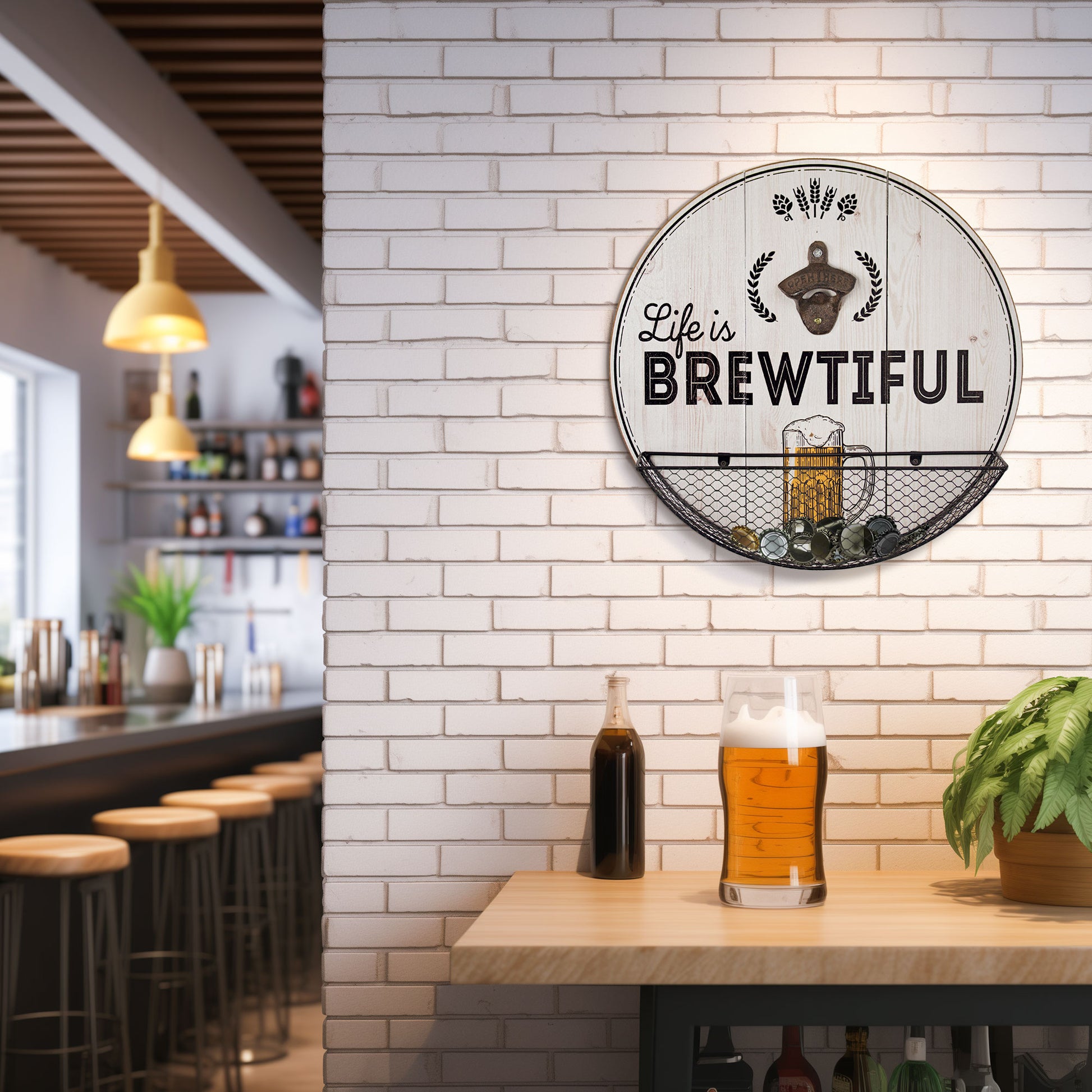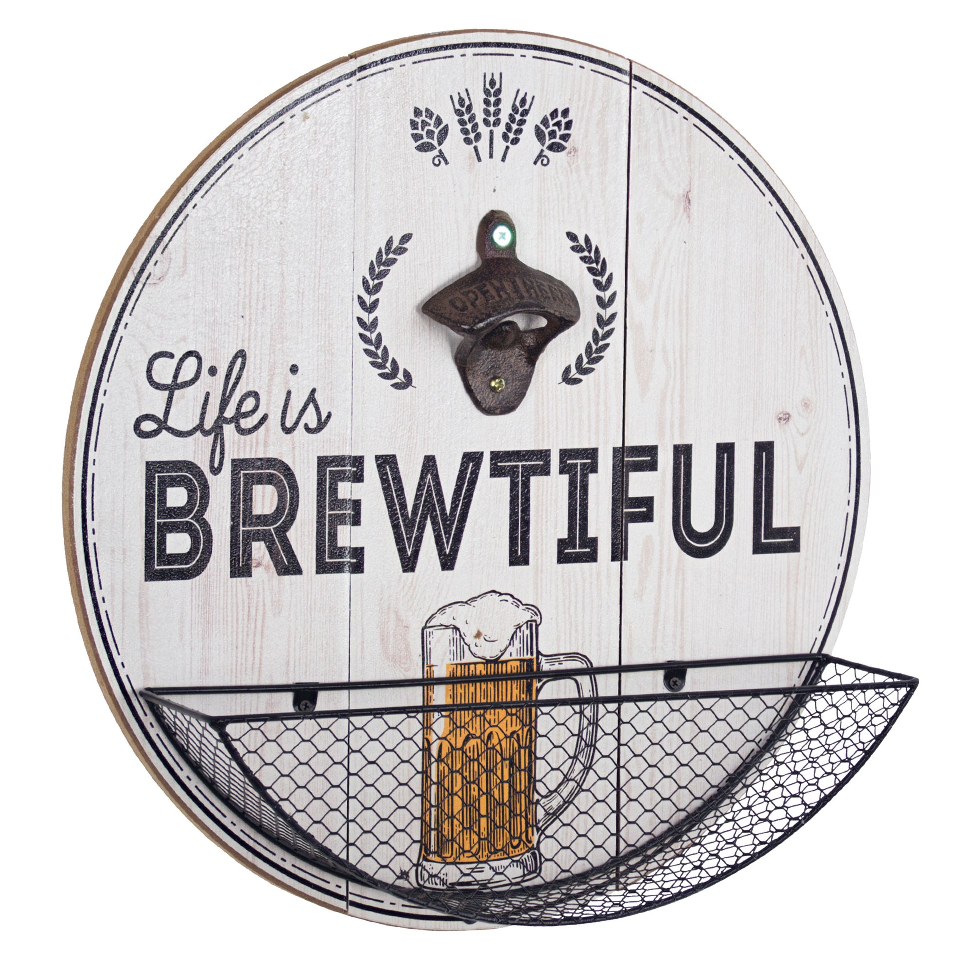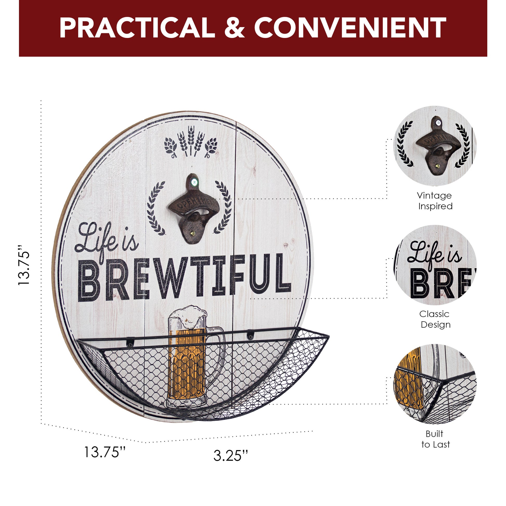 Complete the look for your home bar, man cave or garage with this comical wall-mounted bottle opener and cap catcher that details an illustration of a frosty mug of beer, catchy lettering, and clipart of hops and oats.