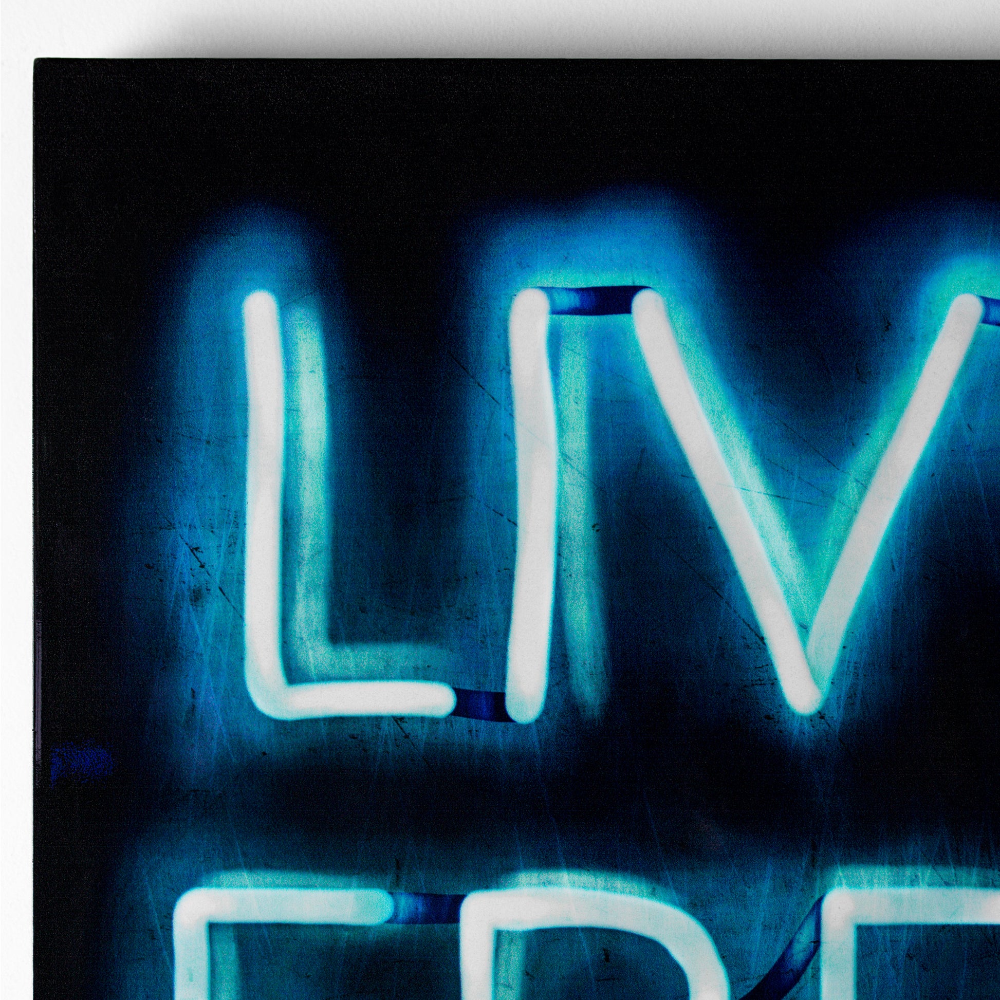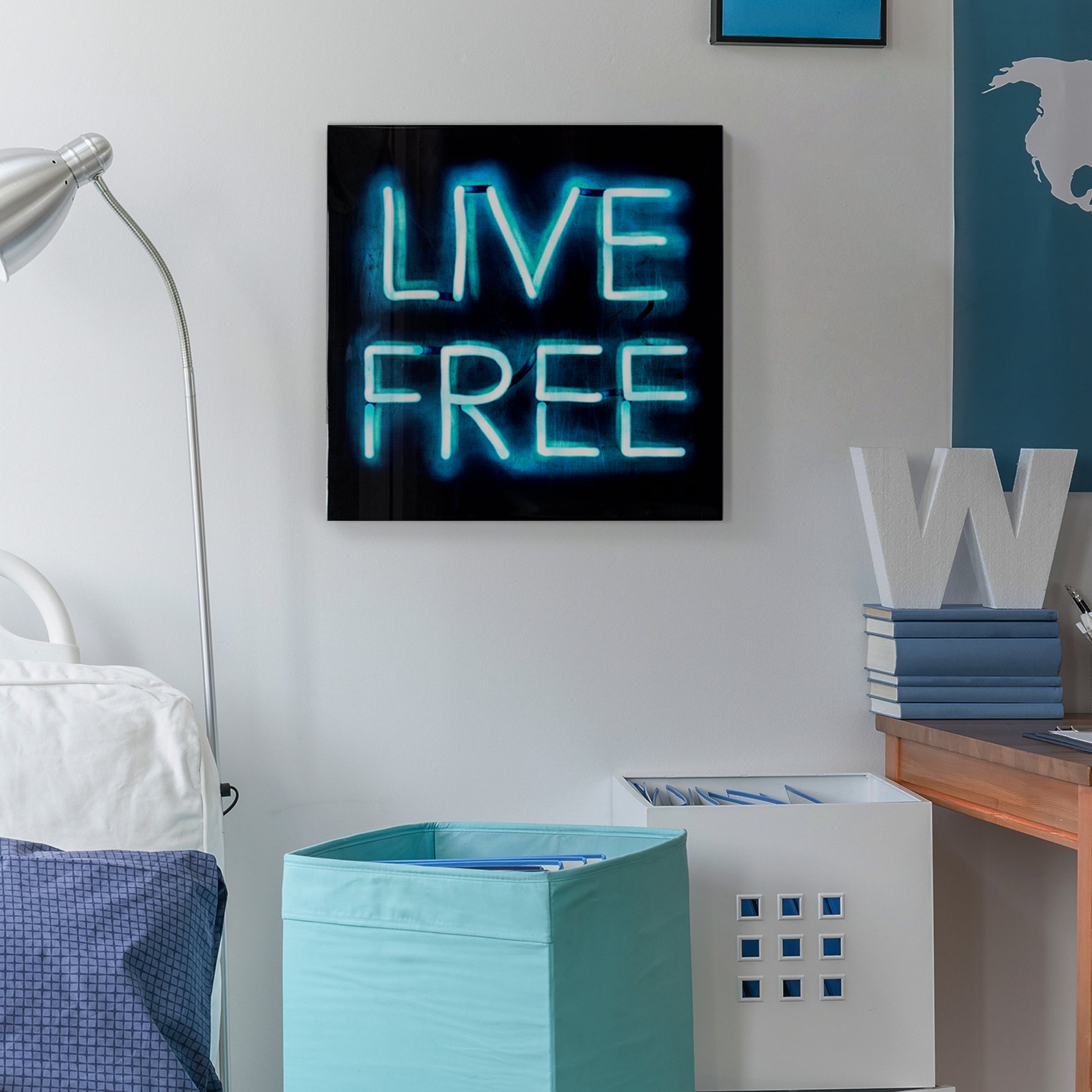 - NEON PHOTO PRINT ON MDF with 3D BOX FRAME – This wall art offers a neon photo print to serve as a reminder to “Live Free”. Printed on a 3D MDF (medium-density fibreboard) box frame with a high-gloss finish that gives it a slick and stylish look, this piece is modern, sleek, and fun!