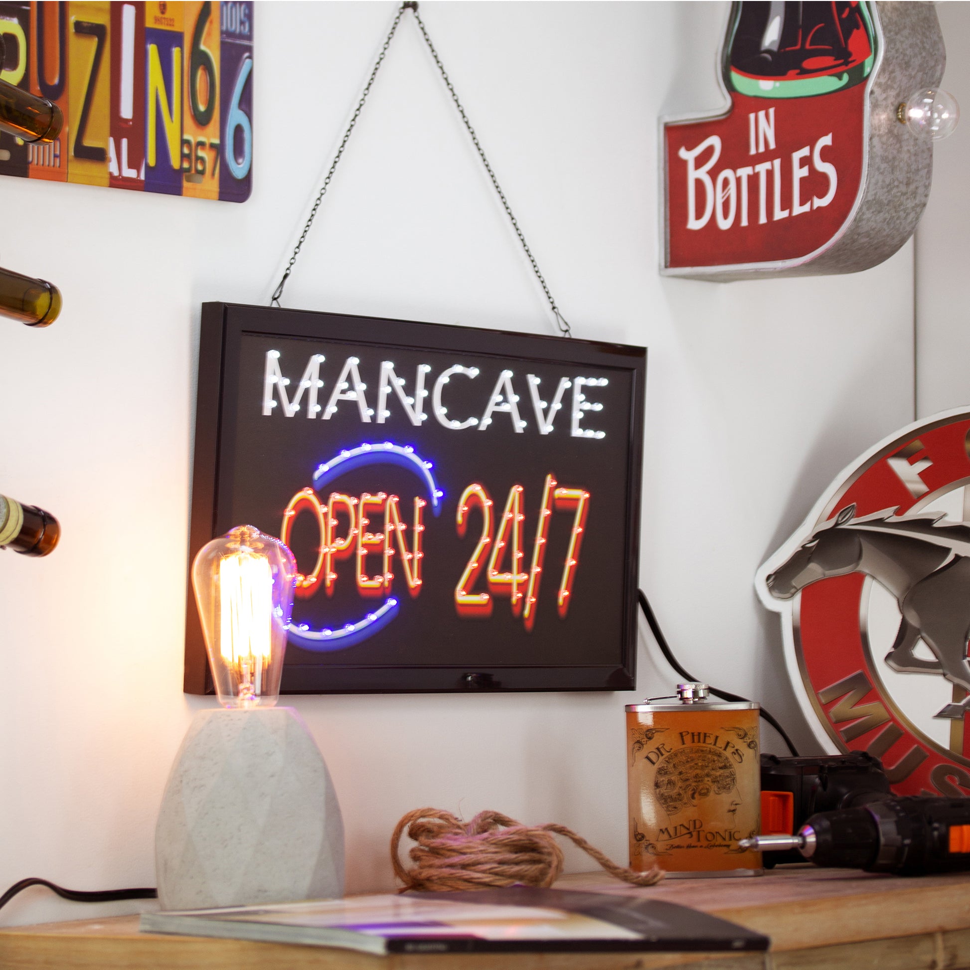 Add some dazzling lights to your home bar, man cave or garage with this framed LED light-up “Man Cave Open 24/7” sign.