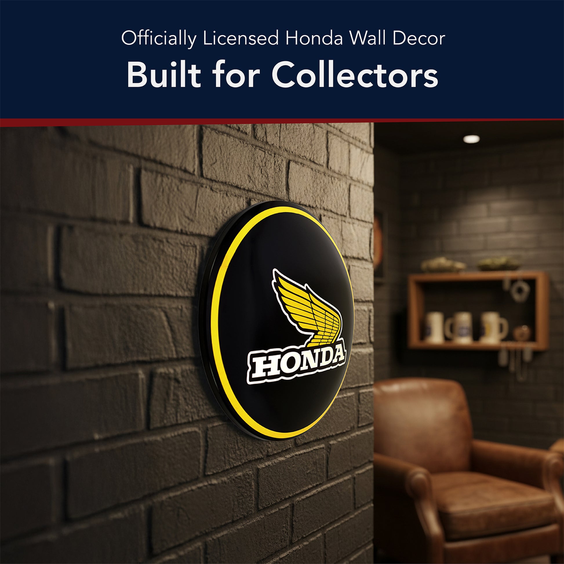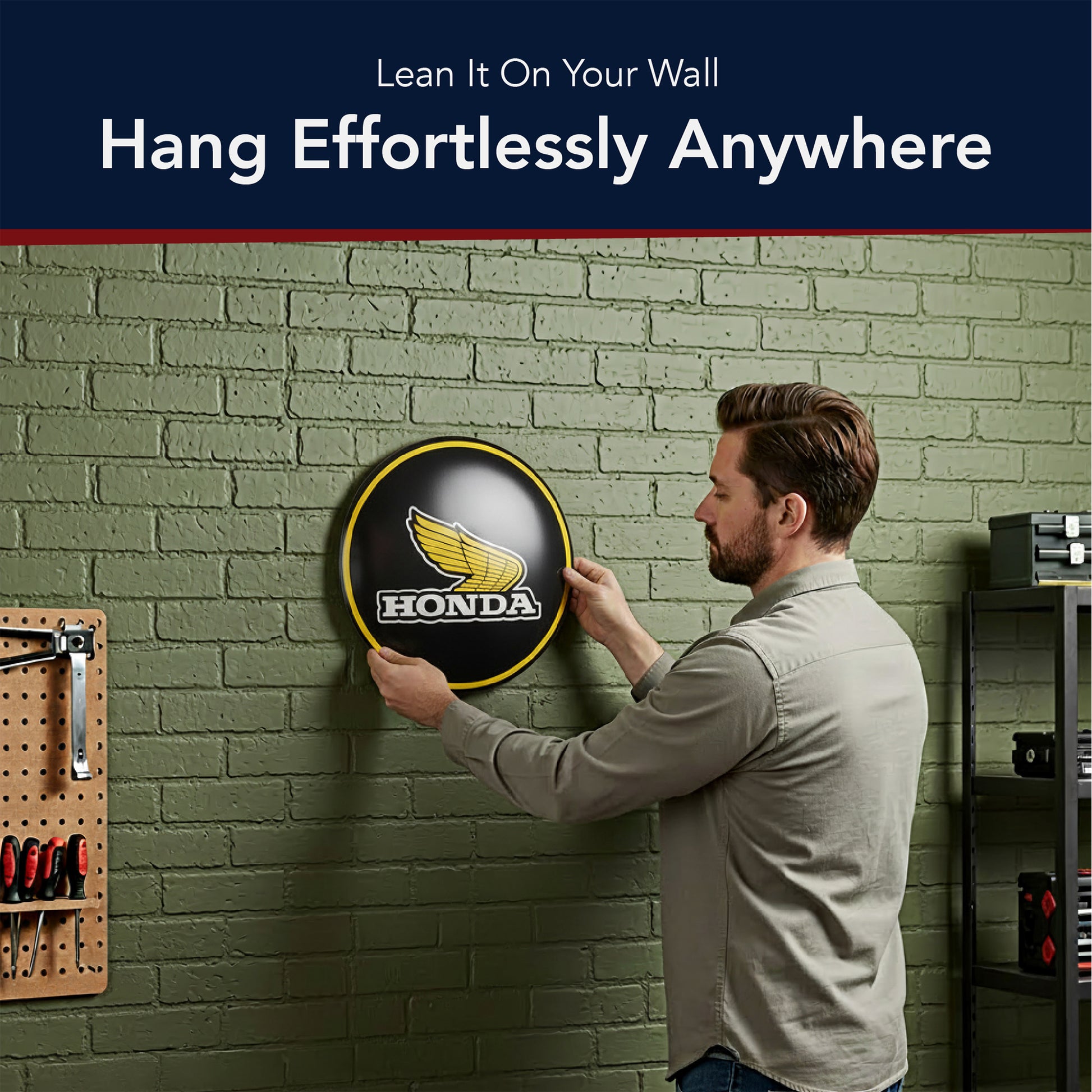 Bring high-octane racing energy to your space with this Honda Dome Metal Wall Art Sign, a bold 15-inch round metal sign designed for motorcycle fans, motorcross riders, and racing enthusiasts. Featuring the iconic wing logo in a raised dome profile, this metal wall decor delivers authentic garage and track-inspired style with strong visual impact.Crafted from durable metal, this wall art features a glossy black background, bright racing-inspired yellow accents, and crisp logo detailing that instantly commands attention. The domed construction adds depth and dimension, creating a premium look that stands out from flat metal signs or prints. Its round silhouette and bold contrast make it a natural focal point in automotive-themed spaces.