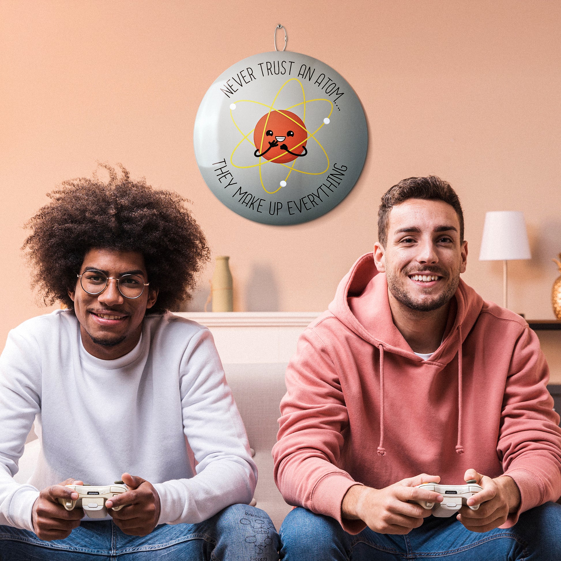 - This “Never Trust an Atom” metal dome isn’t just for science enthusiasts: it’s perfect for anyone who appreciates witty decor and vintage charm. Hang it as a statement piece in your man cave, mix it into your garage decor, or add it to your collection of vintage metal signs. This dome sign combines humor and style effortlessly.