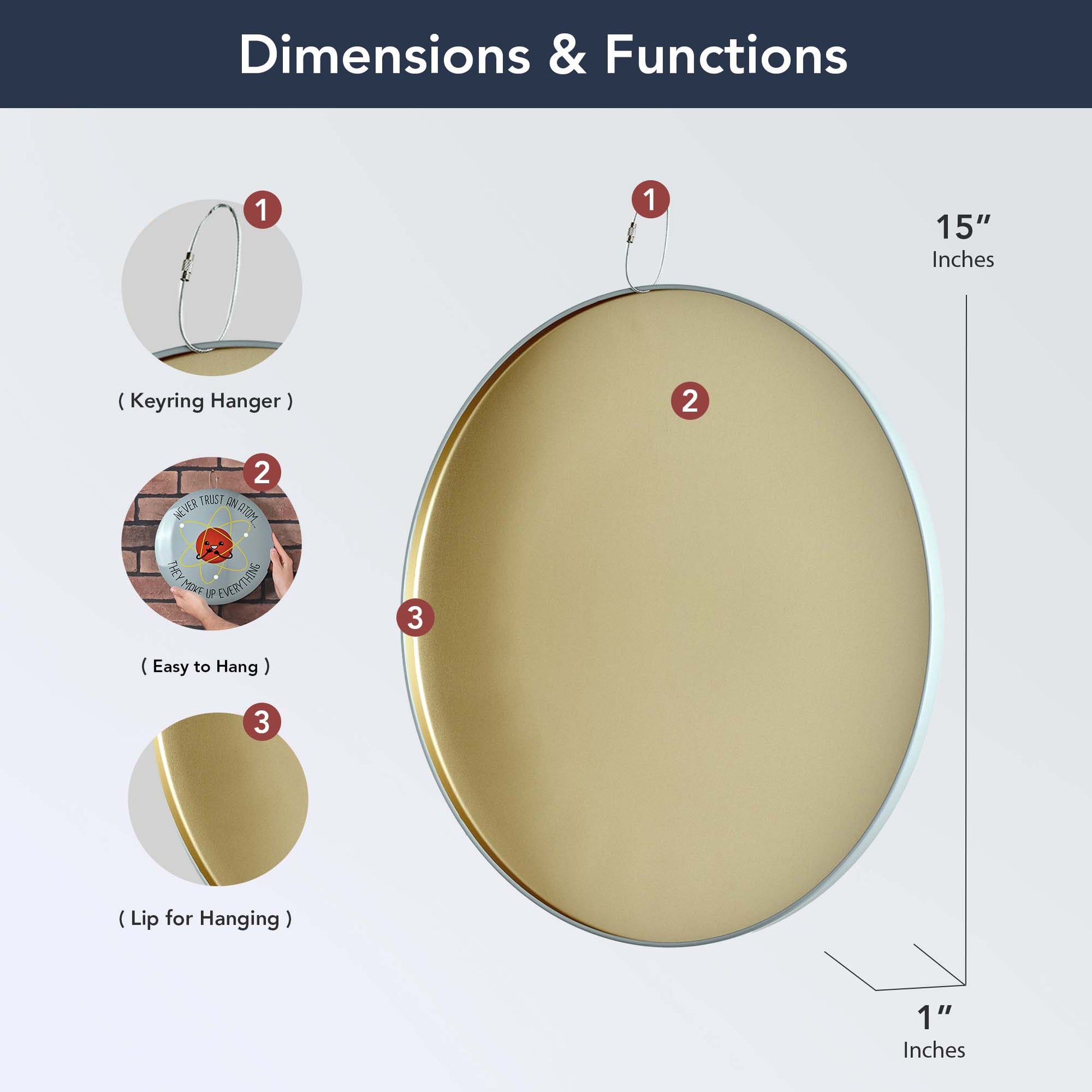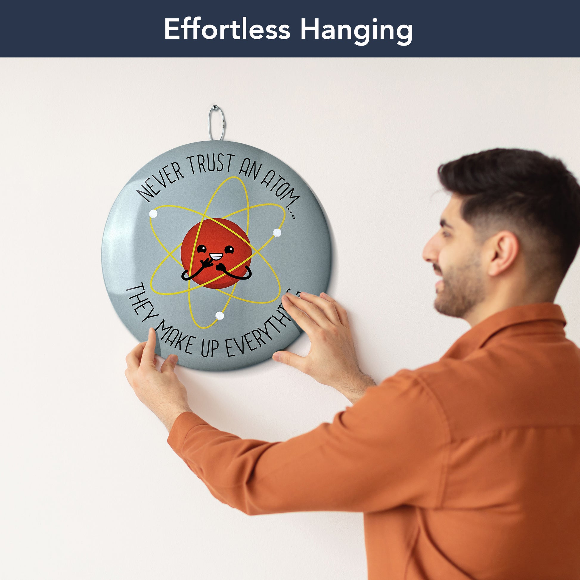 Bring a unique twist to your space with this "Never Trust an Atom" Metal Dome Sign. Designed for guys who appreciate clever humor and retro style, this 15" vintage-inspired sign is the perfect addition to any man cave, garage, or workshop. It’s lightweight and easy to hang, so setting up your new favorite piece of wall decor is a breeze. Just grab a couple of nails or screws, and let this eye-catching metal art bring character to your space.