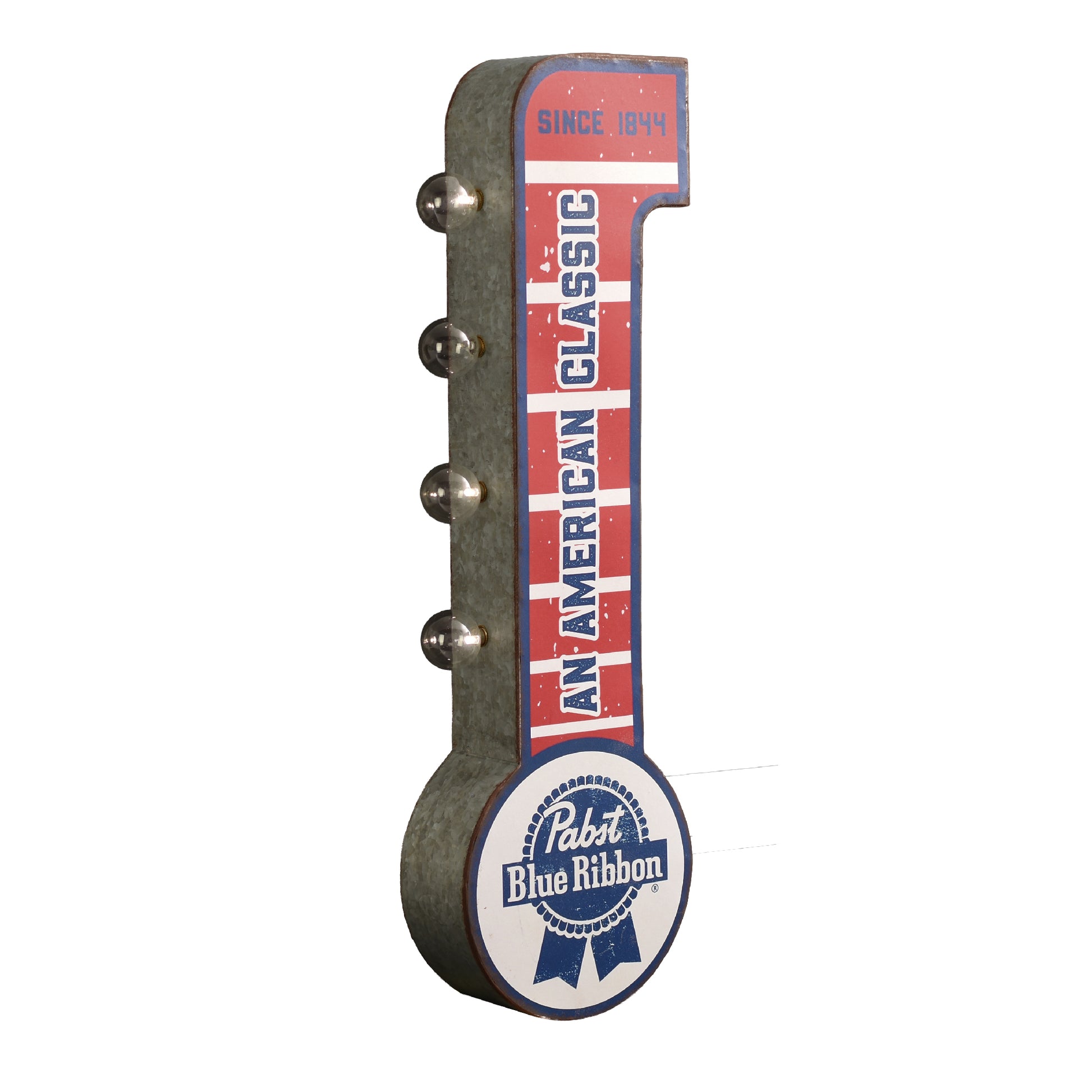 Elevate your space with the American Art Decor Vintage 'Pabst Blue Ribbon' Double-Sided LED Metal Sign. This retro-inspired marquee sign brings a touch of nostalgia and Americana to any room. Measuring 7.5" x 3" x 25", it's the perfect size for man caves, game rooms, home bars, or breweries.Crafted from galvanized metal with a weathered finish, this sign features the iconic Pabst Blue Ribbon logo and the phrase "SINCE 1844", celebrating the rich history of this American classic. The double-sided design ensures visibility from multiple angles, making it a standout piece in any setting.