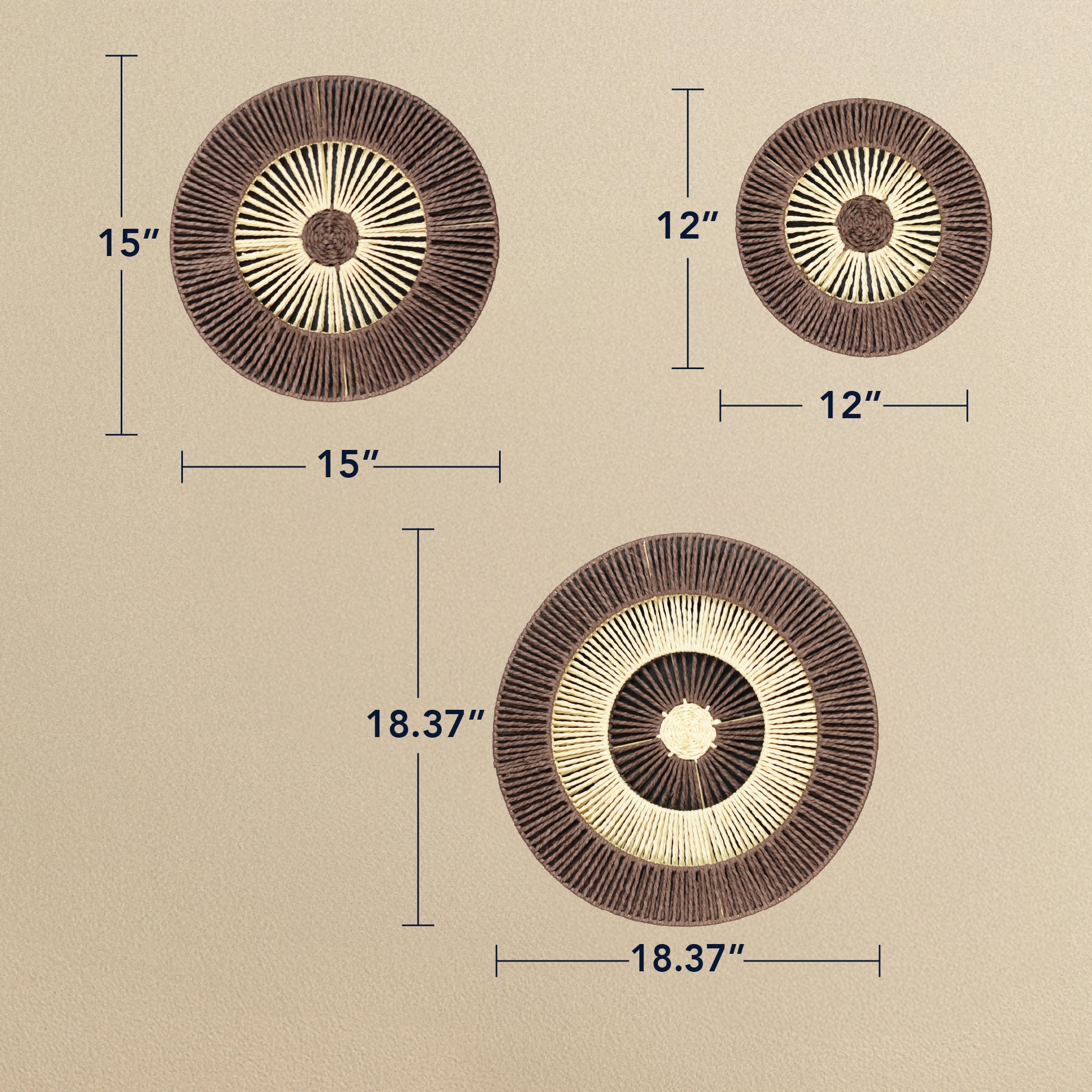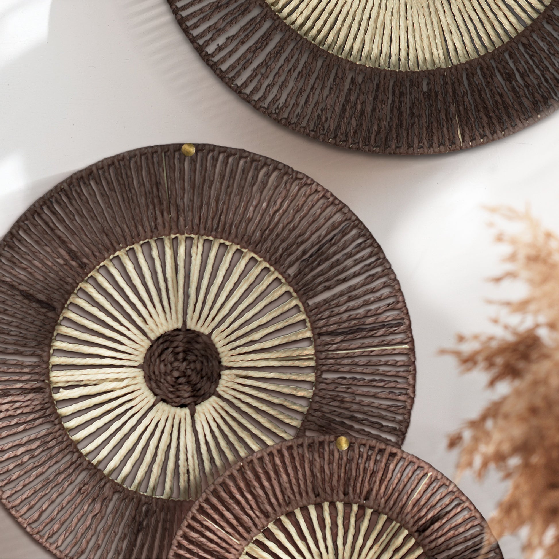 Create an inviting, boho-chic ambiance effortlessly with this Round Woven Paper Rope Wall Decor Set of 3. Hand-crafted from natural fibers and woven around sturdy internal frames, these round-shaped wall hangings bring organic texture, warmth, and artisanal flair to any space. The layered petals radiate from a tight, circular center, capturing the essence of rustic boho-inspired wall art.Available in varying shades of natural browns, each piece complements the others while providing visual depth-perfect for grouped displays above couches, beds, or coffee bars. Compile them as a bold focal point or spread them throughout the room for subtle accents.