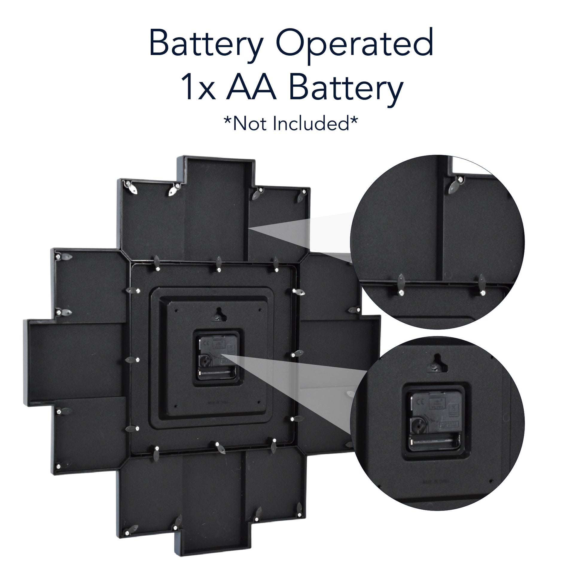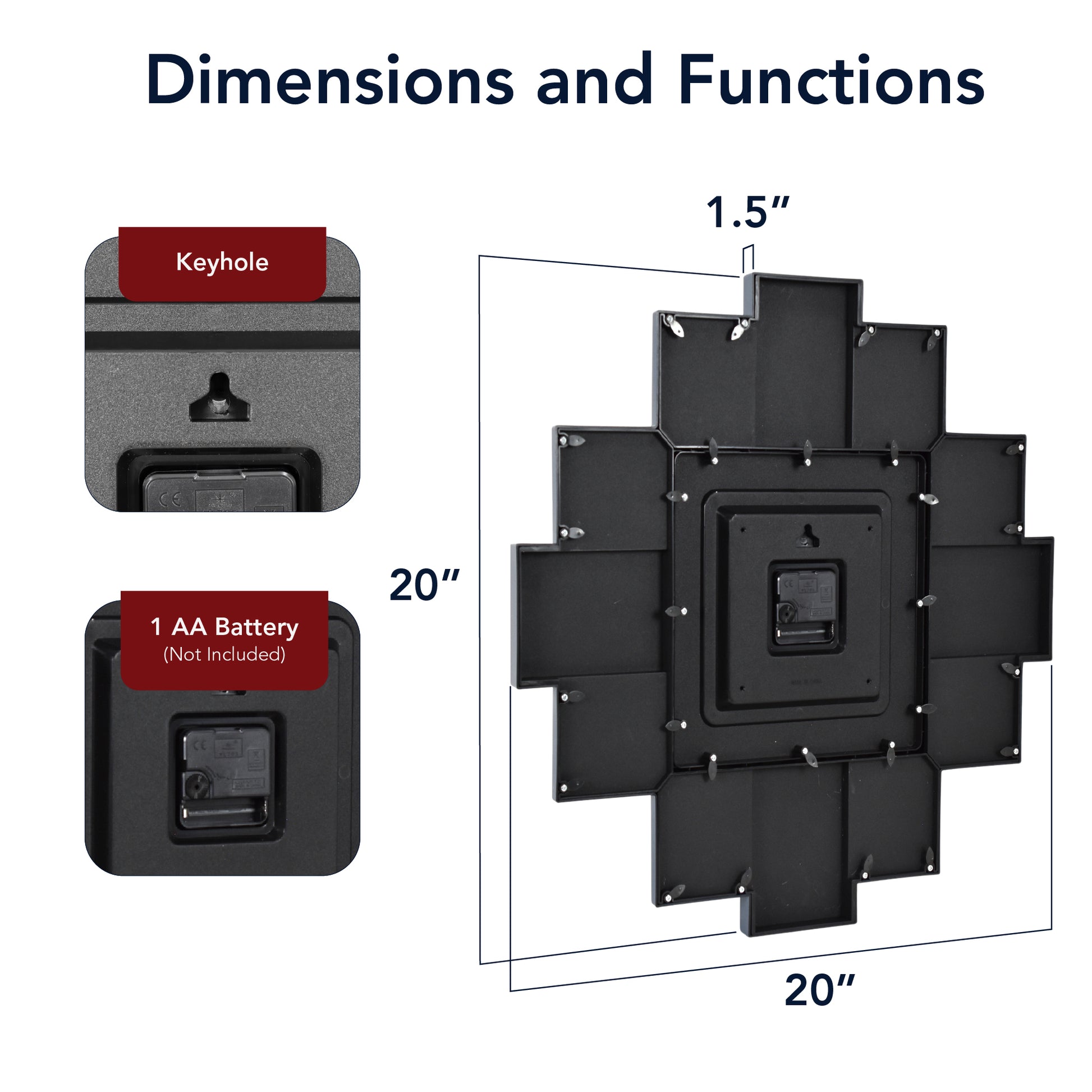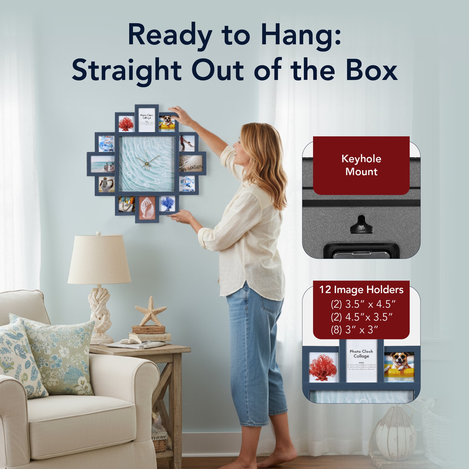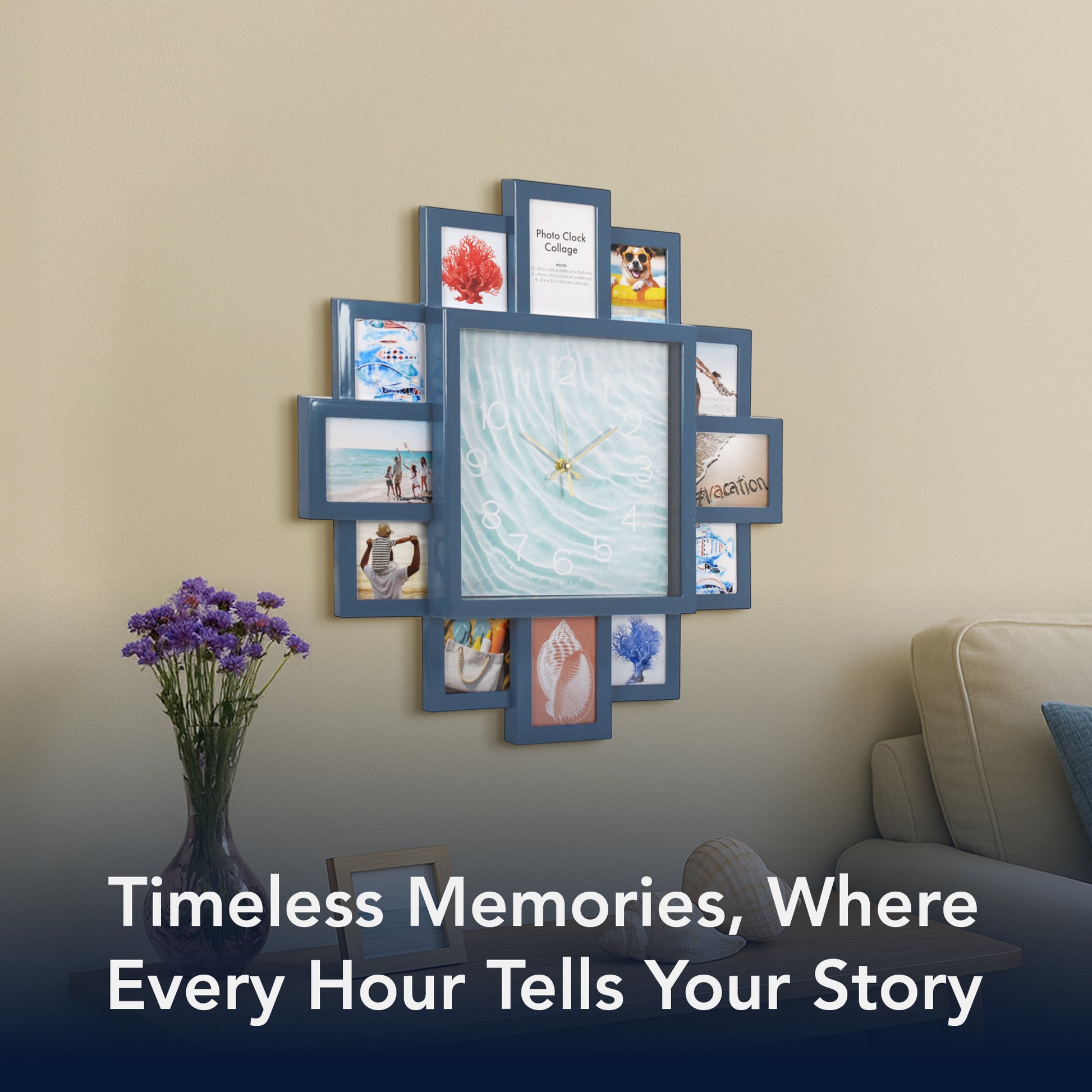 Bring your most treasured vacation and family photos into daily life with the American Art Decor Picture Clock Collage. This stylish wall decor piece blends the utility of a working wall clock with the personalization of a 12-photo collage frame - giving your memories center stage.Measuring 20" x 20", the design features a central clock face with a coastal blue, rippling water aesthetic, and twelve surrounding smaller frames in a balanced cross-like layout. Each photo slot is ideal for standard small prints (2 -3.5 in x 4.5 in/ 2 -4.5 in x 3.5 in/ 8 -3 in x 3 in). The clock uses a low ticking quartz sweep movement so it won't disturb quiet rooms.