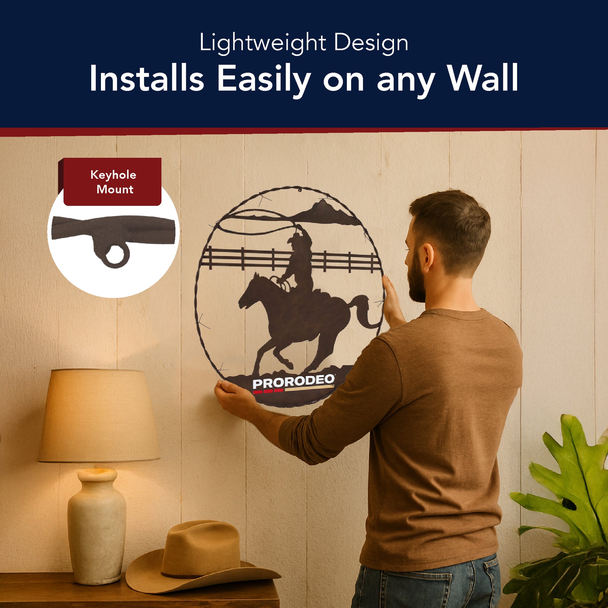 Easy to hang with included hardware, this cowboy wall decor blends functionality with artistry. Whether you're outfitting a rustic living room, stylizing a western-themed bedroom, or adding personality to a corporate office, this ProRodeo silhouette brings bold, timeless charm and metal wall art attitude to any space.