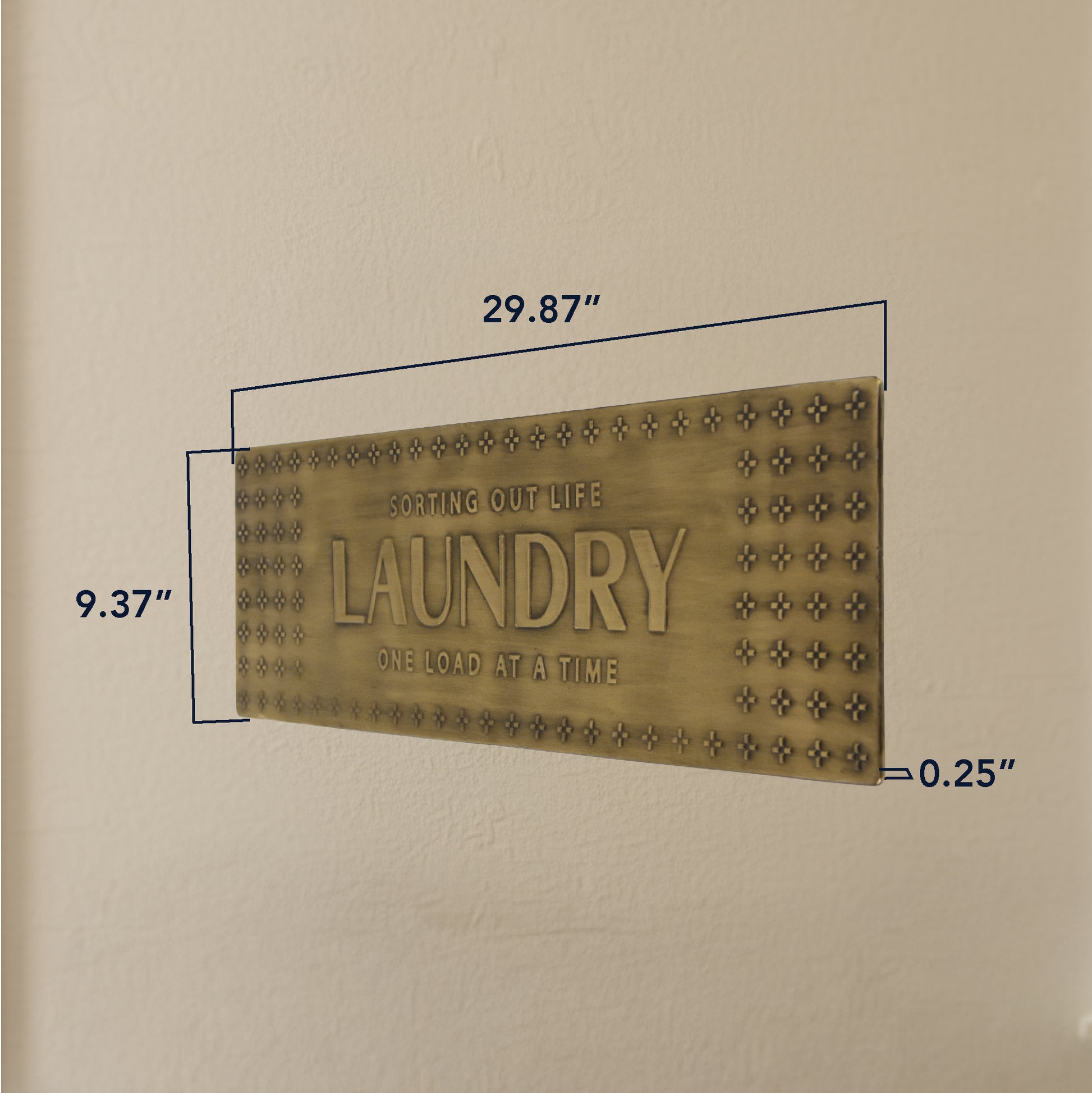 Bring warmth, style, and personality to your home with the American Art Decor "Sorting Out Life One Load At A Time" Metal Sign, a timeless piece of laundry room wall decor crafted for both beauty and durability. This rectangular embossed metal sign features a rich antique brass finish, with raised text and decorative motifs framing the piece. The message-LAUNDRY in bold letters, with "Sorting Out Life" above and "One Load At A Time" below-serves as a charming reminder of the everyday tasks that bind us, wrapped in vintage character.Made from sturdy metal with embossed details, this sign resists moisture and maintains its shape and finish in humid laundry room conditions. Pre-drilled mounting holes make installation fast and easy, whether above your washer/dryer, on a wall, or in a utility closet. Its dimensions are perfectly suited to be noticeable without overwhelming your space.
