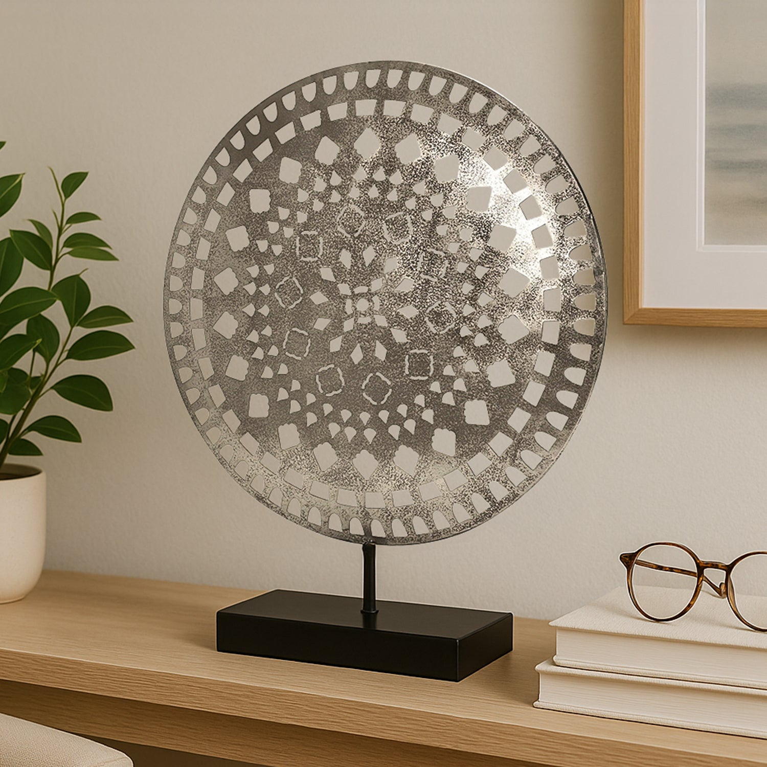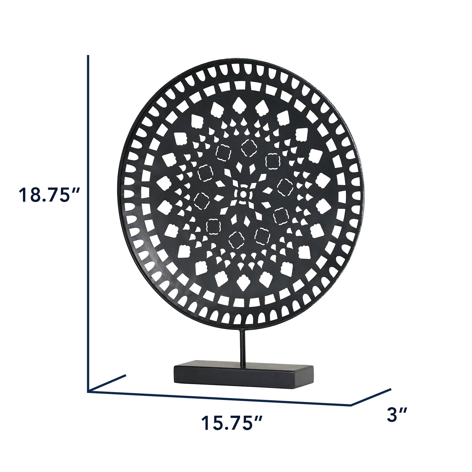 The shapes of this cutout pattern range from abstract floral to Moroccan tile inspired. A metal stem attached to a rectangular base allows this striking metal figurine to be freestanding without additional framing, mounting, or accessories. The base is weighted for stability and padded to protect any surface you place it on.