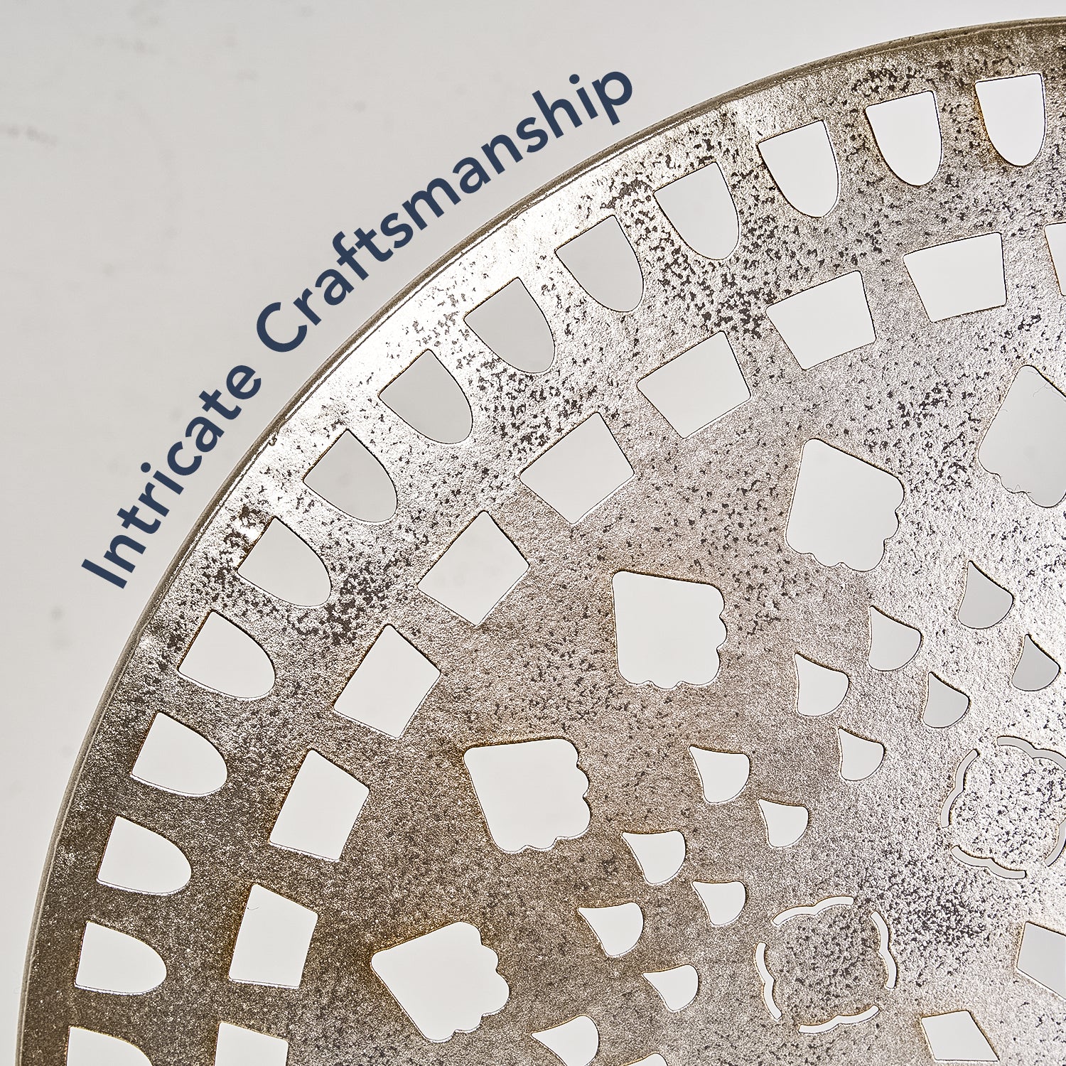 This gorgeous metal medallion is created by taking a sleek silver metal disc and using laser cutting technology to form an intricate, geometric pattern from the negative space.