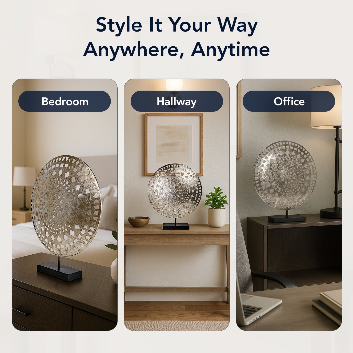 - TABLE TOP STAND - The free standing medallion decor is mounted on a matching stand for stable placement.