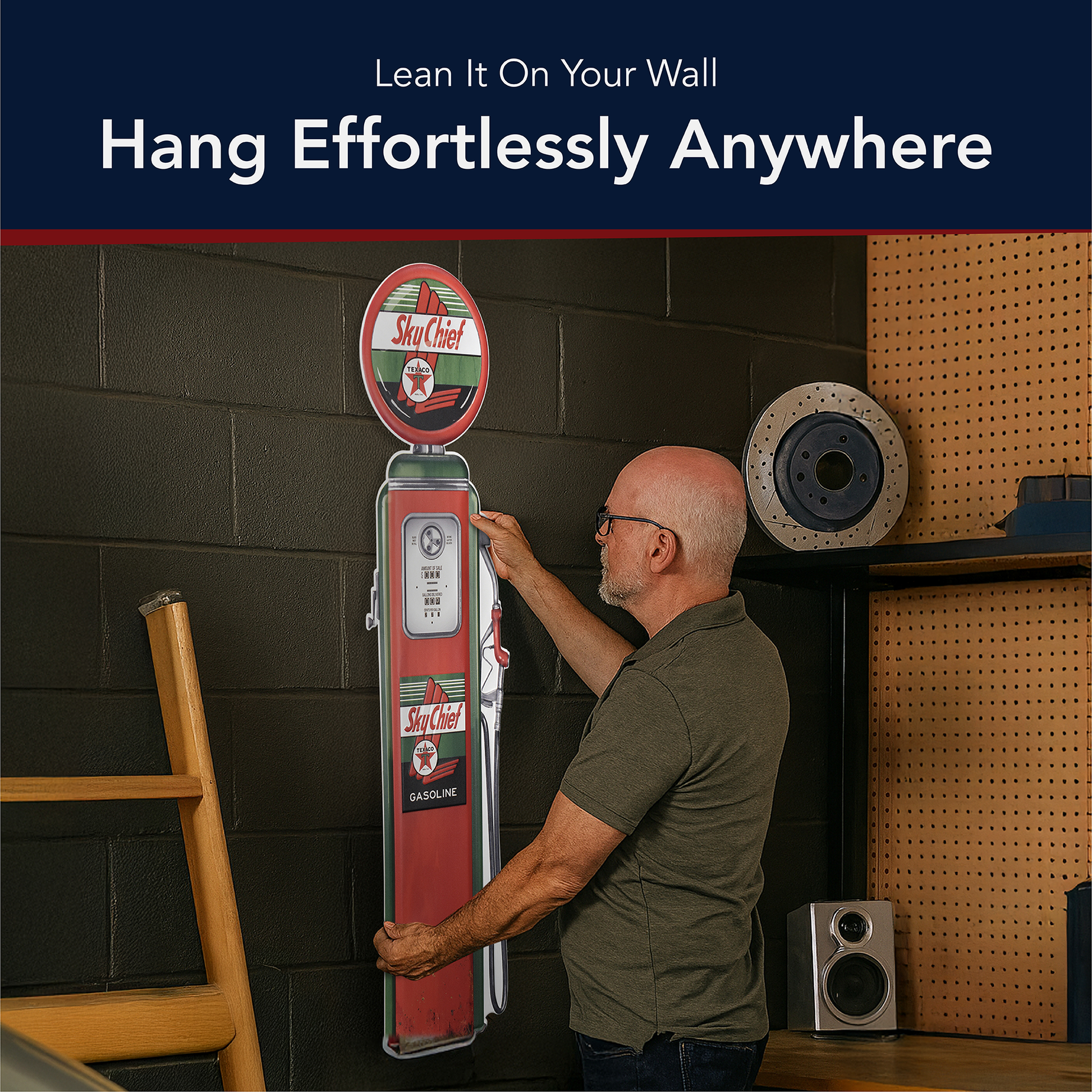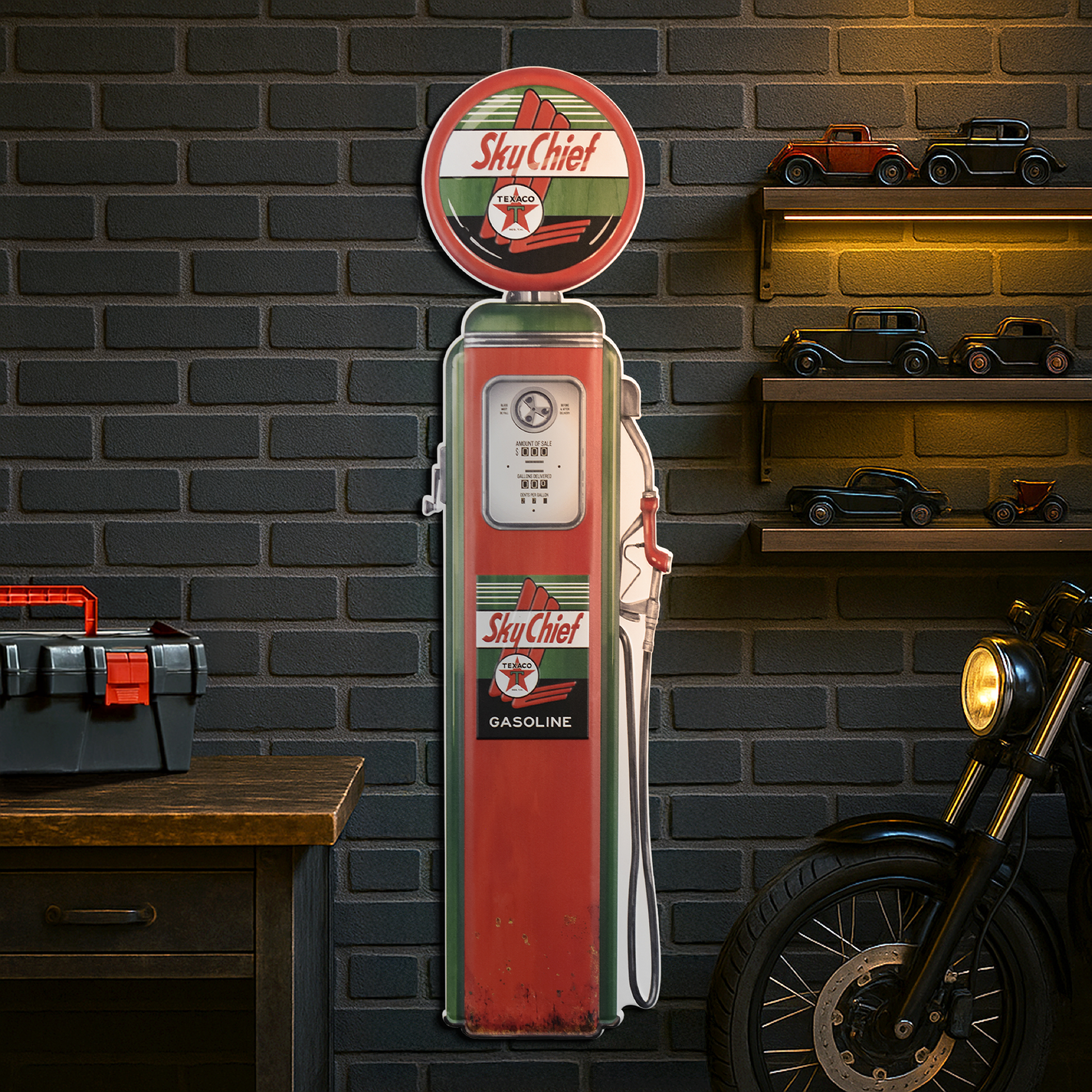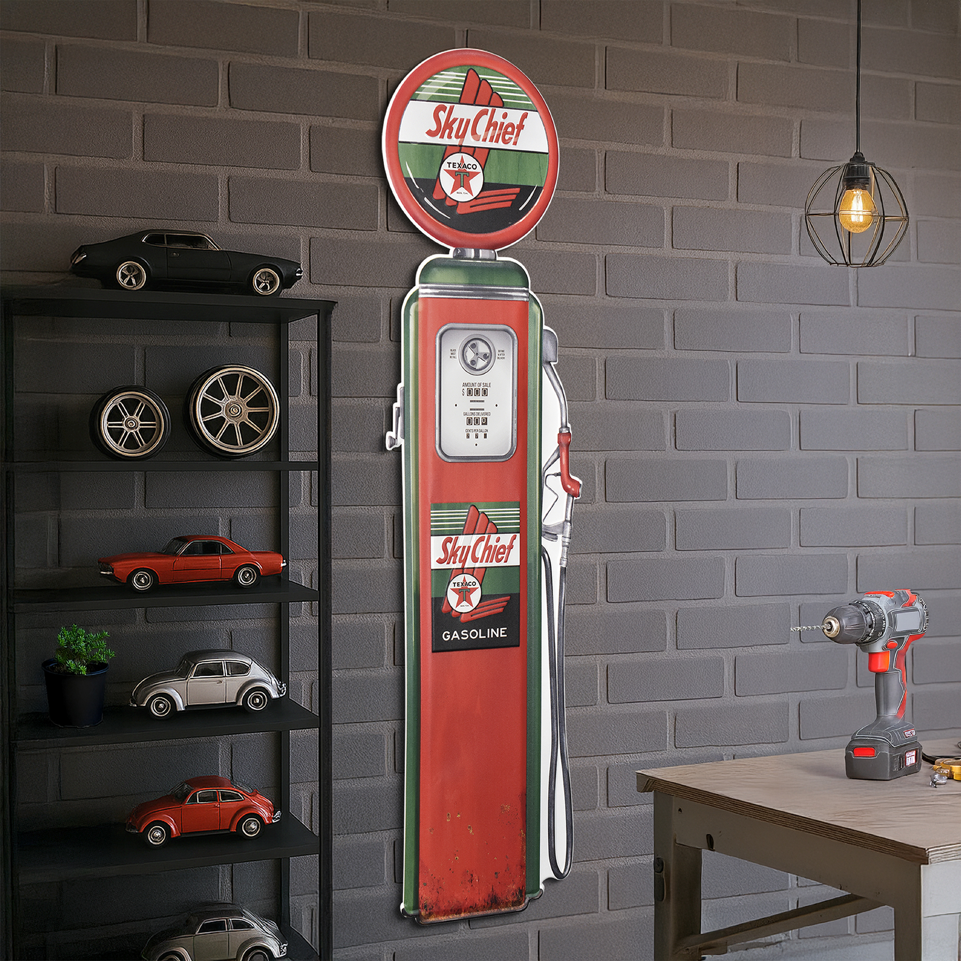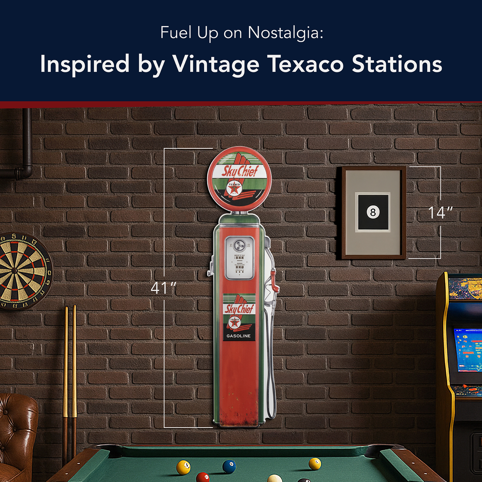 Fuel your decor with nostalgia using this Sky Chief Texaco Gas Pump Metal Sign by American Art Decor. Measuring 41" H x 10.5" W, this full-color wall art replicates a vintage Texaco Sky Chief gasoline pump, complete with the iconic red, green, and white color scheme, a bold Texaco "T" logo, and distressed, rusted detailing for authentic retro flair.Made from sturdy metal with weathered finishes, this gas station wall sign adds instant Americana charm and industrial character to any room. A vintage-style globe topper reading "Sky Chief" crowns the piece, while realistic pump details, a fuel hose, and classic price meter elevate its visual impact. The perfect throwback decor for classic car lovers, collectors, and anyone who appreciates roadside history.