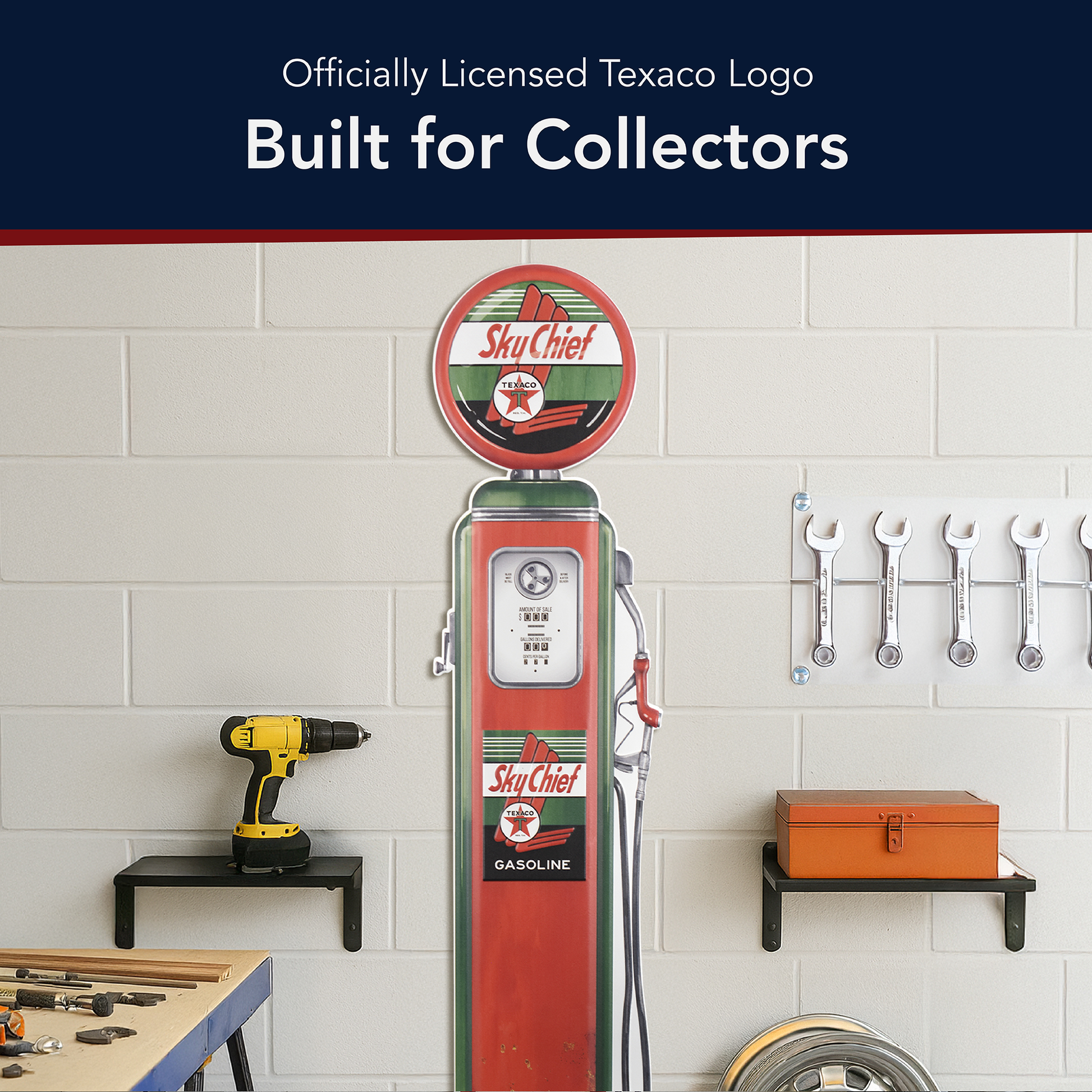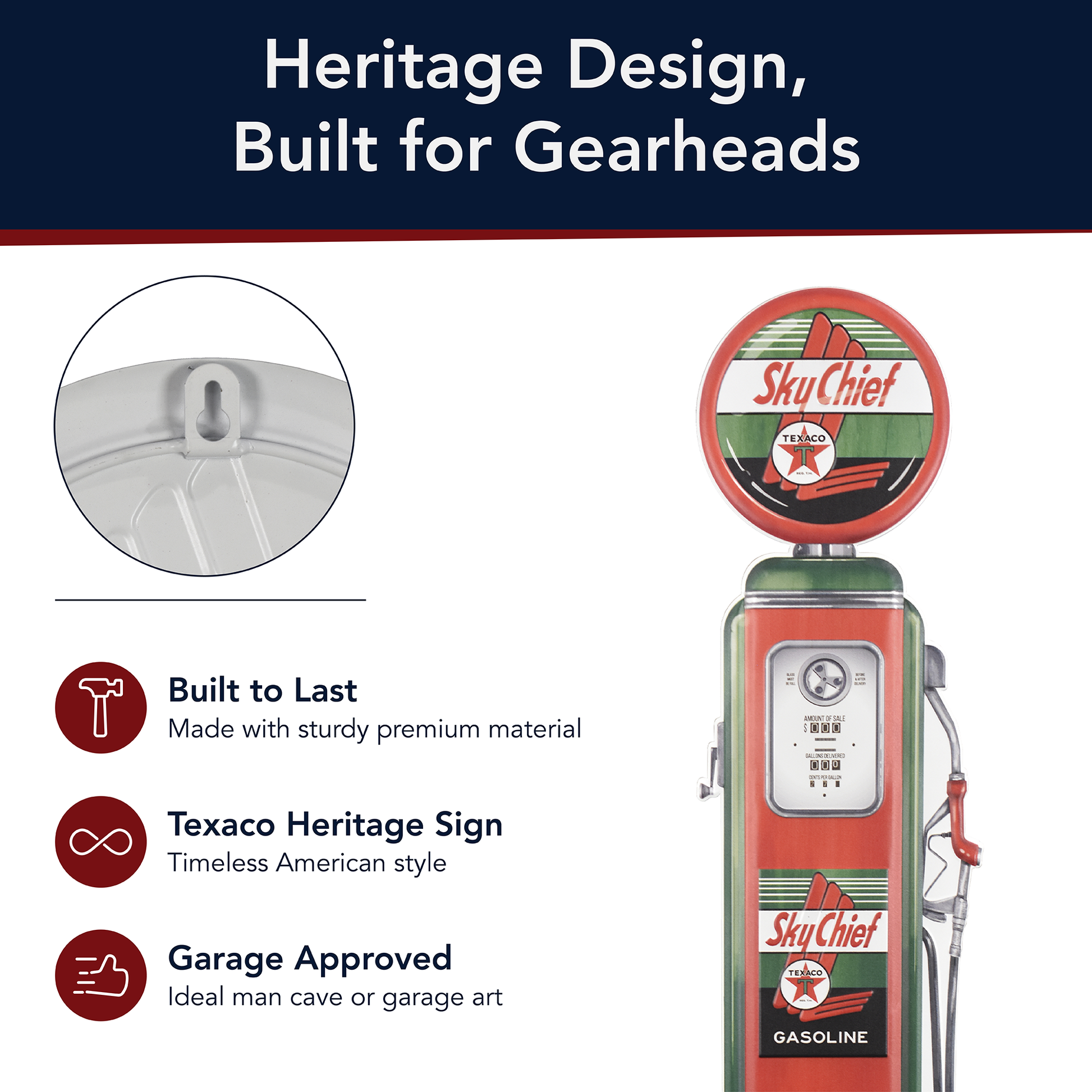 - VINTAGE TEXACO DESIGN - Features the Sky Chief gasoline pump in red, green, and white, with the iconic Texaco "T" and distressed finish for classic retro appeal.