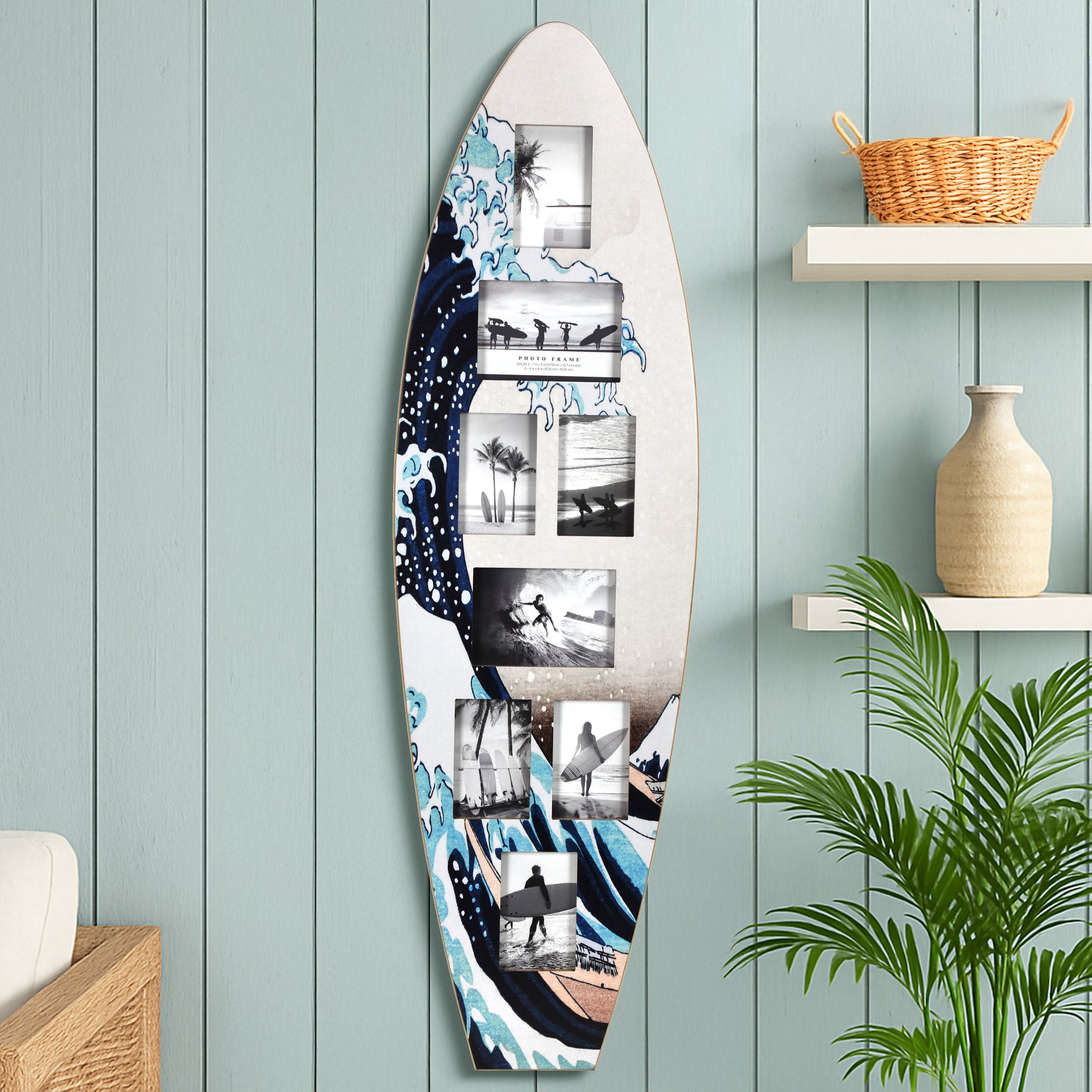 Transform your walls into a seaside gallery with the American Art Decor Surfboard Photo Collage Wall Decor. This unique surfboard-shaped photo frame marries function and artistry - combining beach, surf, and Japanese print influences to deliver a statement piece.This striking wall art features a stylized rendition of the Great Wave off Kanagawa, rendered in deep navy, cerulean blues, and crisp white foam. The design flows across the left side of the board, while the right side offers a lighter, textured backdrop for your images. With eight photo openings (in mixed rectangular sizes), you can arrange snapshots of surfing adventures, beach days, palm trees, and ocean horizons. The black & white photos in the mockups highlight the striking contrast and timeless aesthetic.