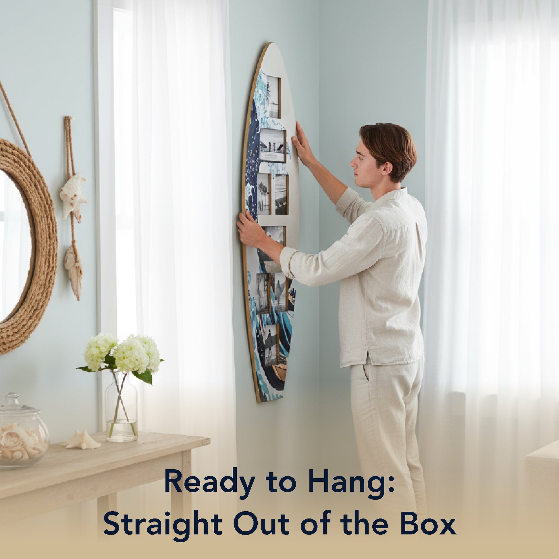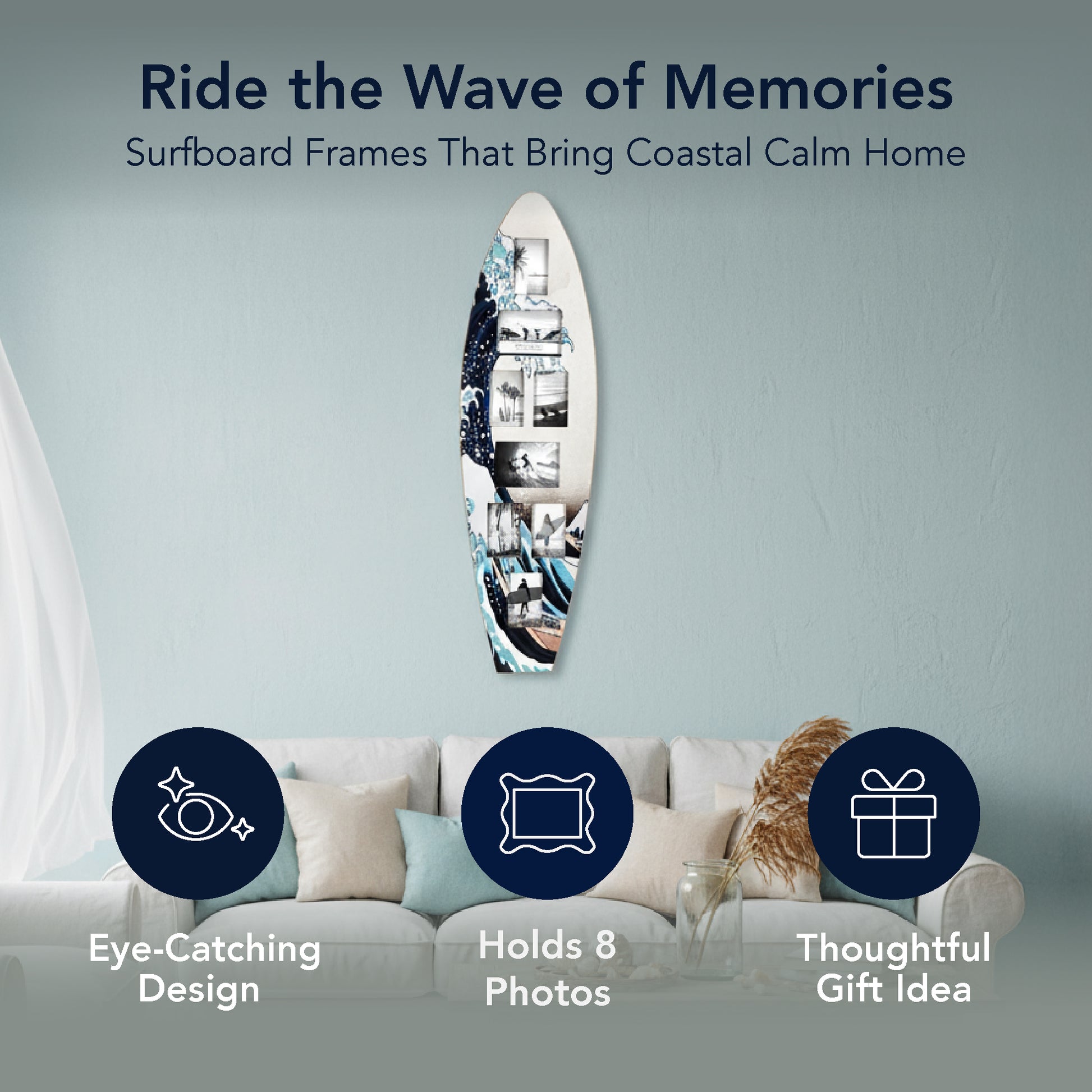 - SHOWCASE 8 BELOVED MEMORIES IN STYLISH SURFBOARD FORM - Display your favorite moments in one striking piece of wall decor - this surfboard-shaped collage frame holds 8 photos in mixed sizes, letting you spotlight surf, beach, travel, or family scenes in a cohesive coastal gallery.